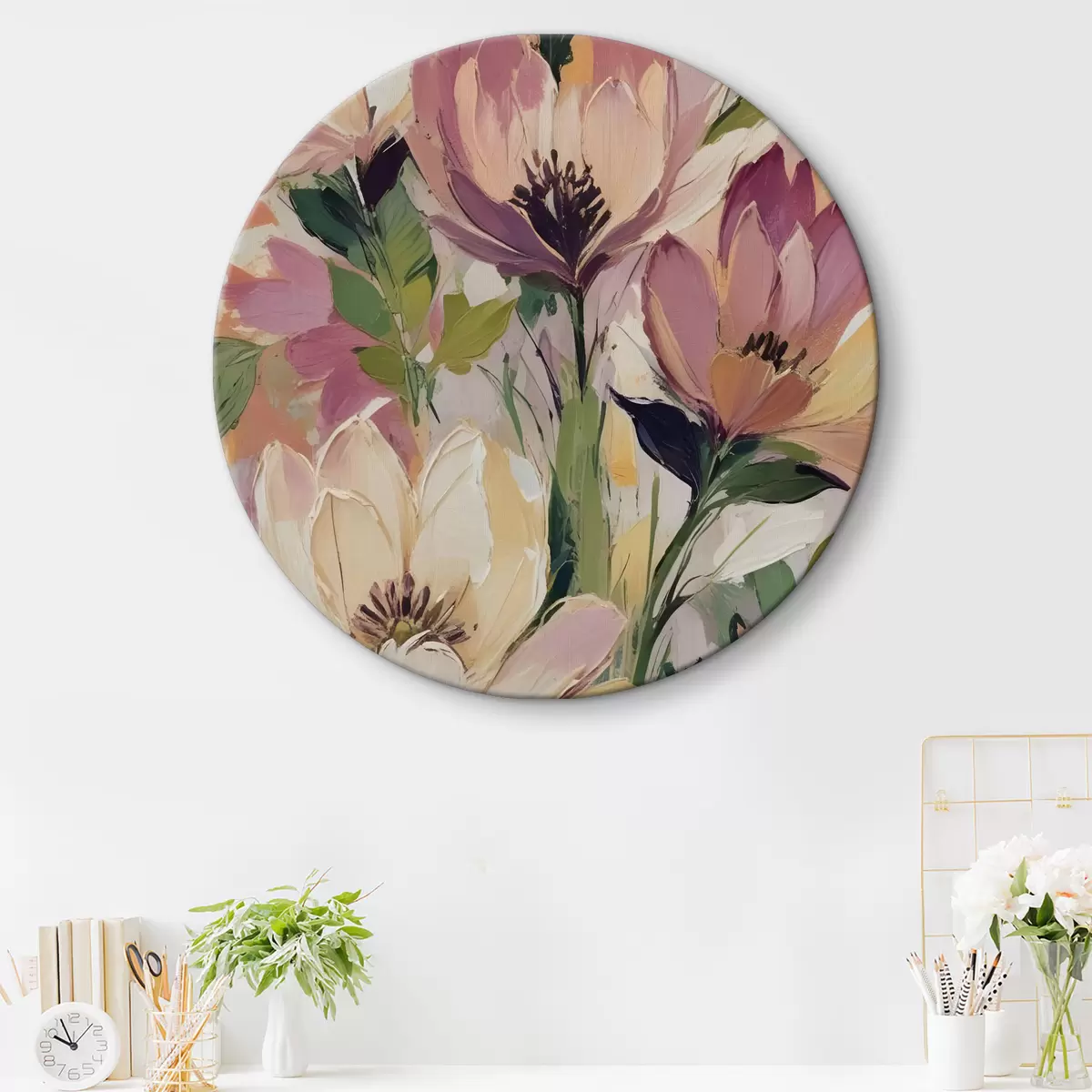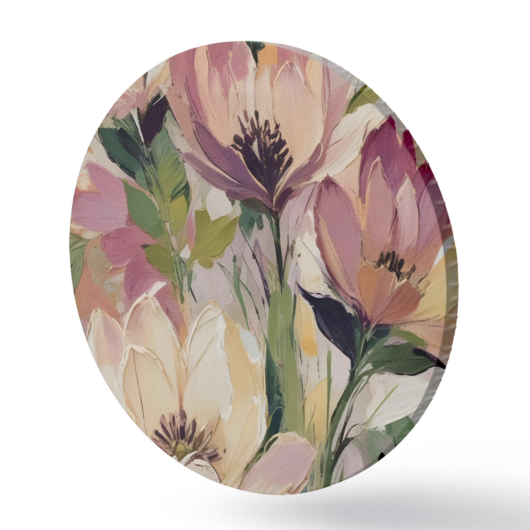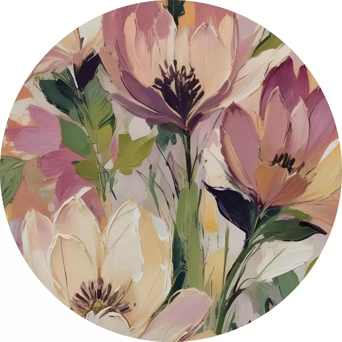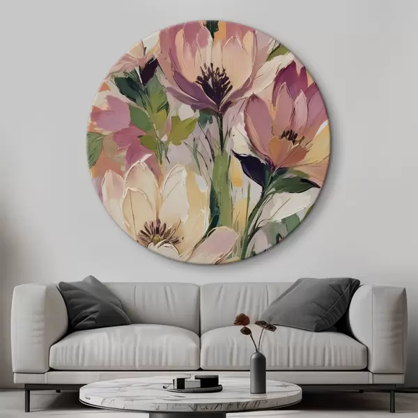 Tableaux ronds Une composition florale vibrante avec de grandes fleurs colorées dans les tons de rose, pêche et jaune r40609