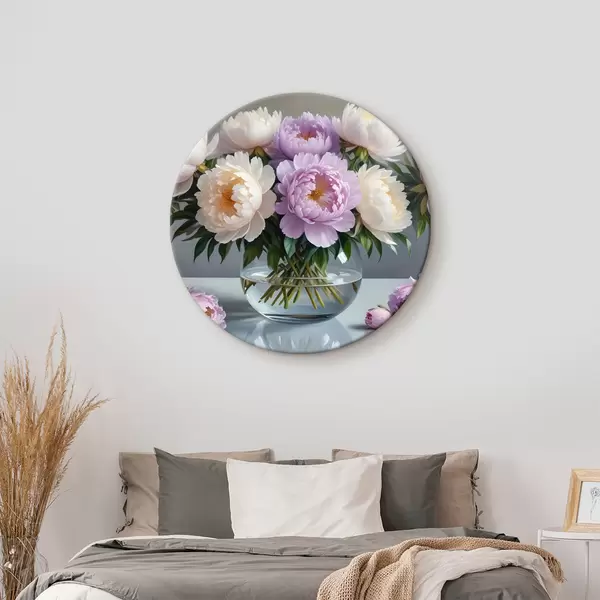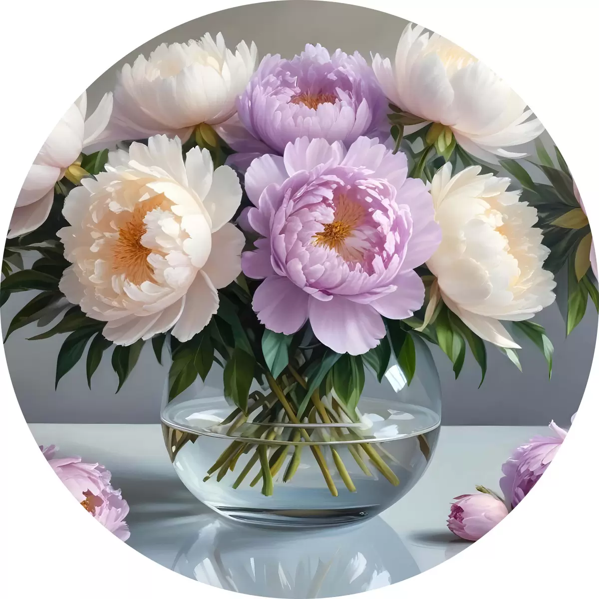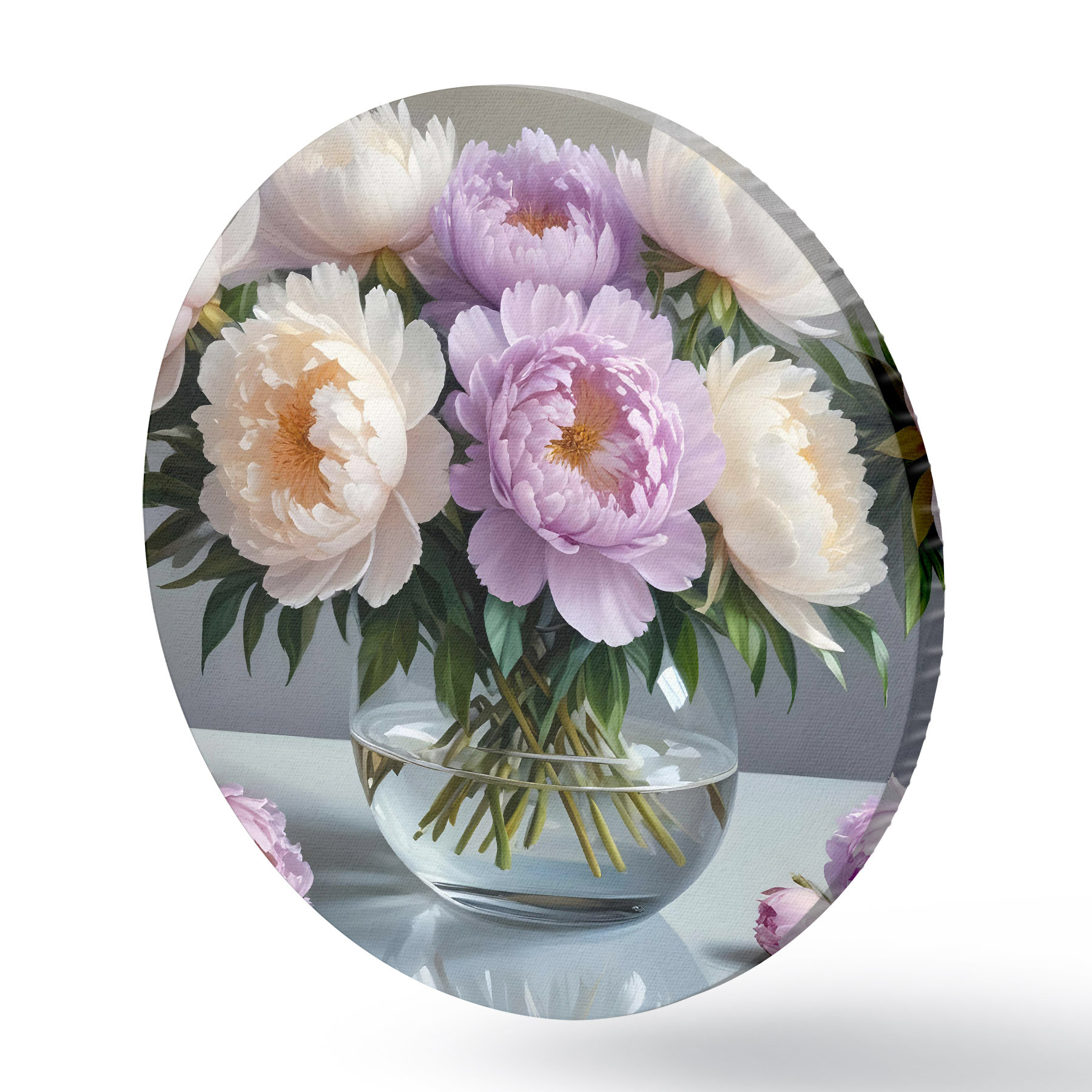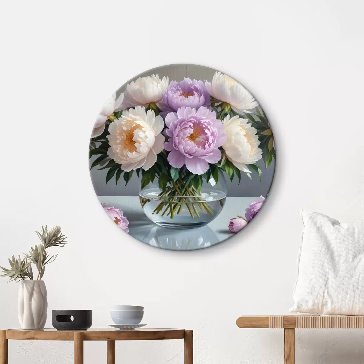 Tableaux ronds Un bouquet de grandes pivoines luxuriantes blanches et roses dans un vase en verre sur un fond gris r40610