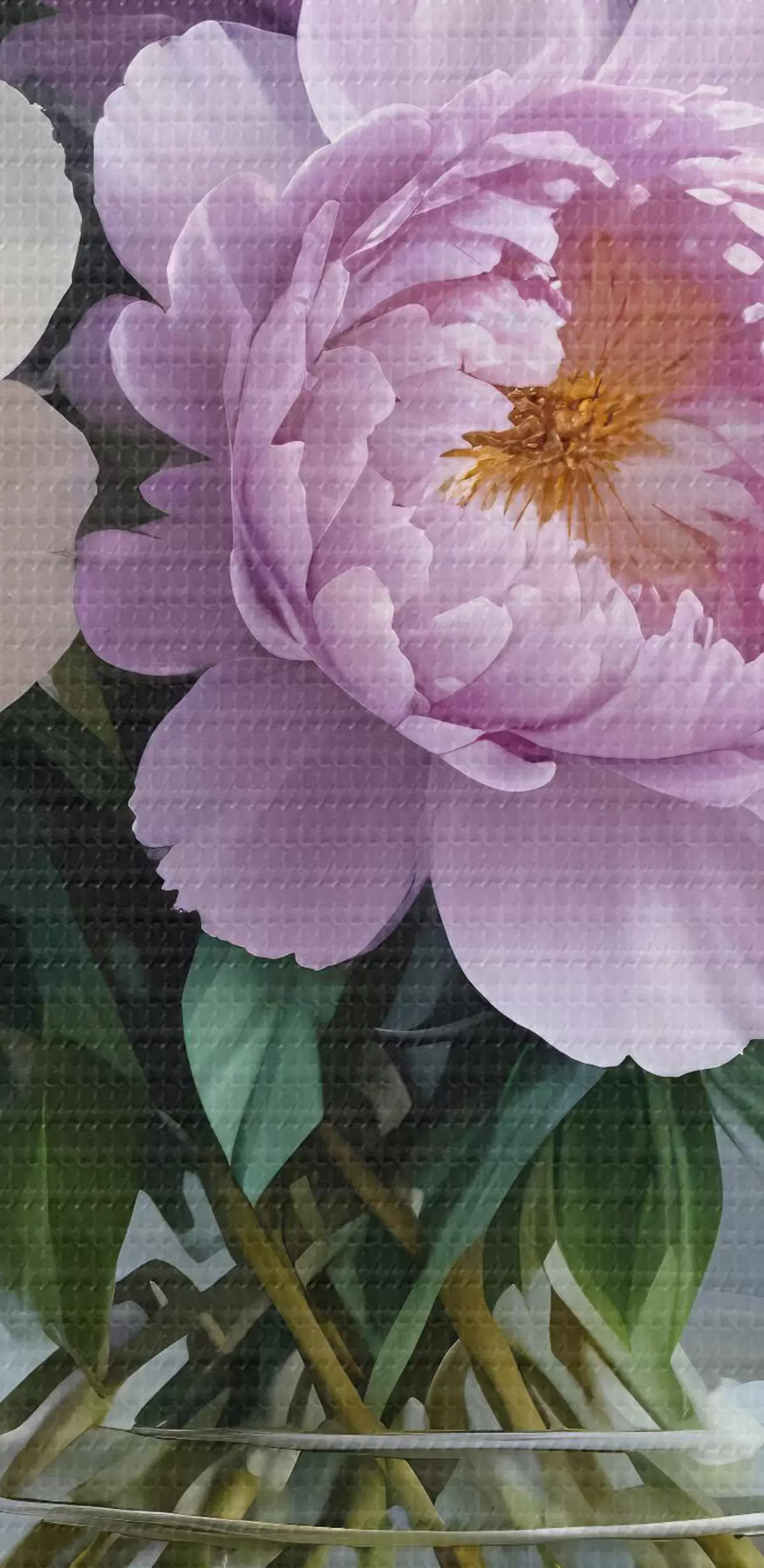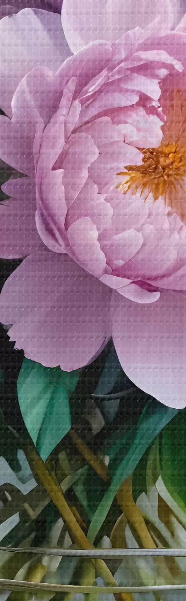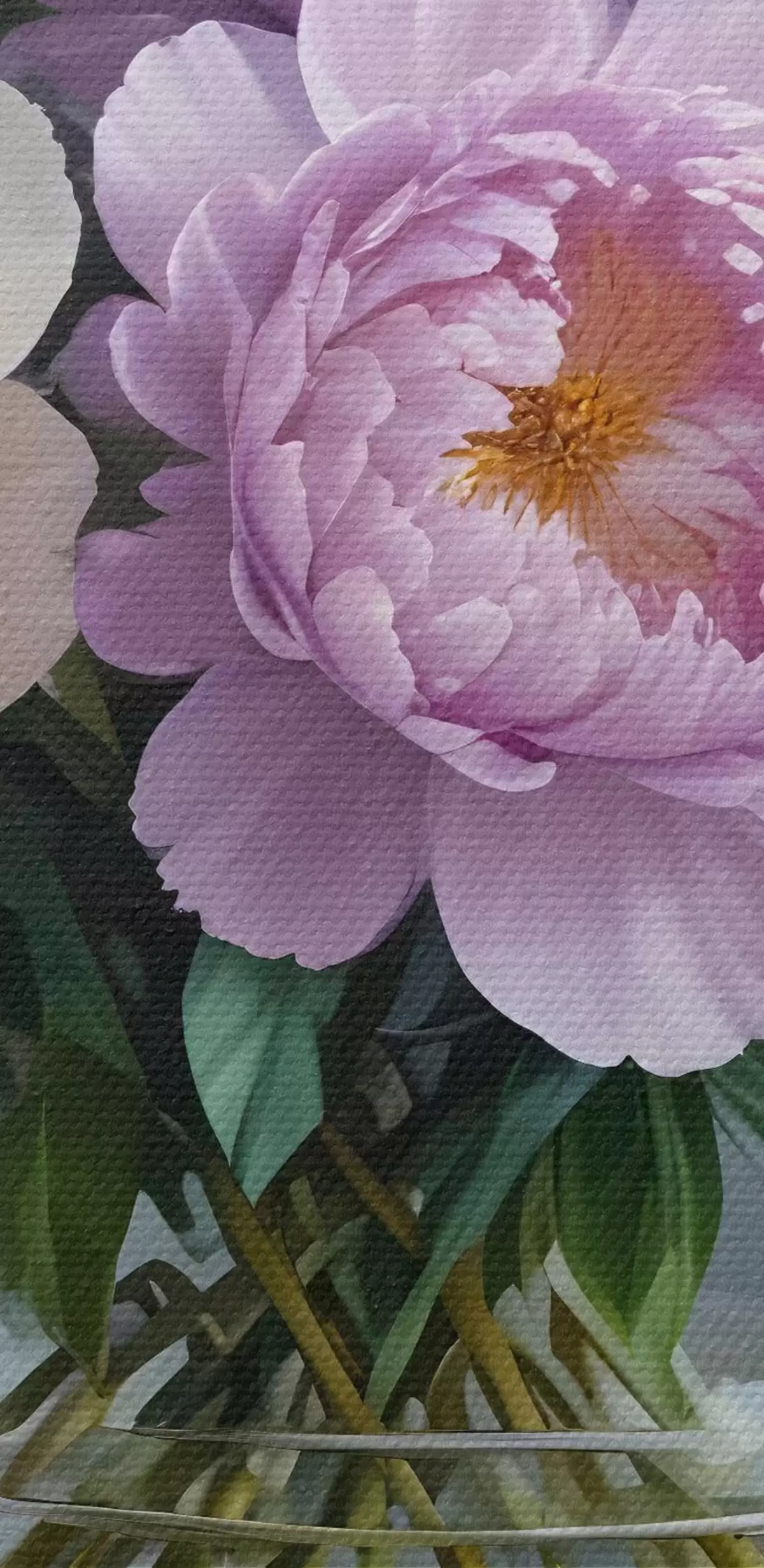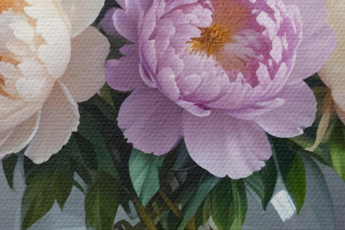 Image Un bouquet de grandes pivoines luxuriantes blanches et roses dans un vase en verre sur un fond gris Nr r40610