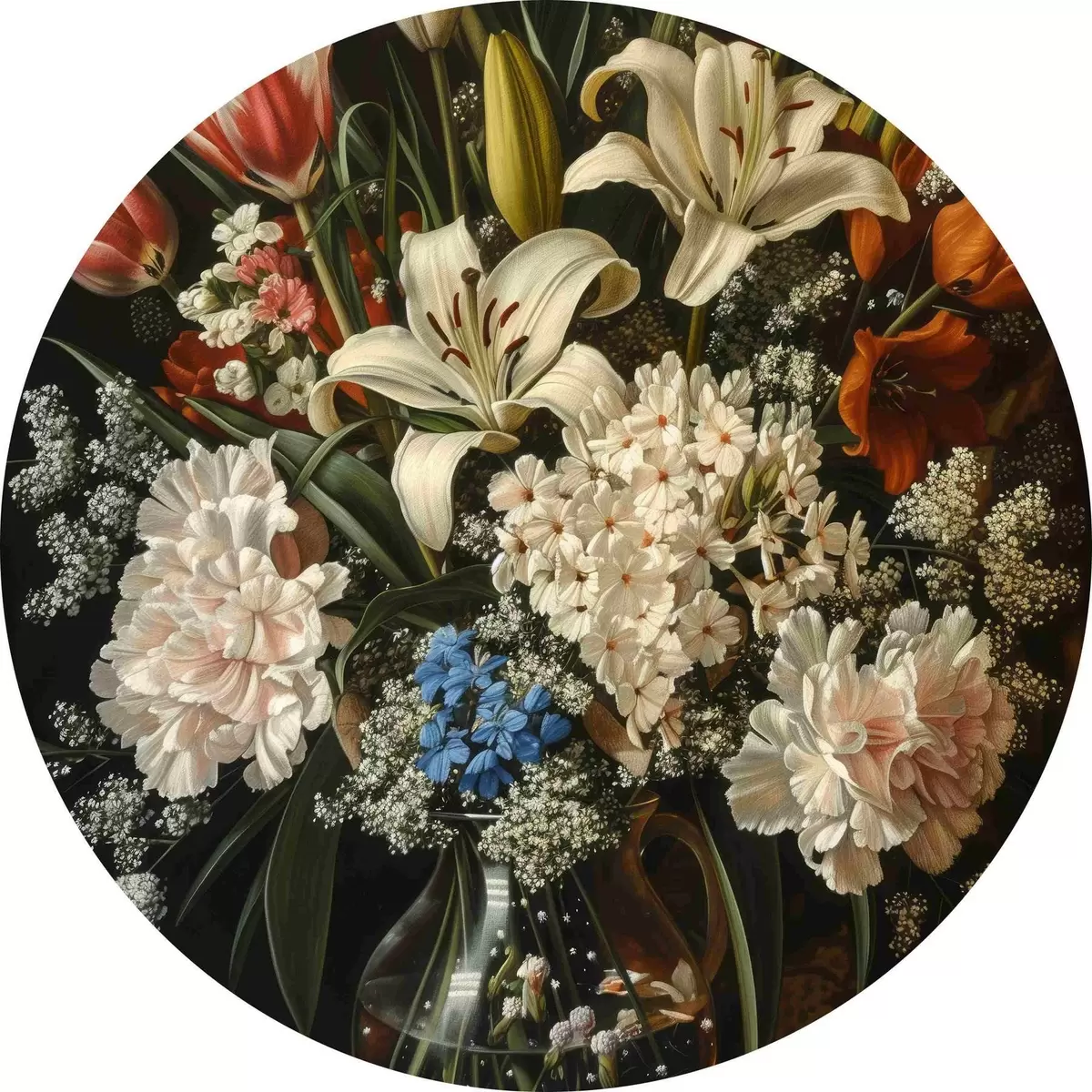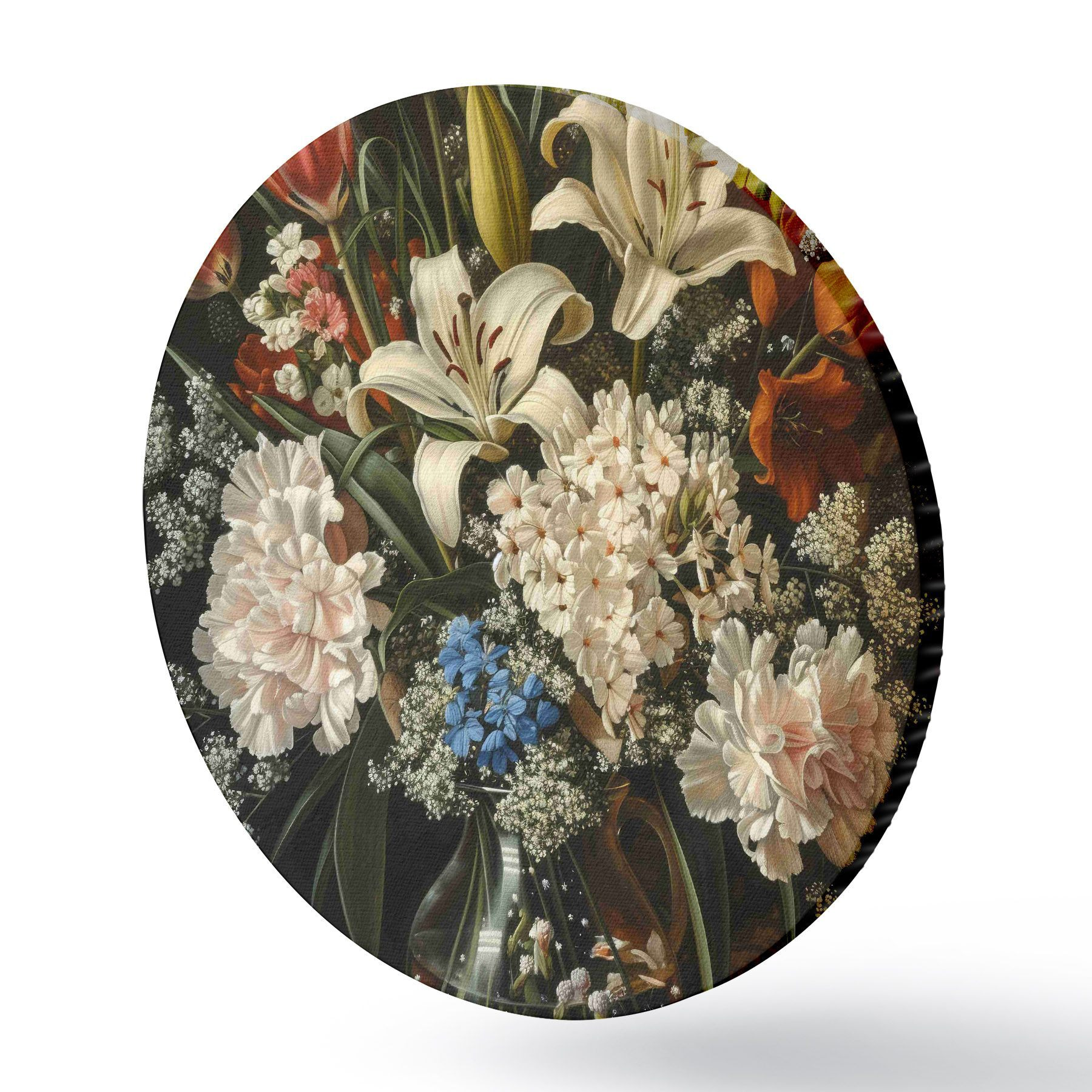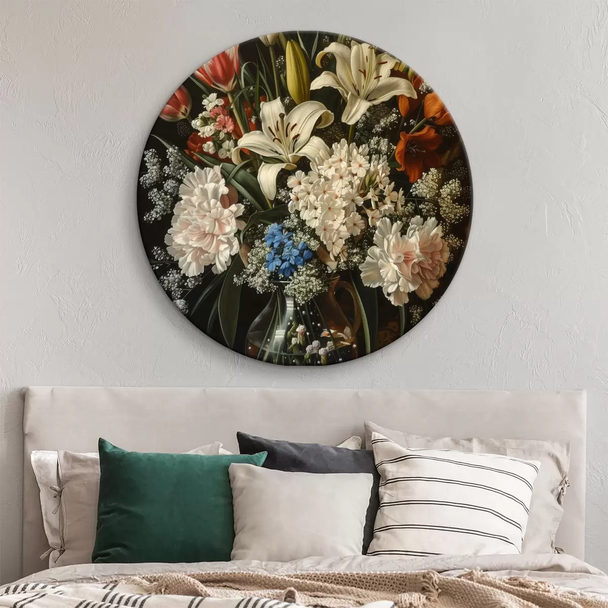 Tableaux ronds Nature morte baroque avec un vase rempli de tulipes, d'œillets et de jacinthes, imitation d'une peinture à l'huile r40659