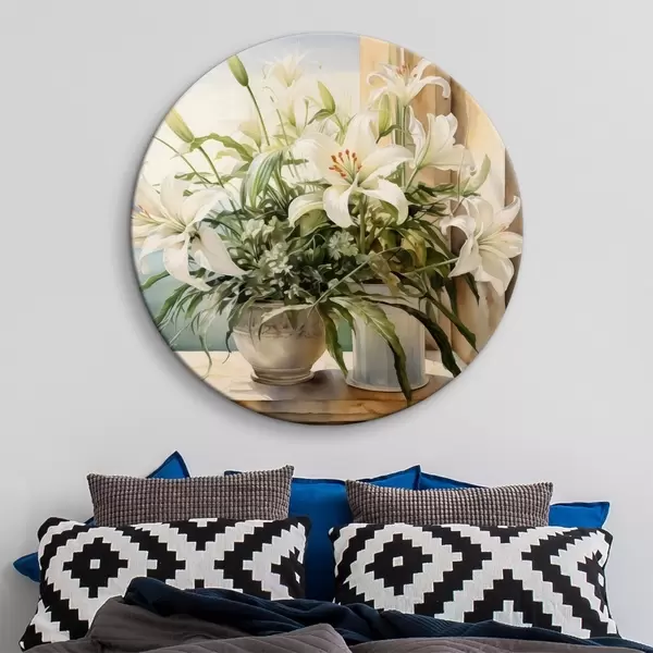 Tableaux ronds Lys blancs dans un vase sur le balcon avec vue sur la mer et les montagnes aquarelle r40682