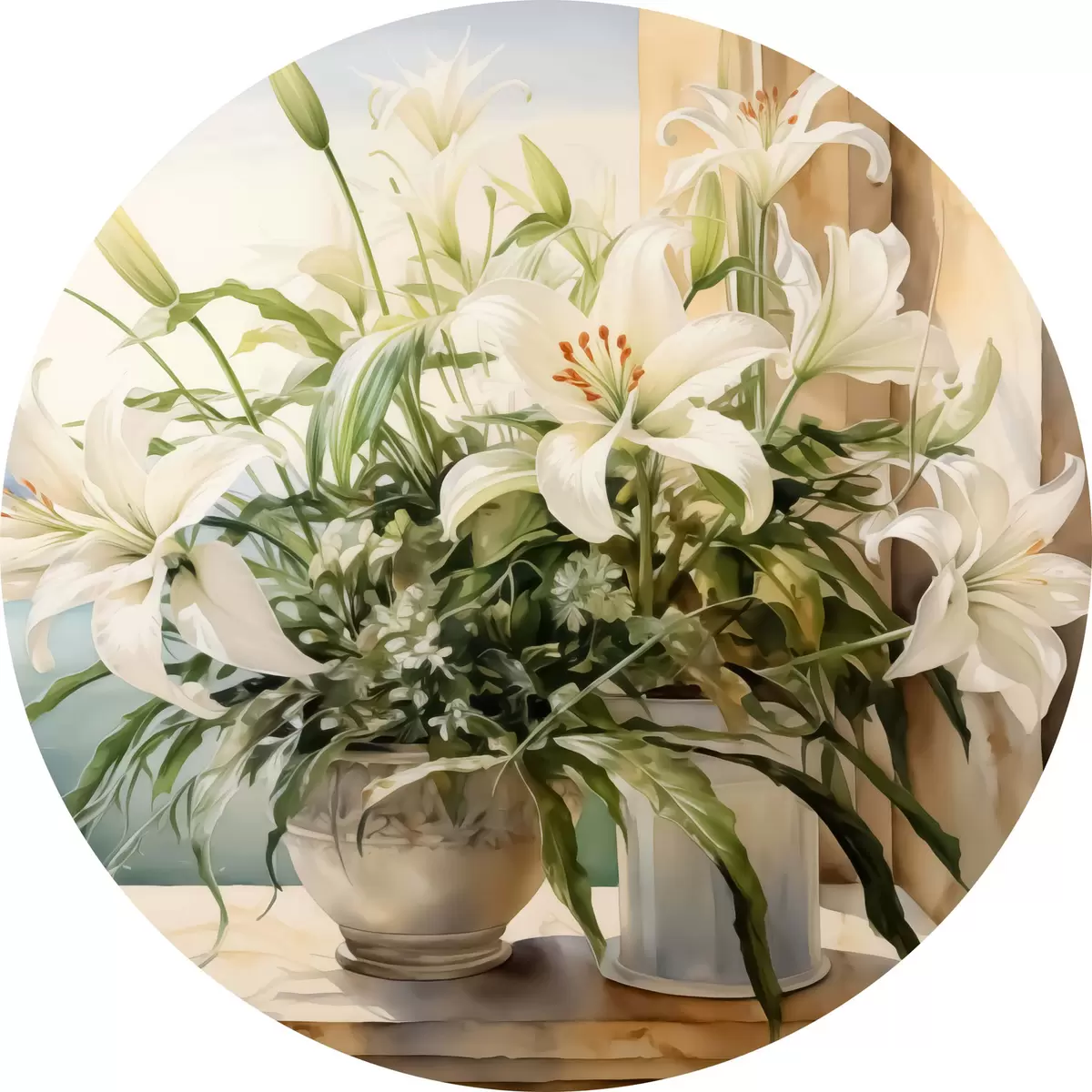 Tableaux ronds Lys blancs dans un vase sur le balcon avec vue sur la mer et les montagnes aquarelle r40682