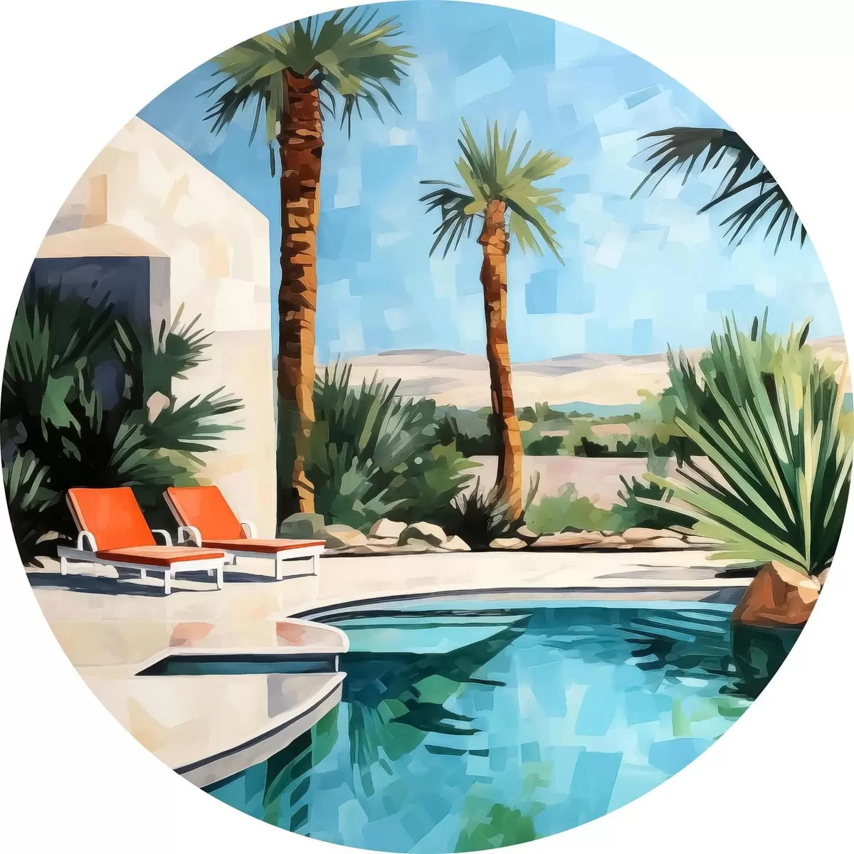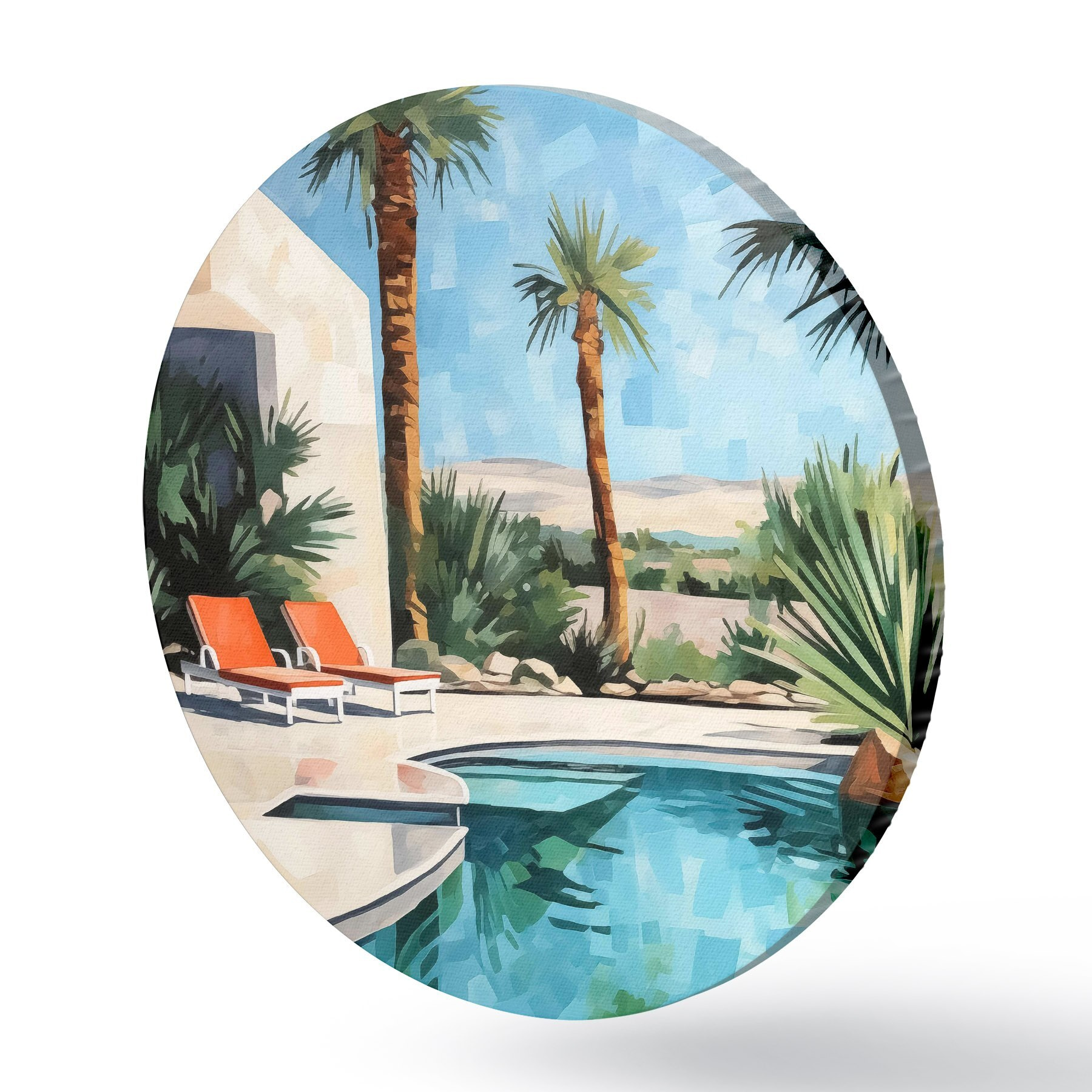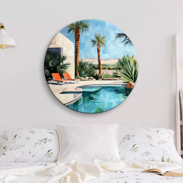 Tableaux ronds Palmiers près de l'hôtel avec une piscine près des rochers, couleurs bleu, vert, rouge r40748