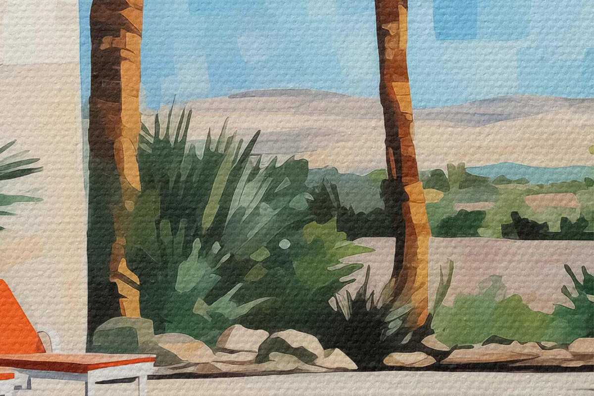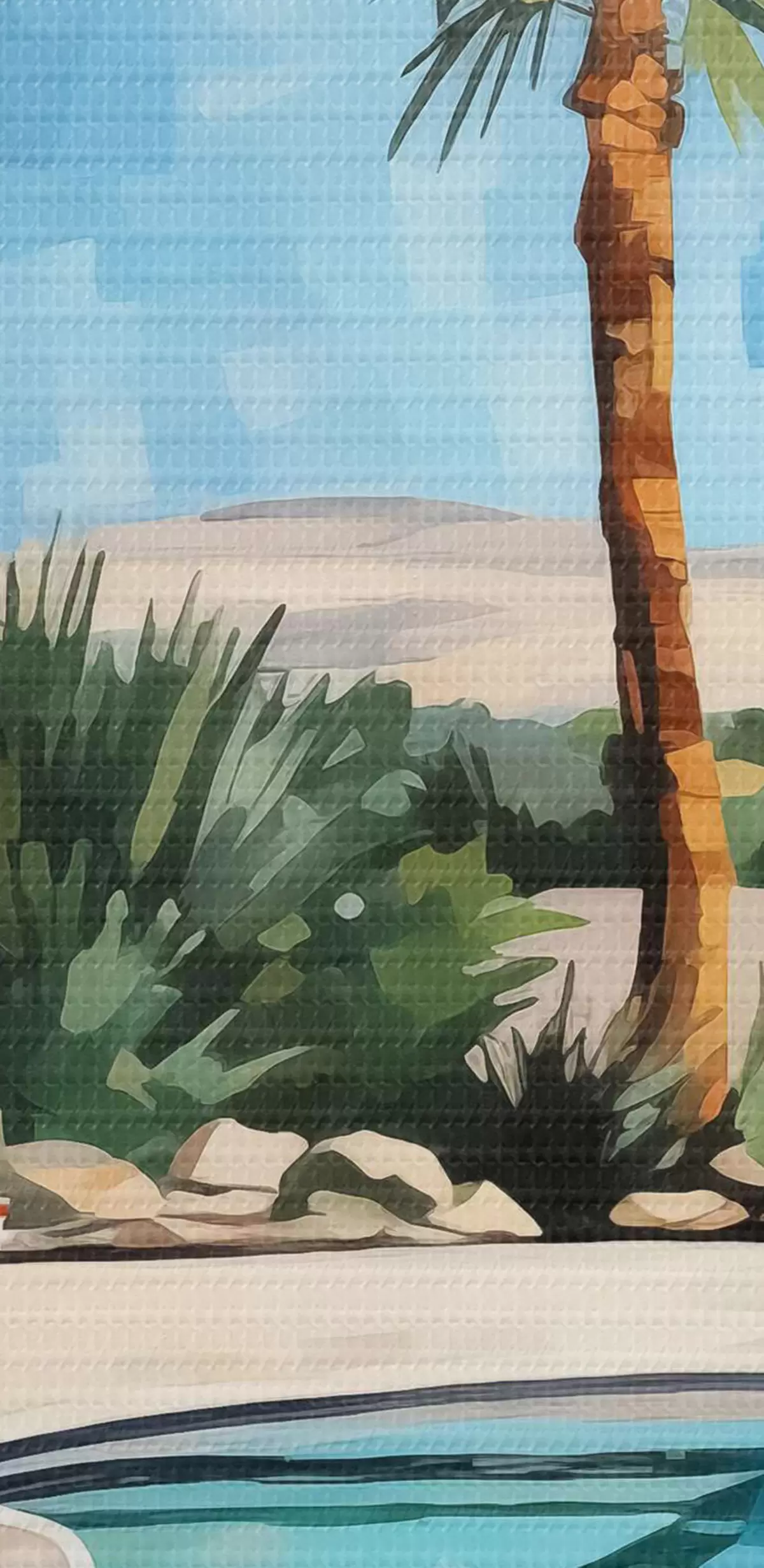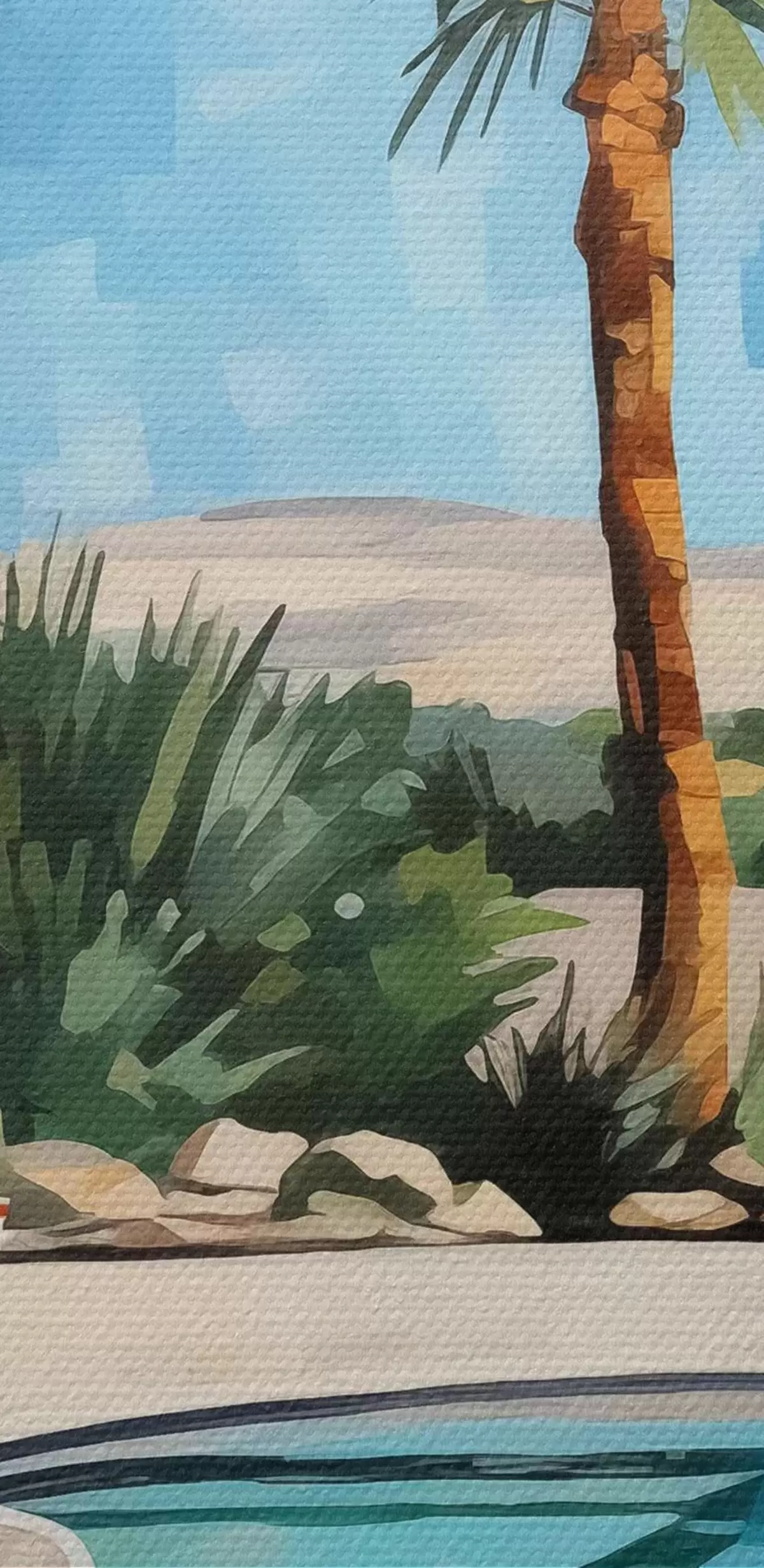 Image Palmiers près de l'hôtel avec une piscine près des rochers, couleurs bleu, vert, rouge Nr r40748