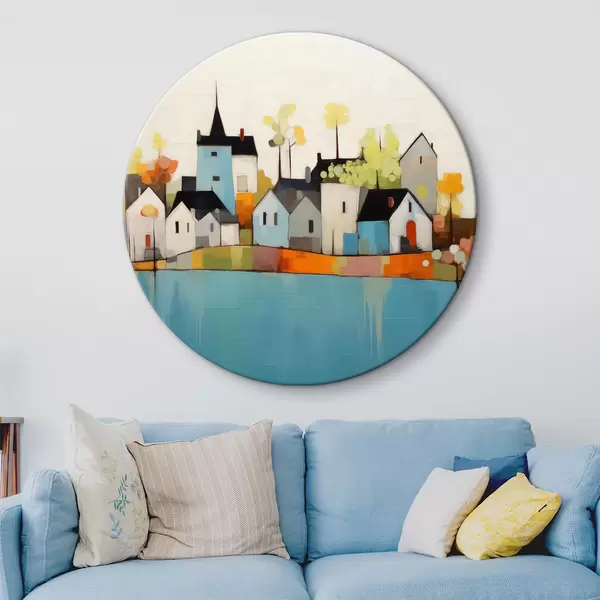 Tableaux ronds Ville abstraite et maisons, couleurs bleu, jaune, rouge r40751