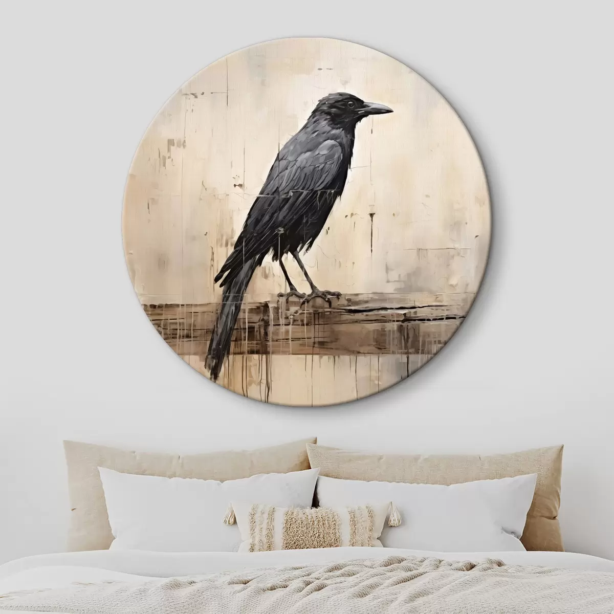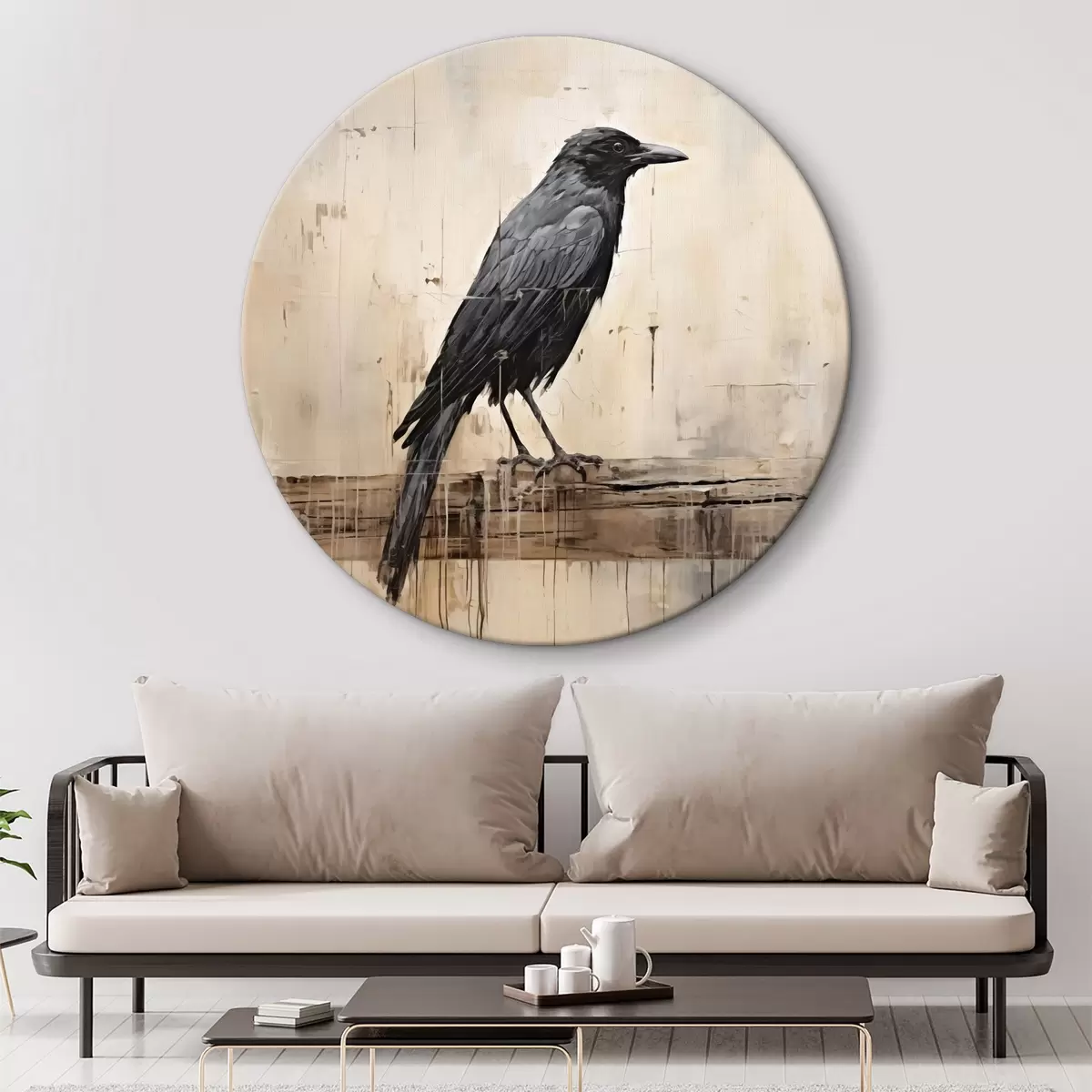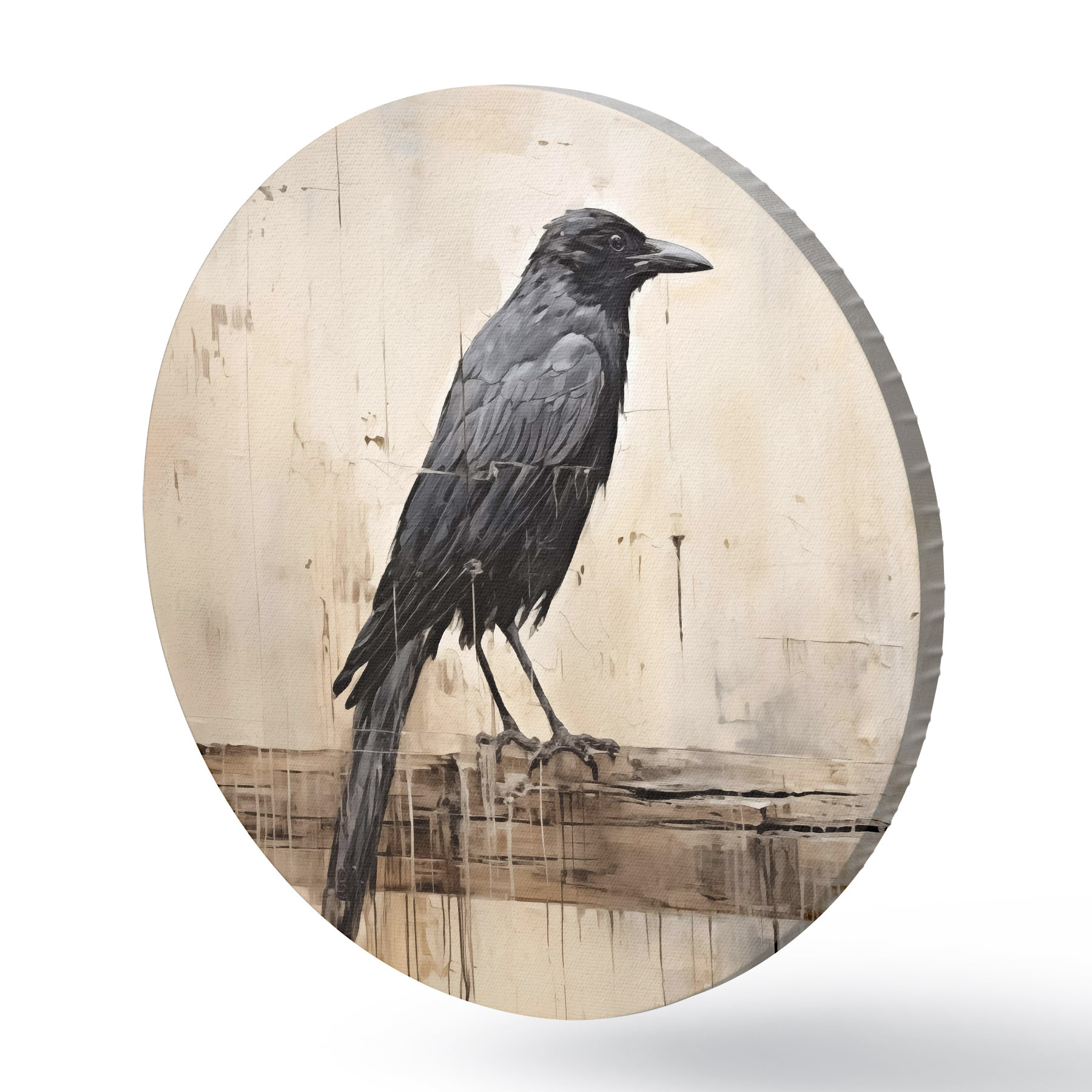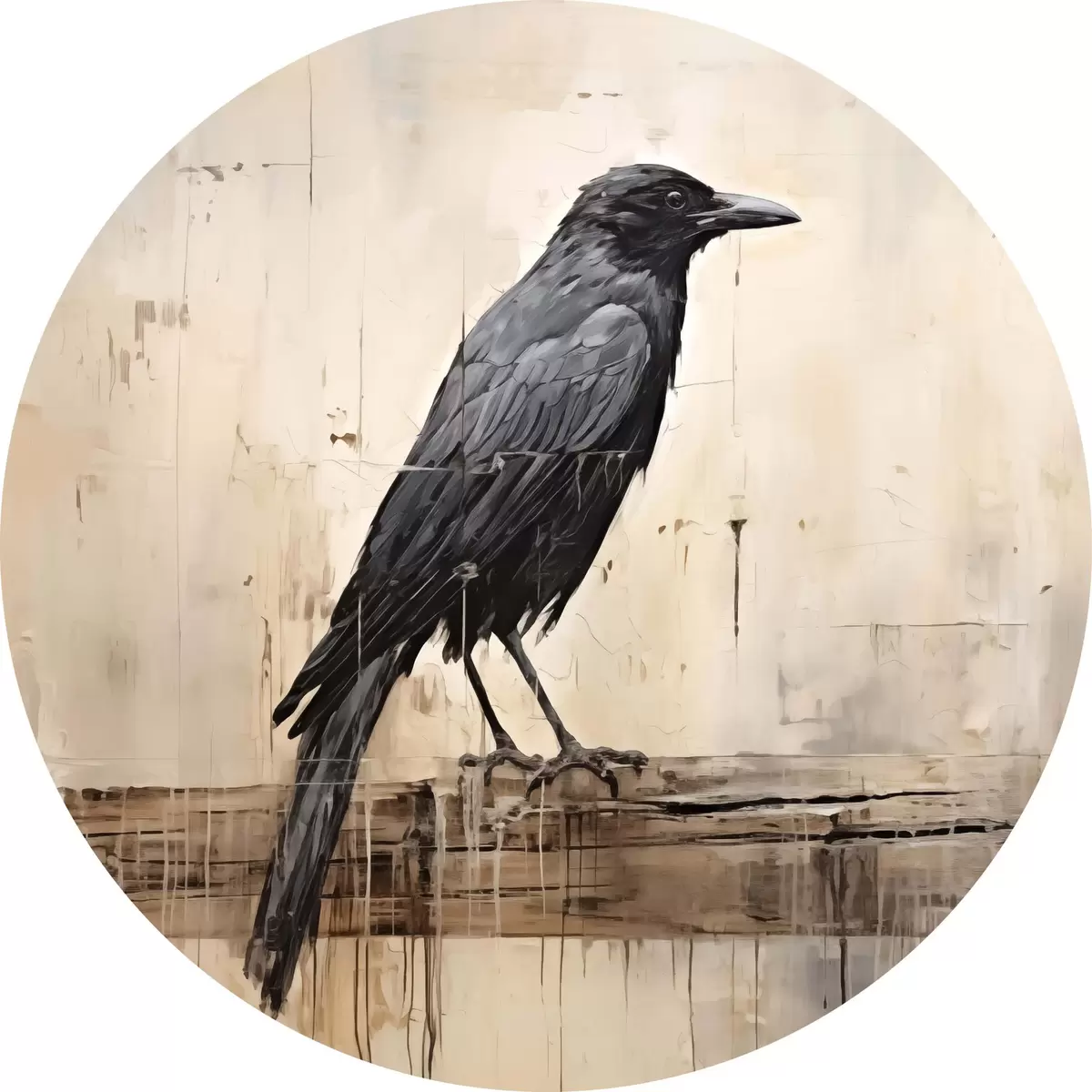 Tableaux ronds Corbeau noir assis sur un tronc d'arbre sur un fond abstrait r40808