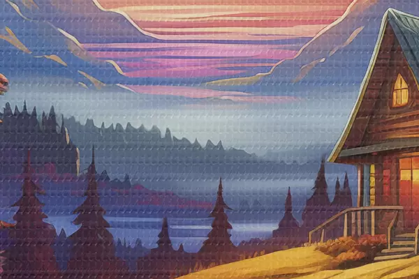 Image Paysage fantaisiste avec montagnes et maison en bois Nr r40940