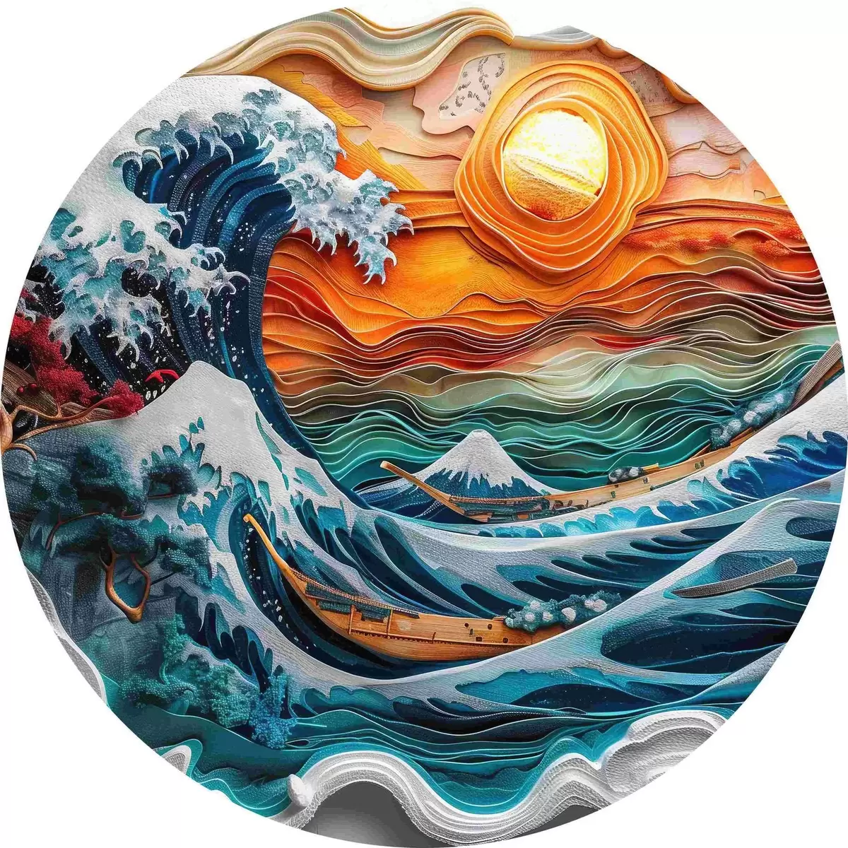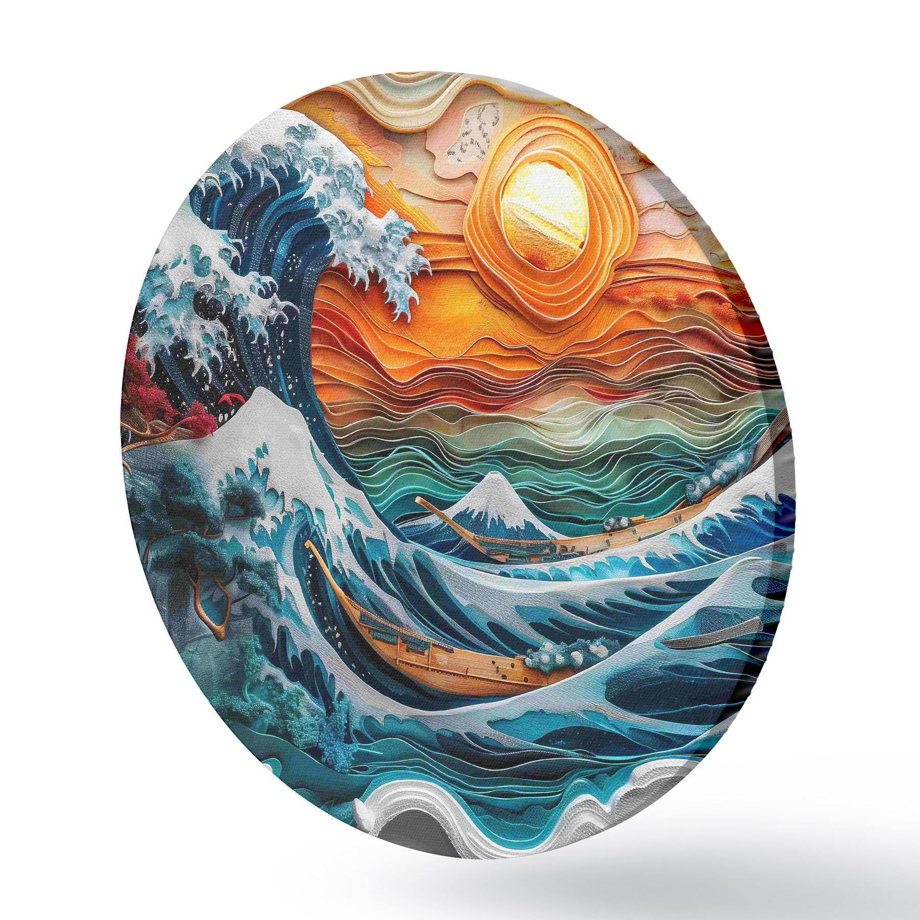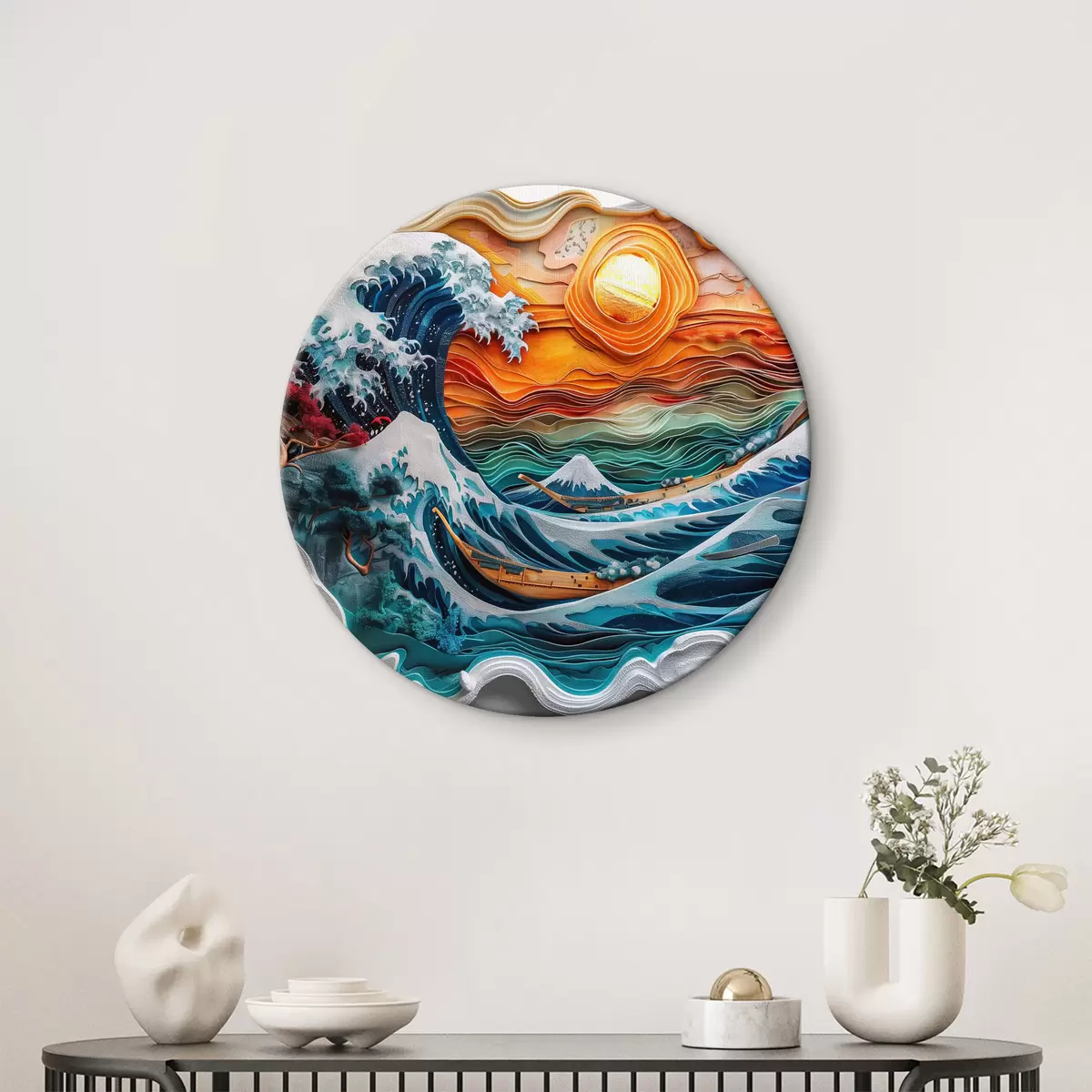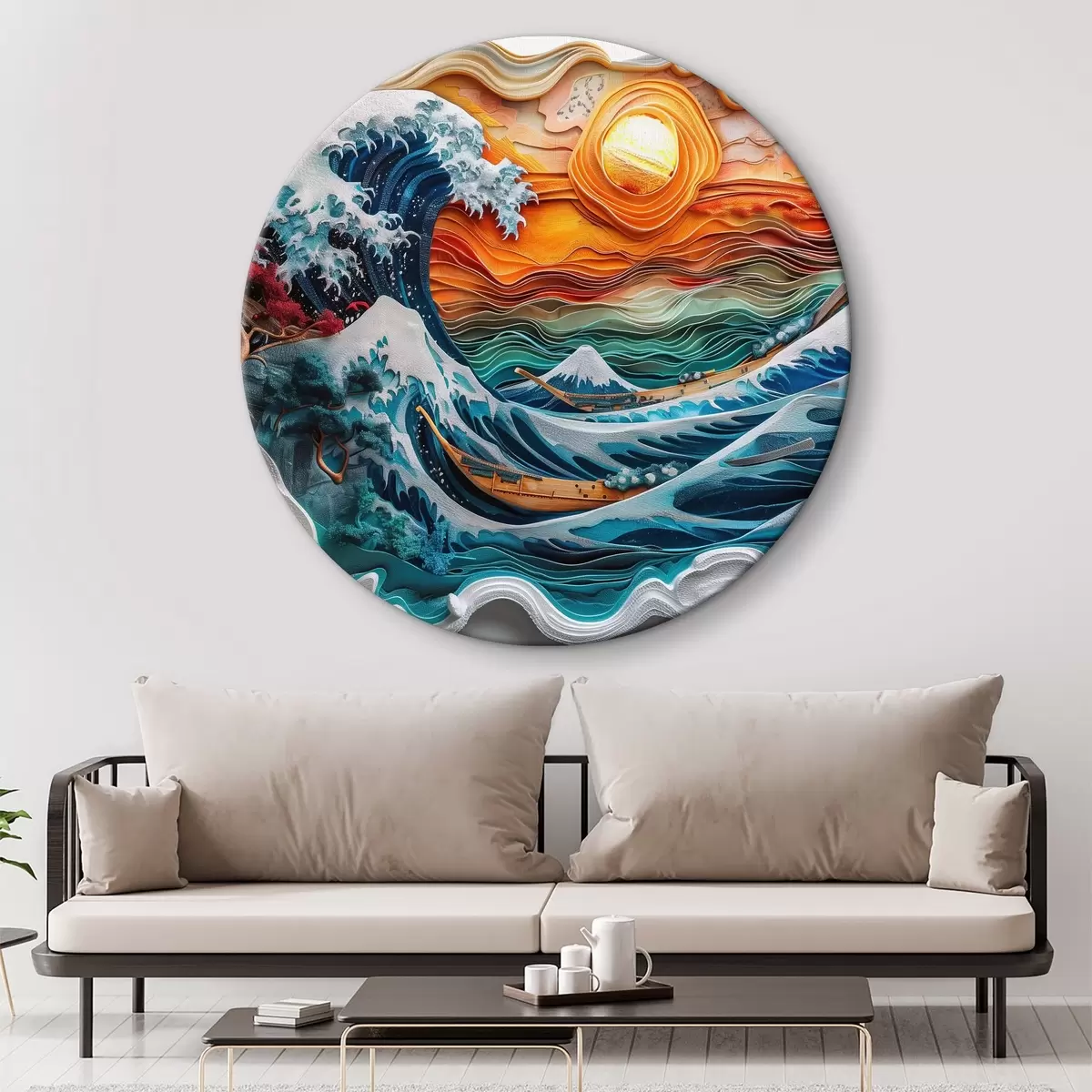 Tableaux ronds Imitation d'un bas-relief : un océan déchaîné avec des bateaux et le soleil r40976