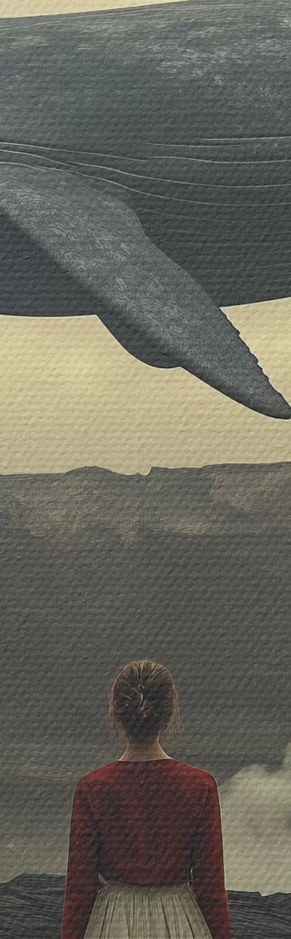 Image Fille sur la lave avec une grande baleine volante dans le ciel Nr r40986