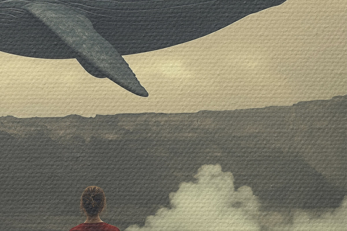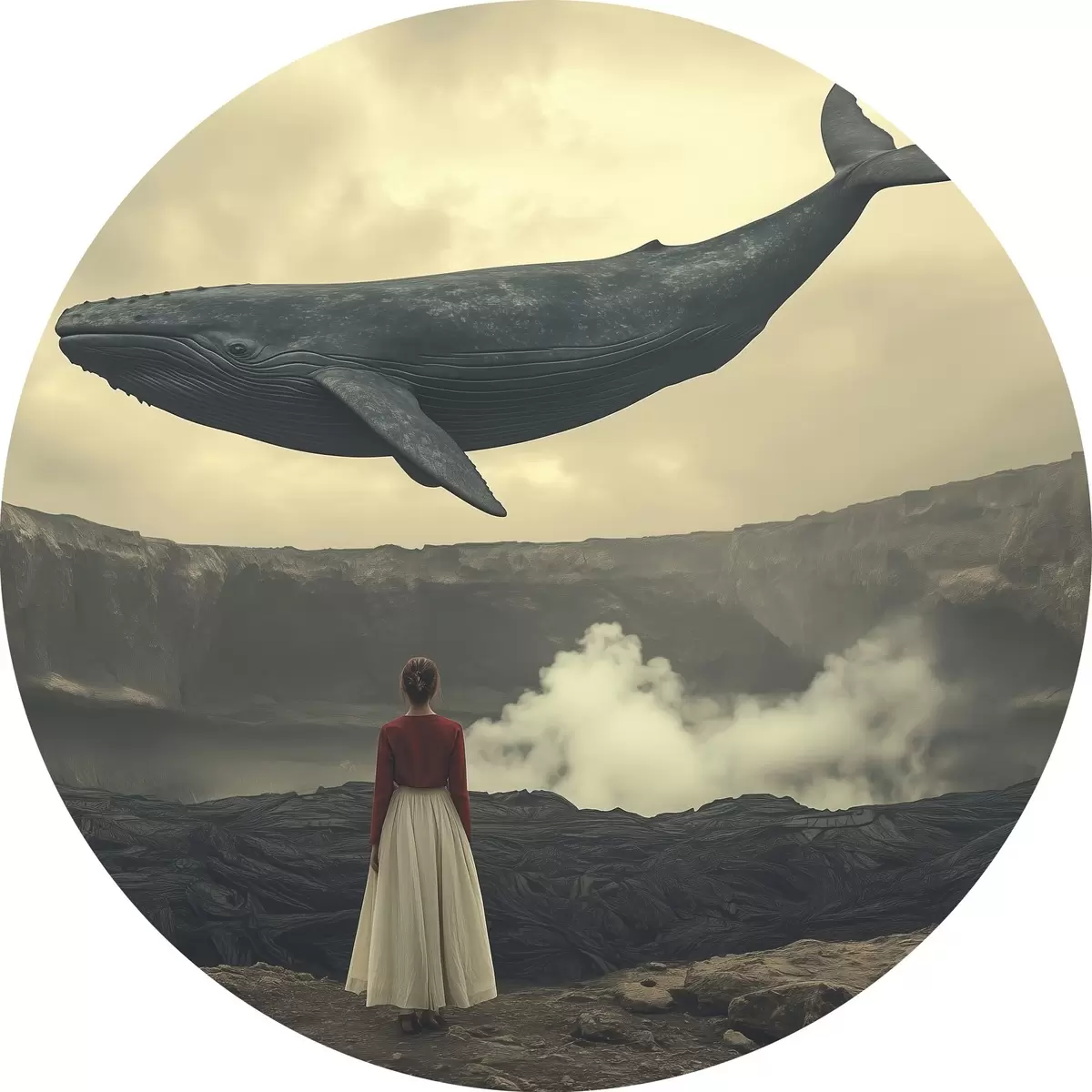Image Fille sur la lave avec une grande baleine volante dans le ciel Nr r40986