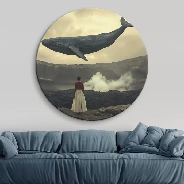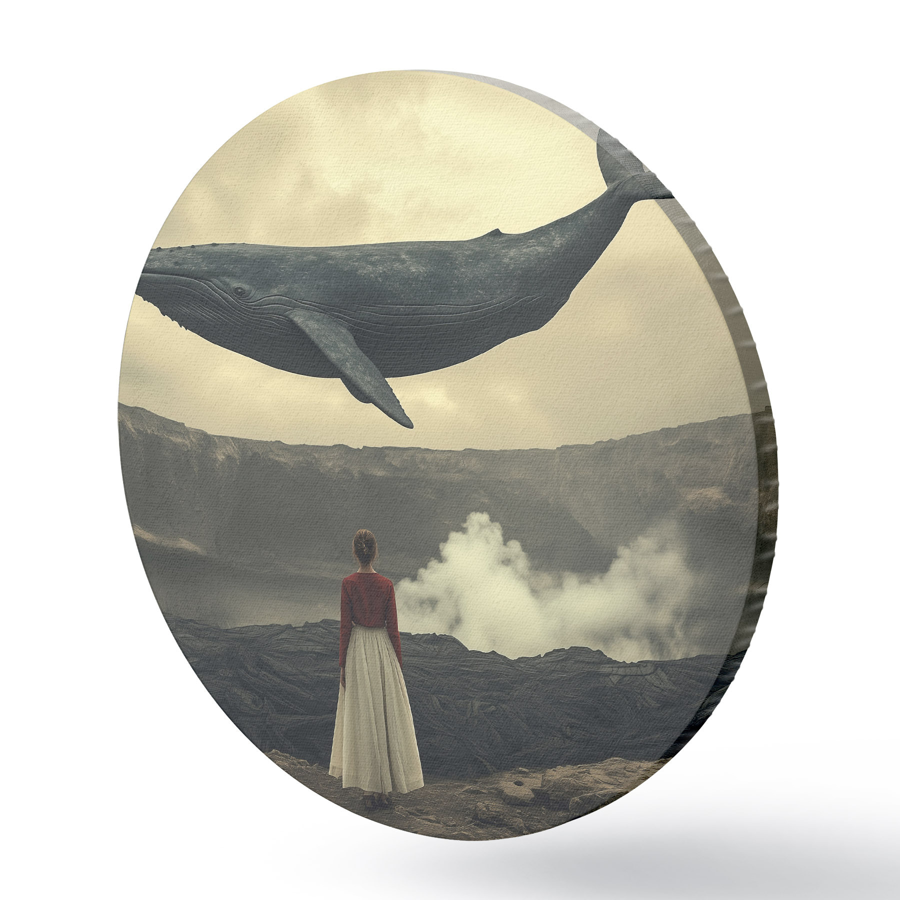 Tableaux ronds Fille sur la lave avec une grande baleine volante dans le ciel r40986