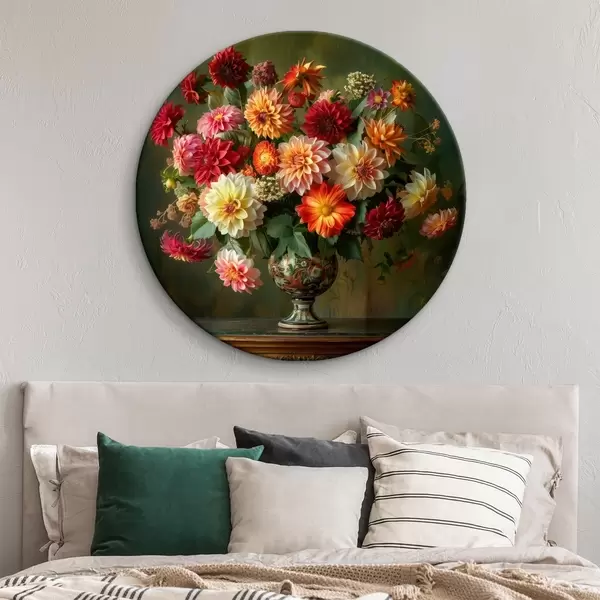 Tableaux ronds Un luxuriant bouquet de chrysanthèmes dans un vase sur un fond de verdure profonde r41001