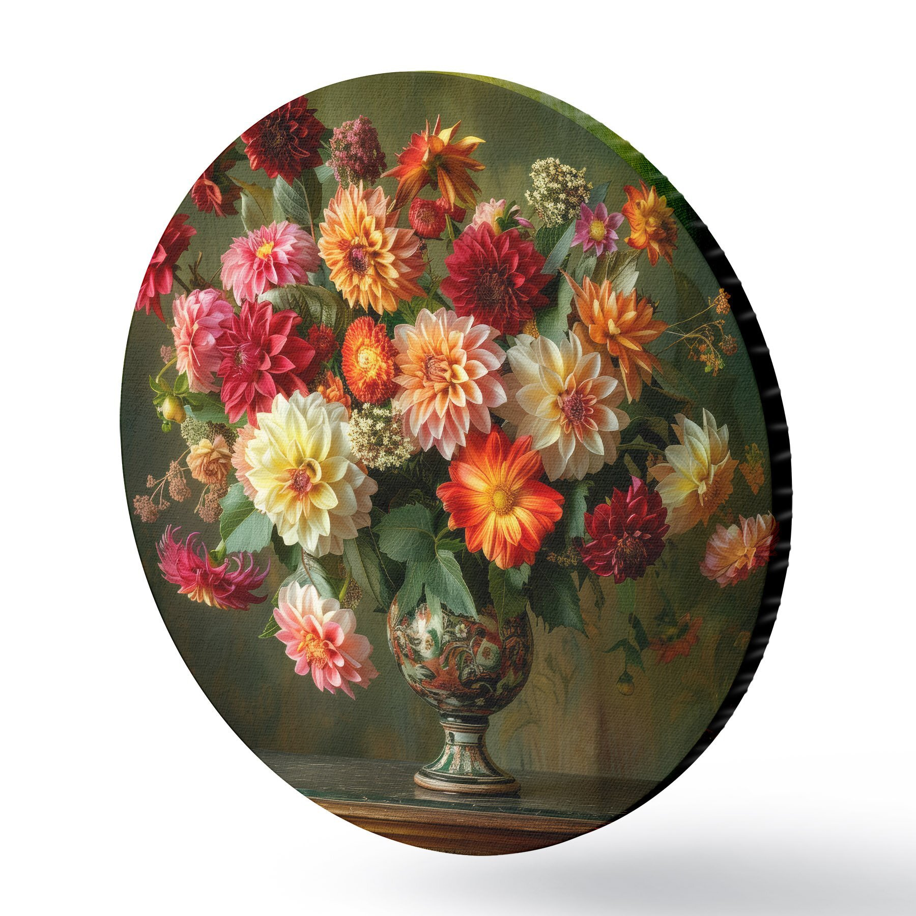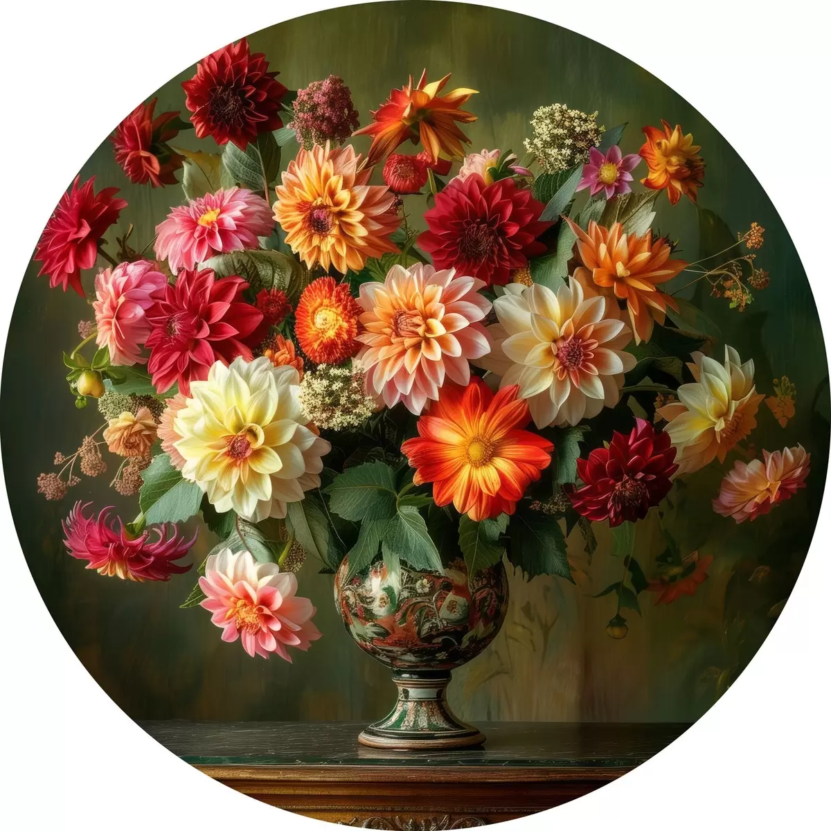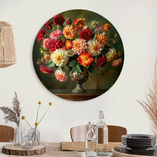 Tableaux ronds Un luxuriant bouquet de chrysanthèmes dans un vase sur un fond de verdure profonde r41001
