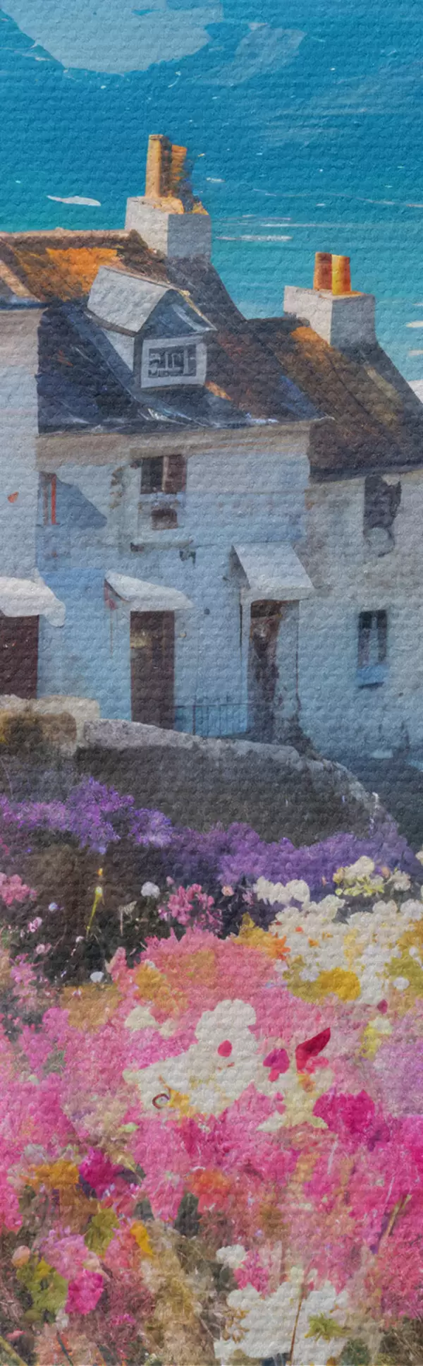 Image Une peinture à l'huile colorée représentant une ville de bord de mer avec des maisons blanches et un jardin de fleurs au premier plan Nr r41090