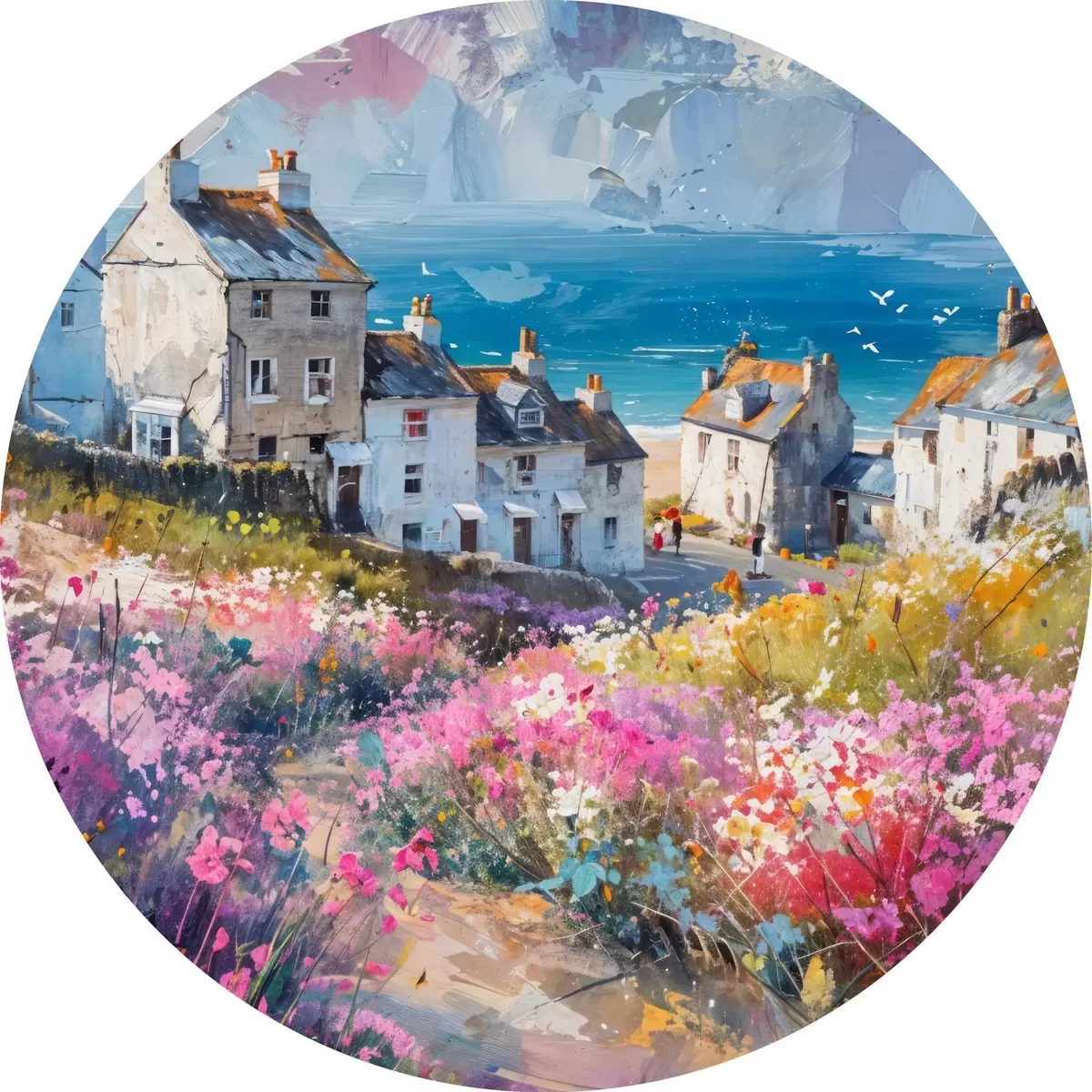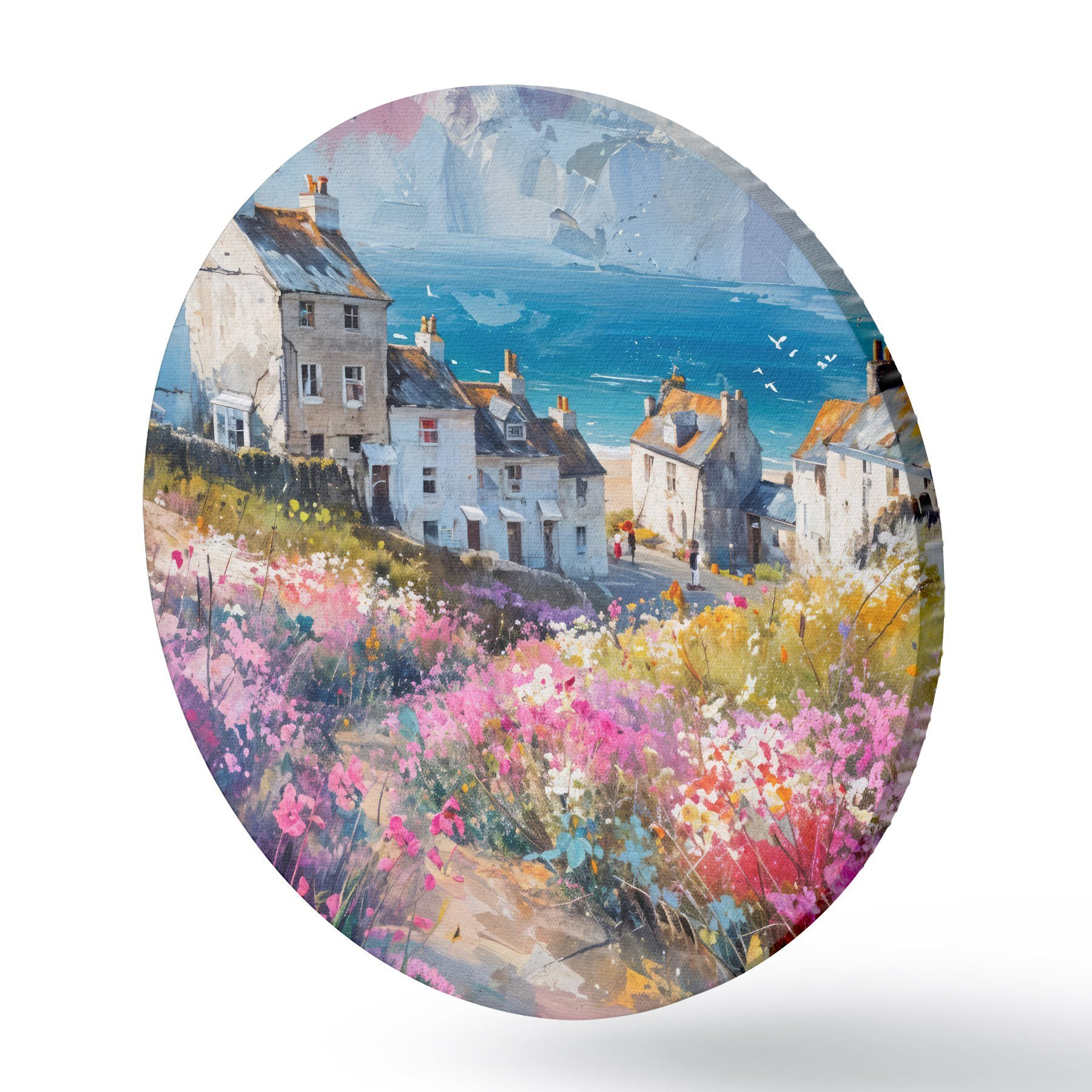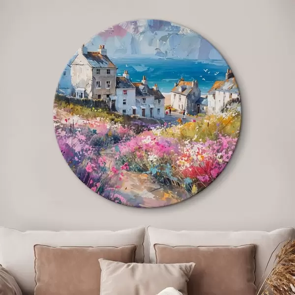 Tableaux ronds Une peinture à l'huile colorée représentant une ville de bord de mer avec des maisons blanches et un jardin de fleurs au premier plan r41090