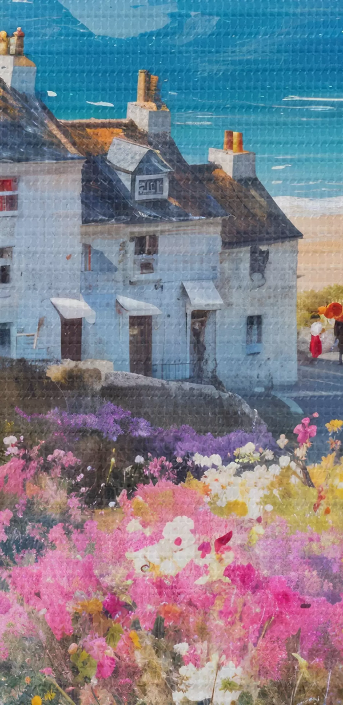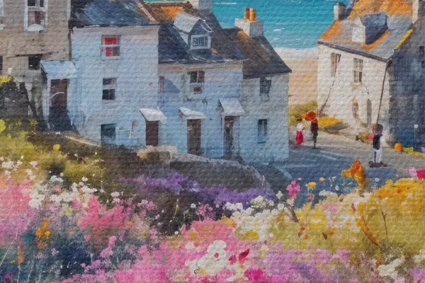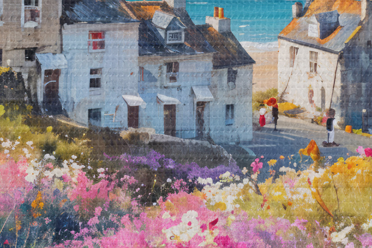 Image Une peinture à l'huile colorée représentant une ville de bord de mer avec des maisons blanches et un jardin de fleurs au premier plan Nr r41090