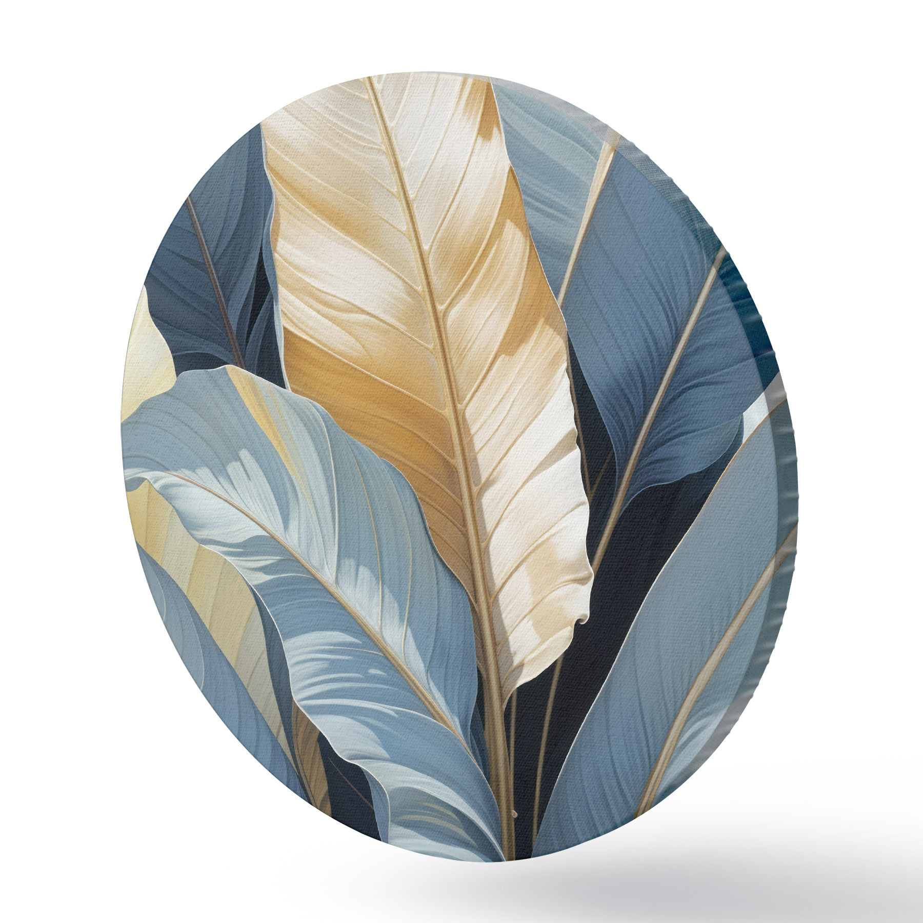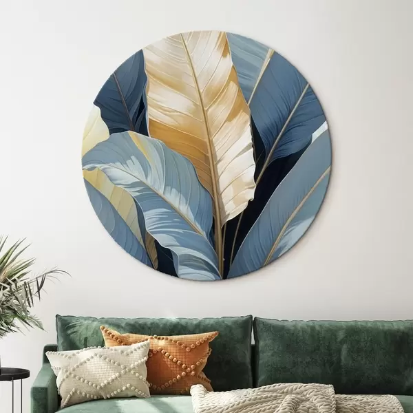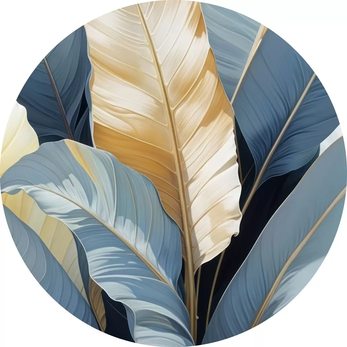 Tableaux ronds Feuilles tropicales dans les tons bleus et jaunes, grandes feuilles de palmier ou de bananier sur fond naturel luxuriant r41097