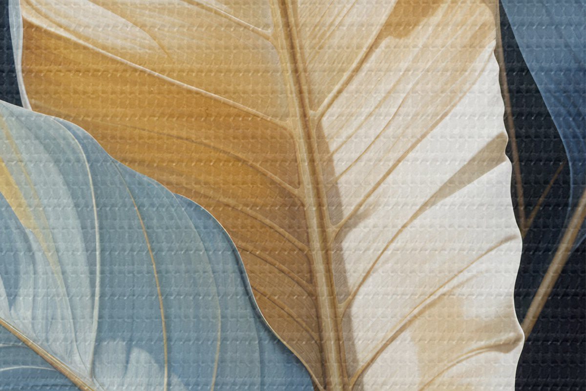 Image Feuilles tropicales dans les tons bleus et jaunes, grandes feuilles de palmier ou de bananier sur fond naturel luxuriant Nr r41097