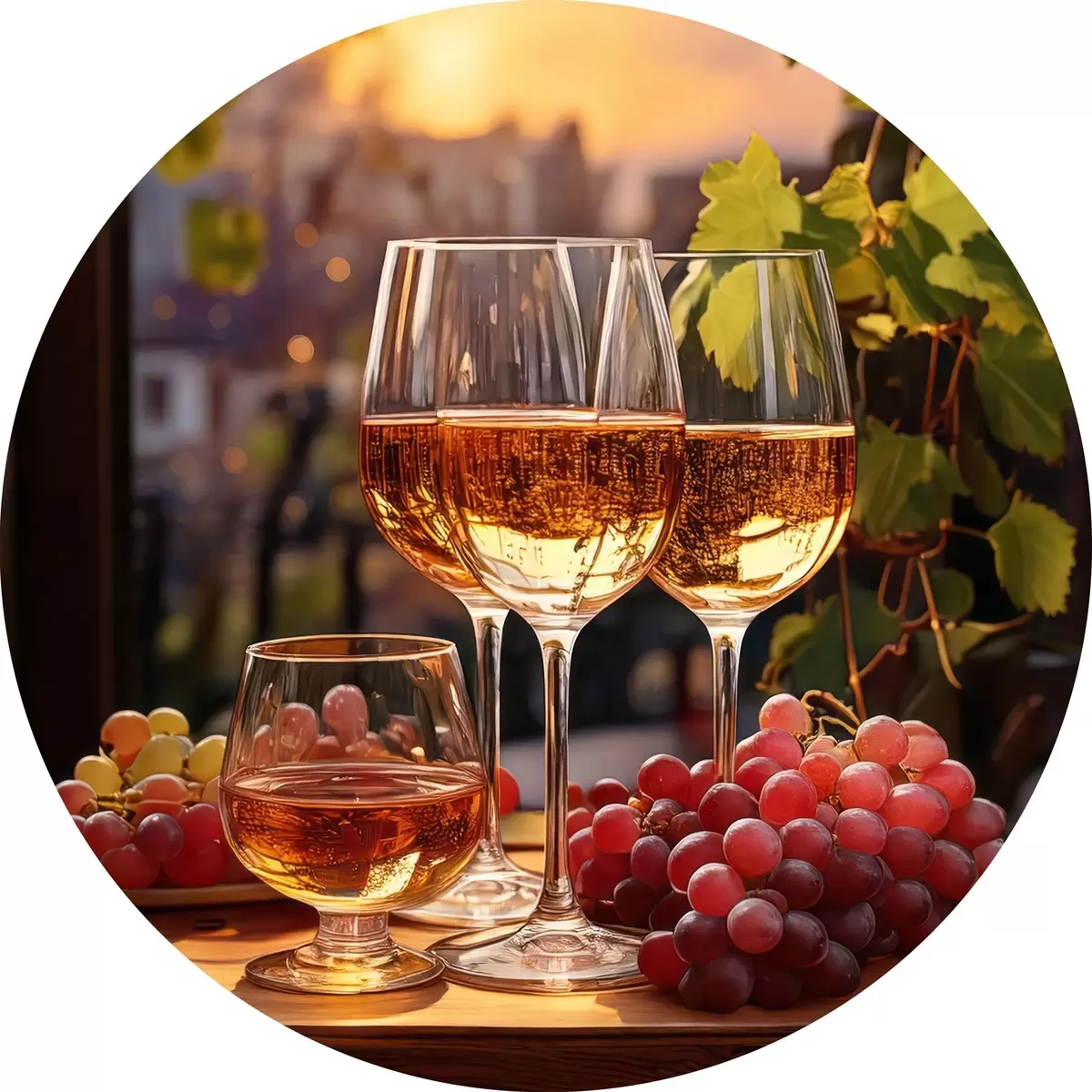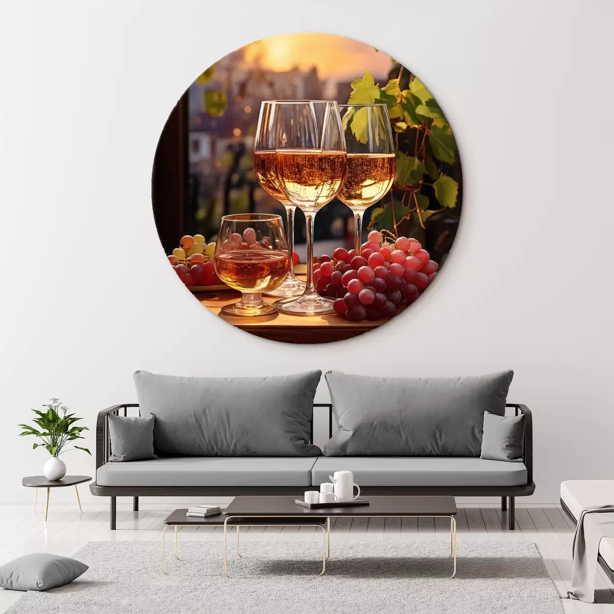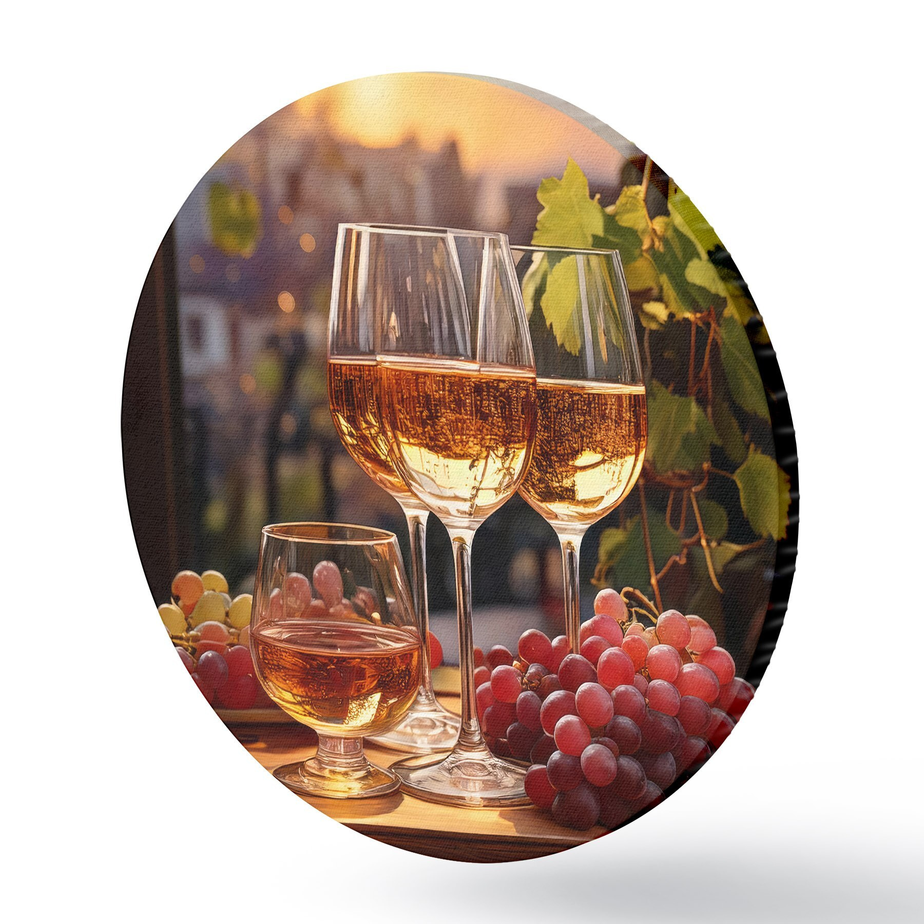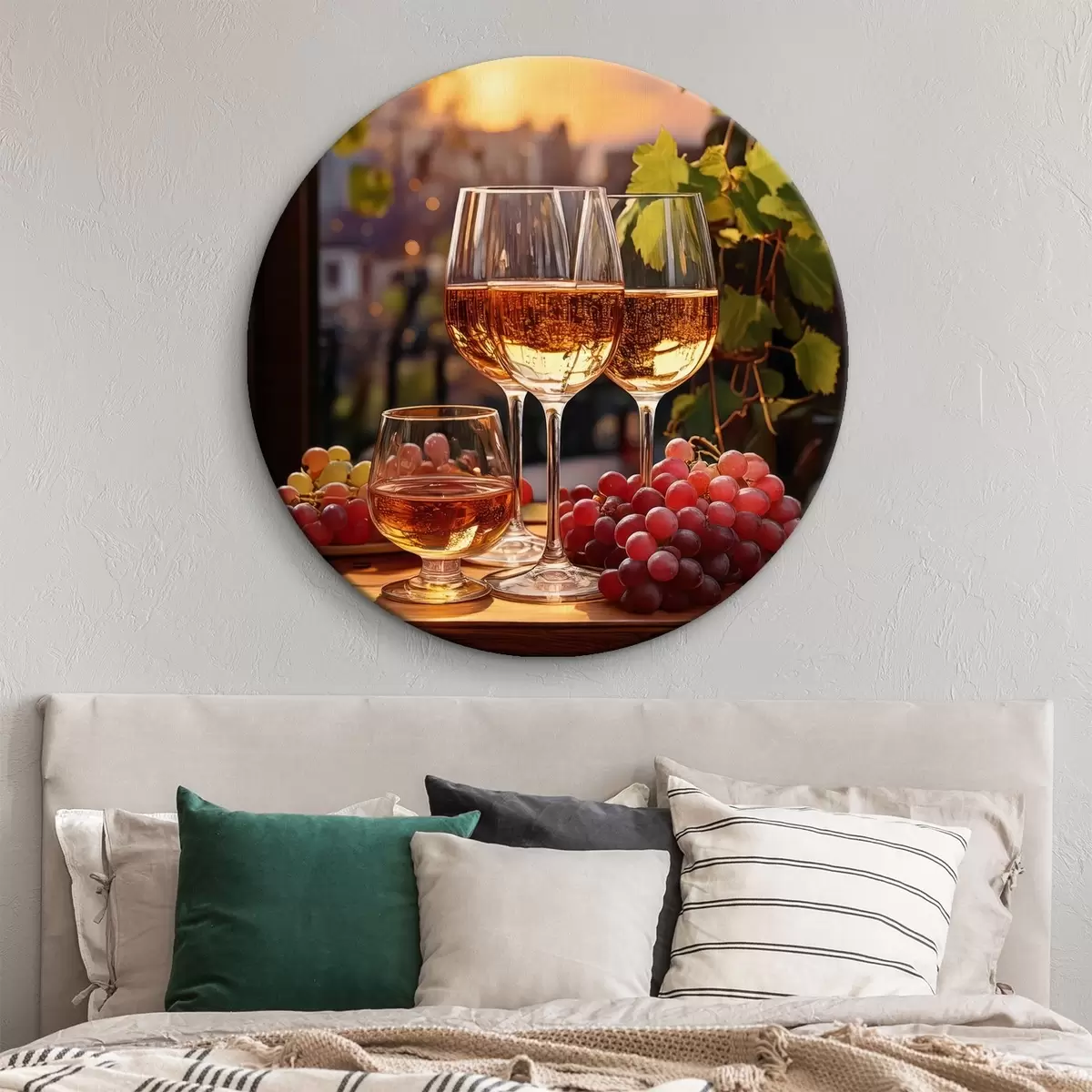 Tableaux ronds verres avec vin, raisins sur la table, nature morte r41104