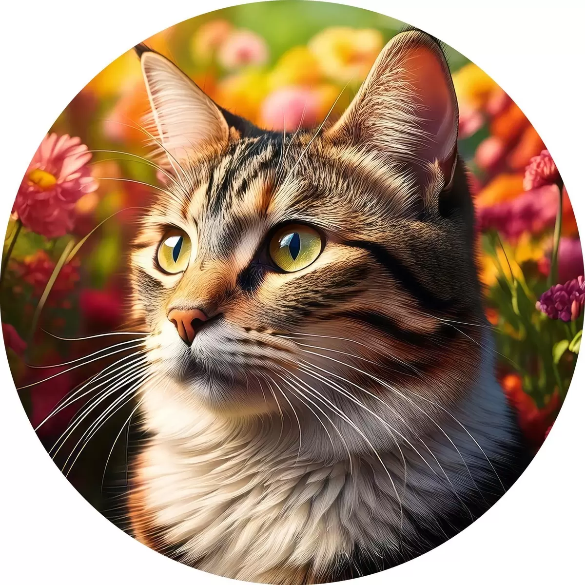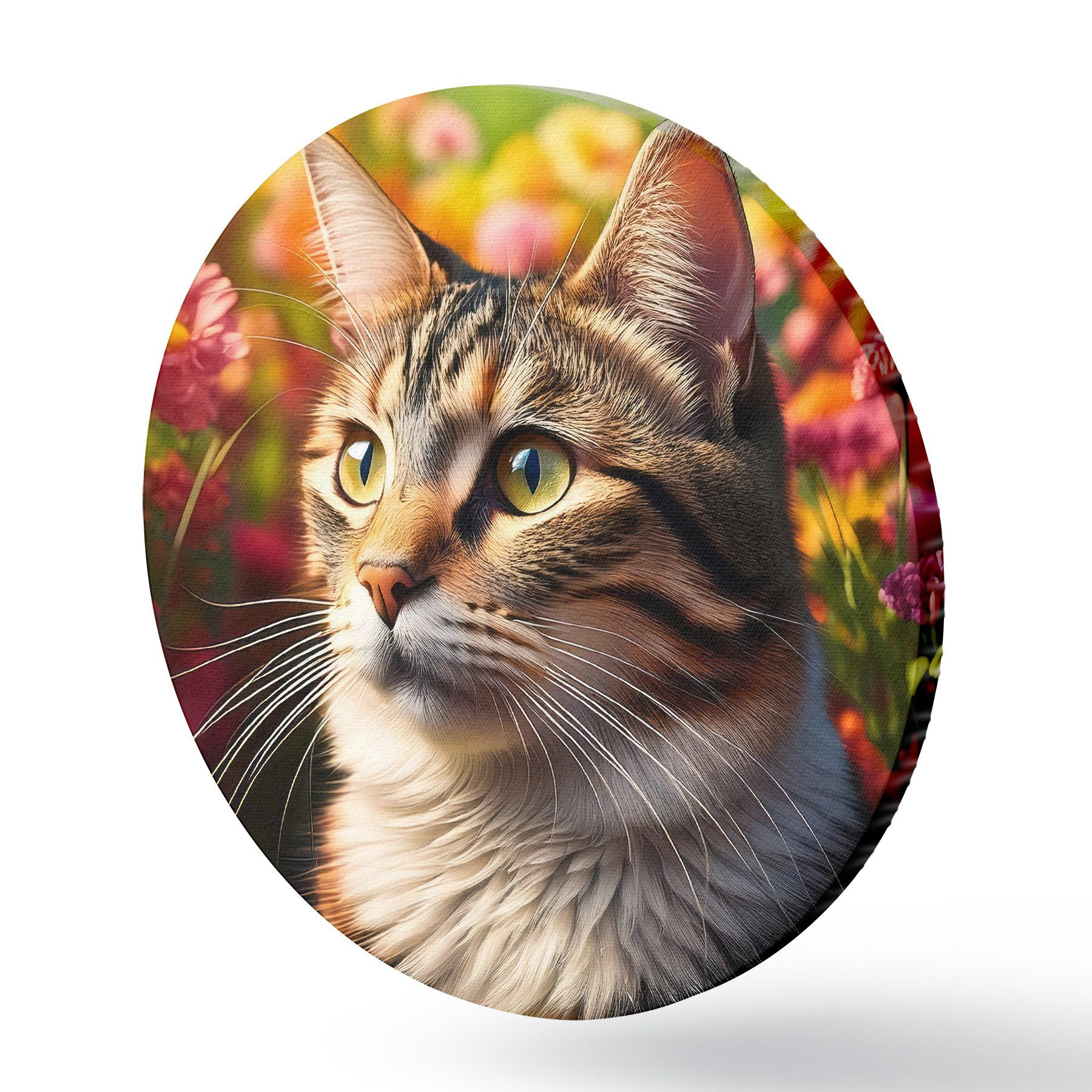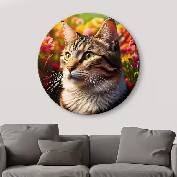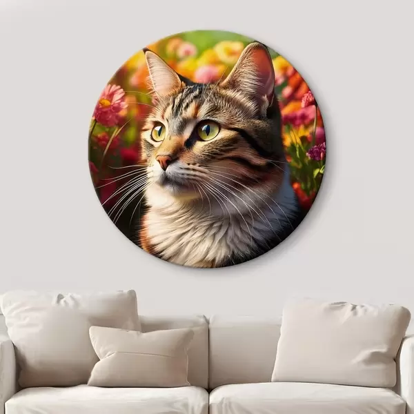 Tableaux ronds gros chat, portrait de chat, chat et fleurs r41106
