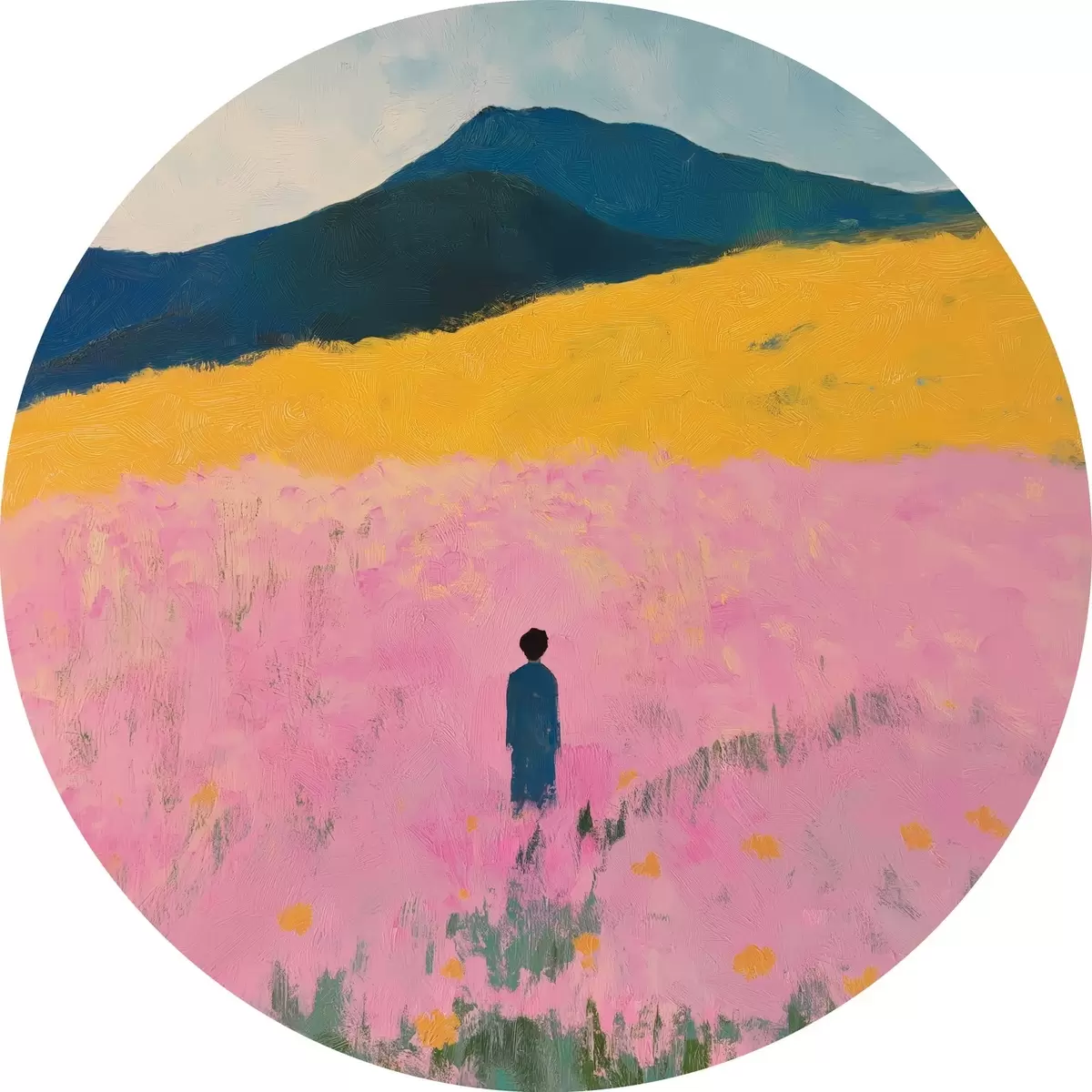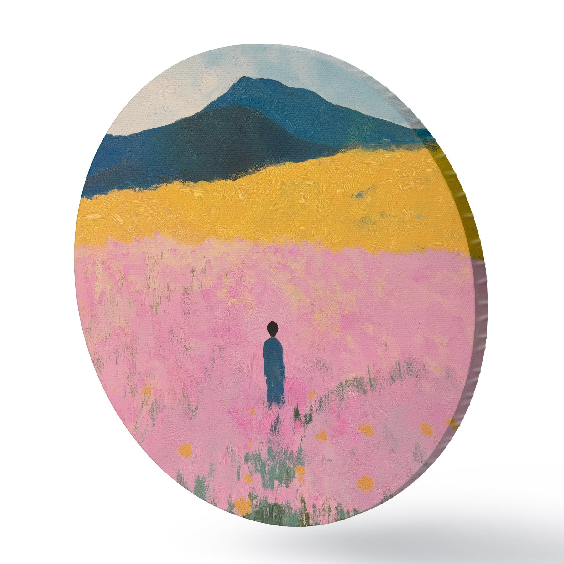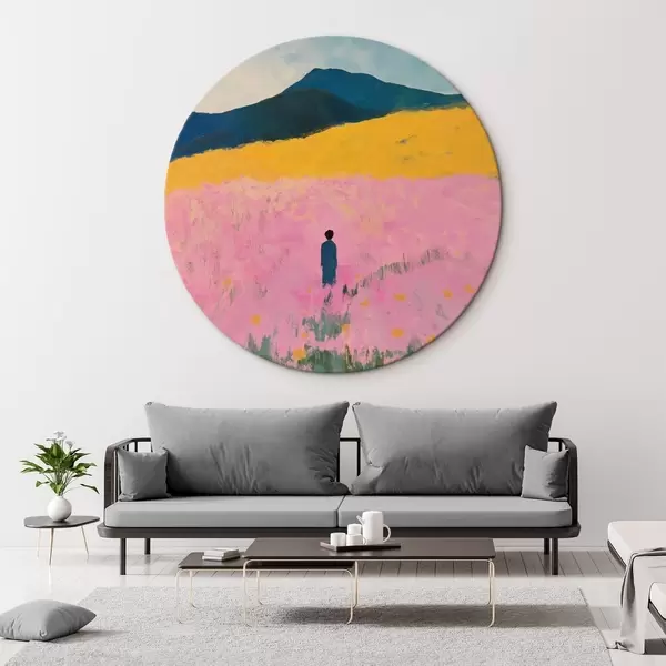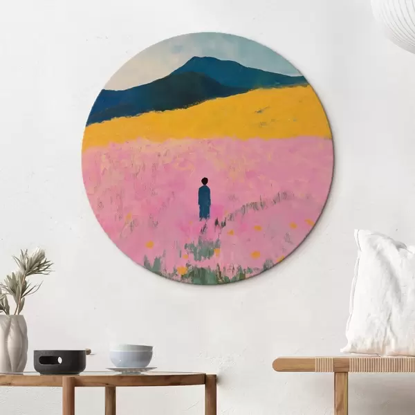 Tableaux ronds Homme dans un champ de fleurs roses r41164