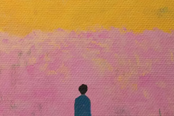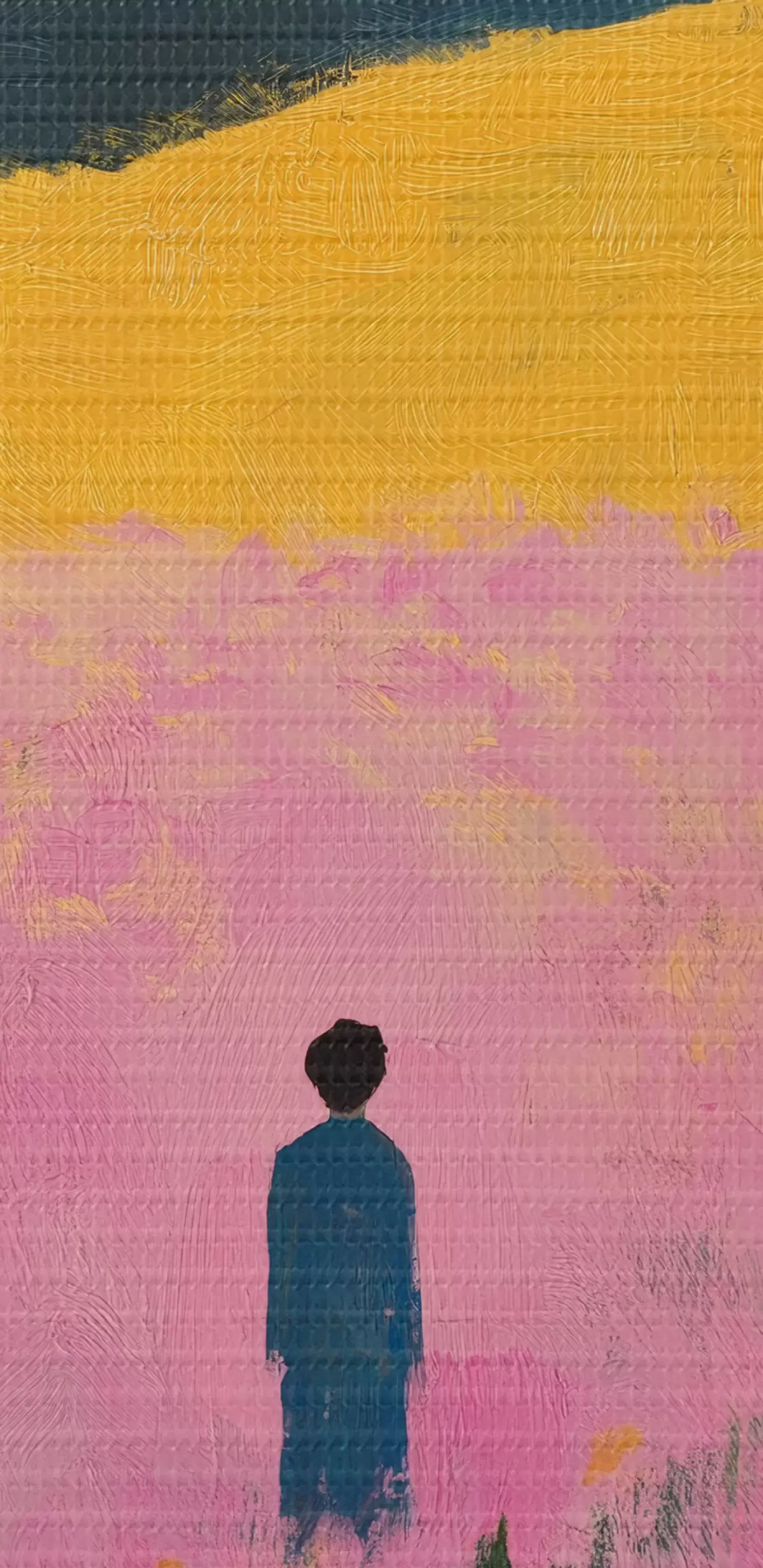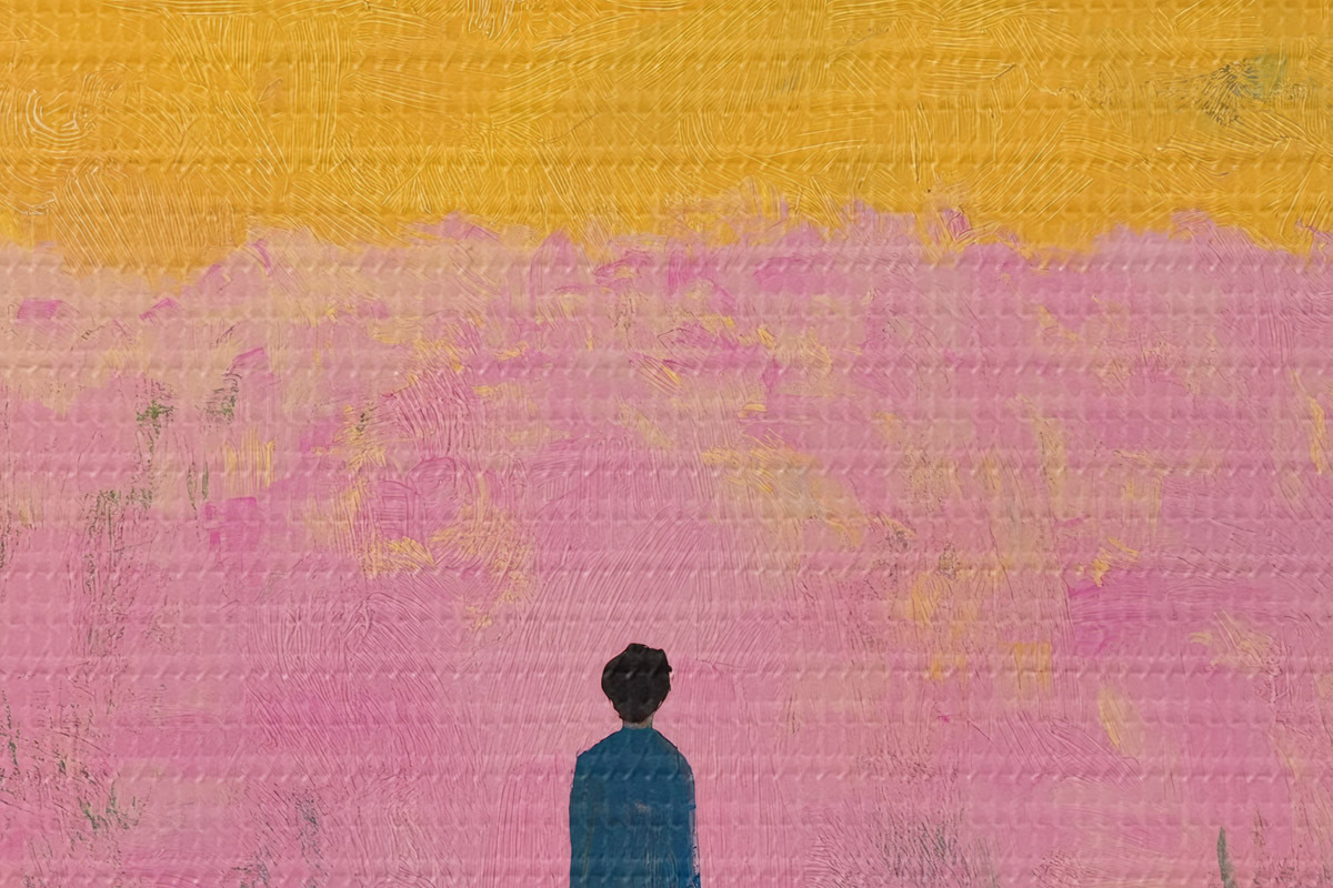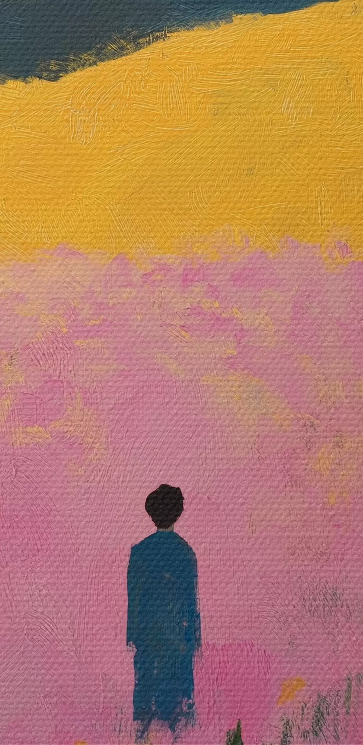 Tableaux ronds Homme dans un champ de fleurs roses r41164
