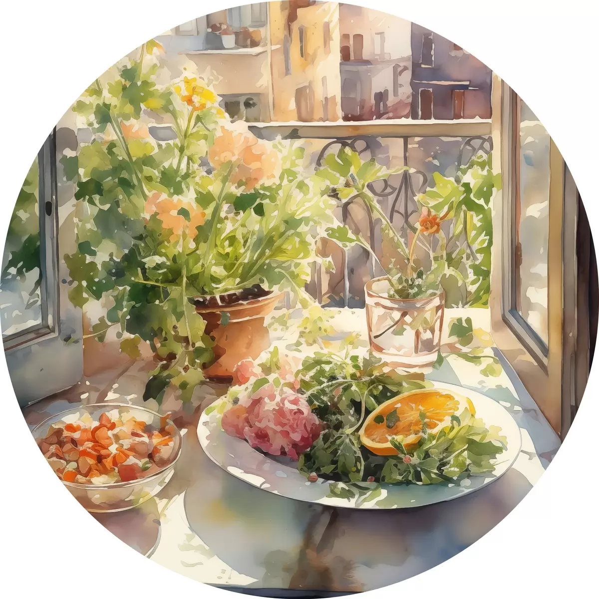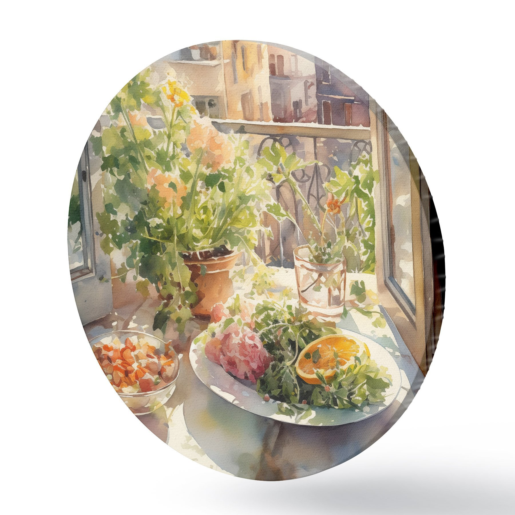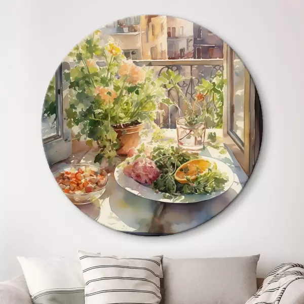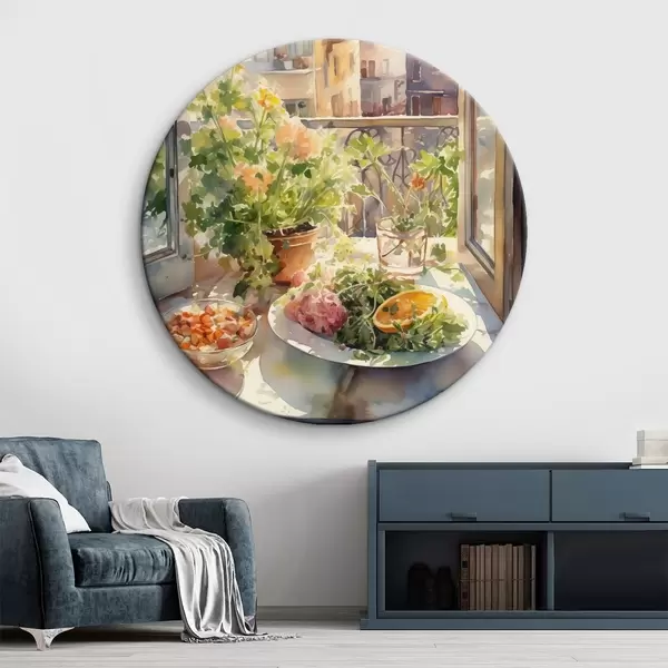 Tableaux ronds Dîner aquarelle, vue de la ville, fleurs, nature, salade verte r41166