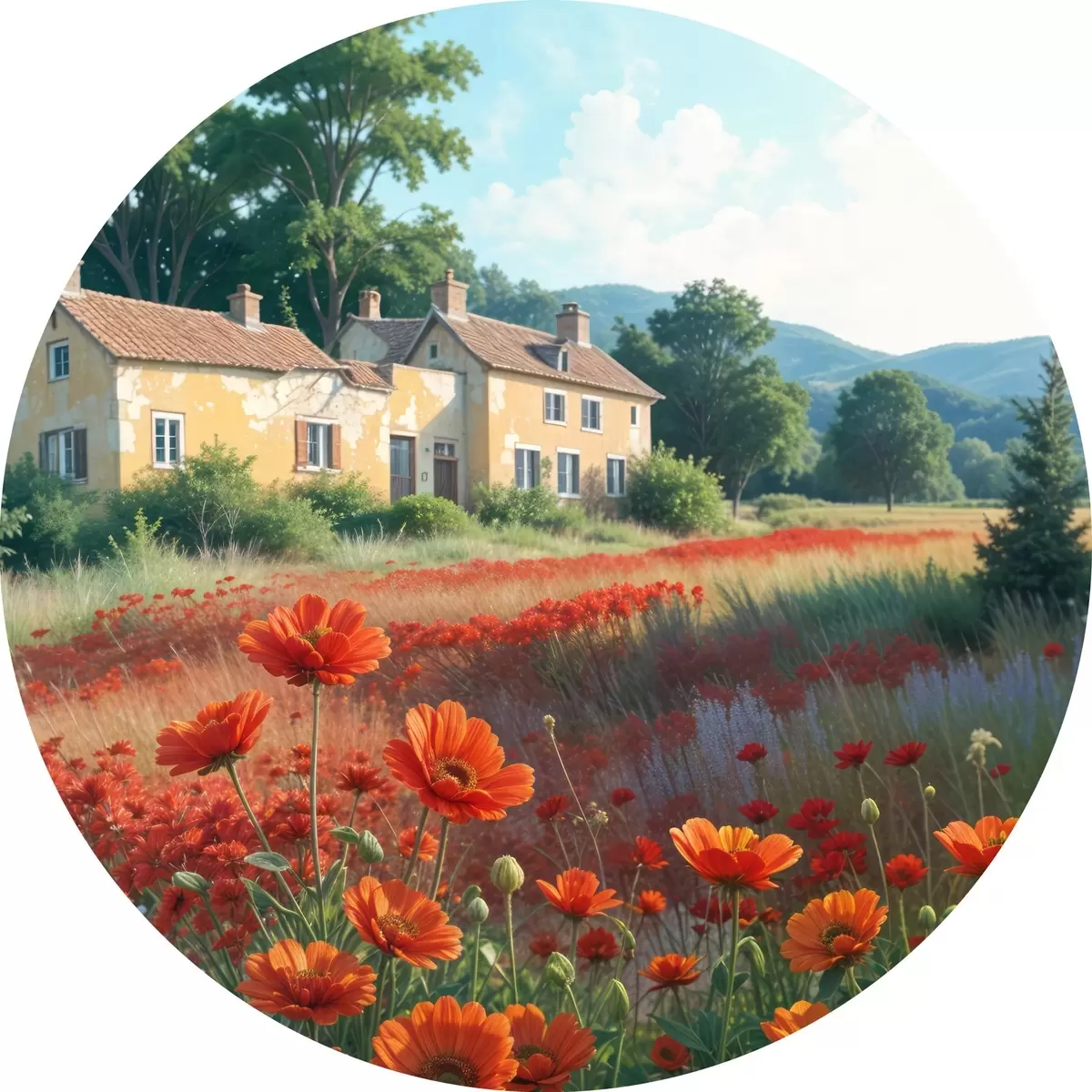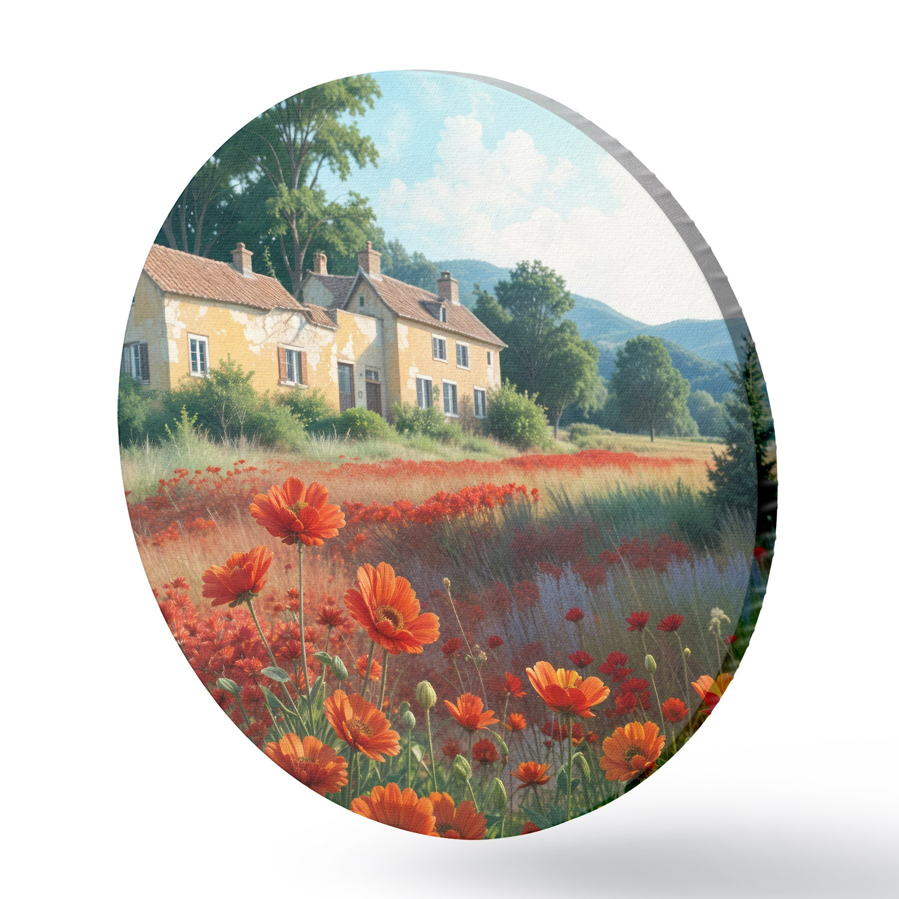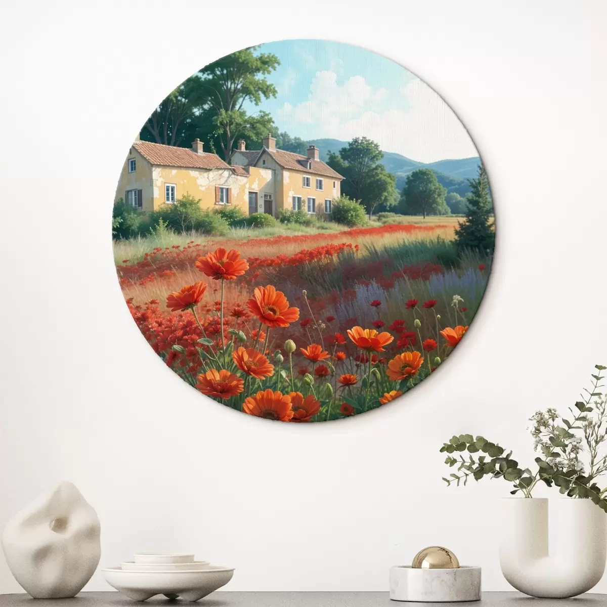 Tableaux ronds Un champ de coquelicots d'un rouge éclatant au premier plan, avec une rangée de charmantes maisons jaunes et blanches à l'arrière-plan r41260