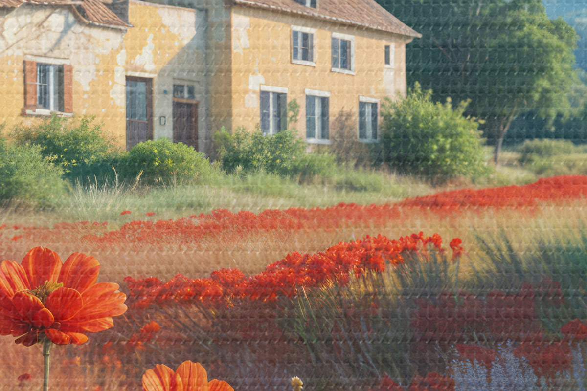 Image Un champ de coquelicots d'un rouge éclatant au premier plan, avec une rangée de charmantes maisons jaunes et blanches à l'arrière-plan Nr r41260