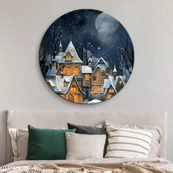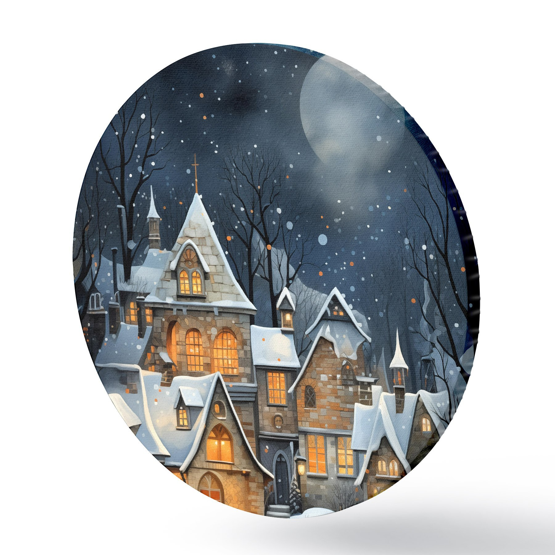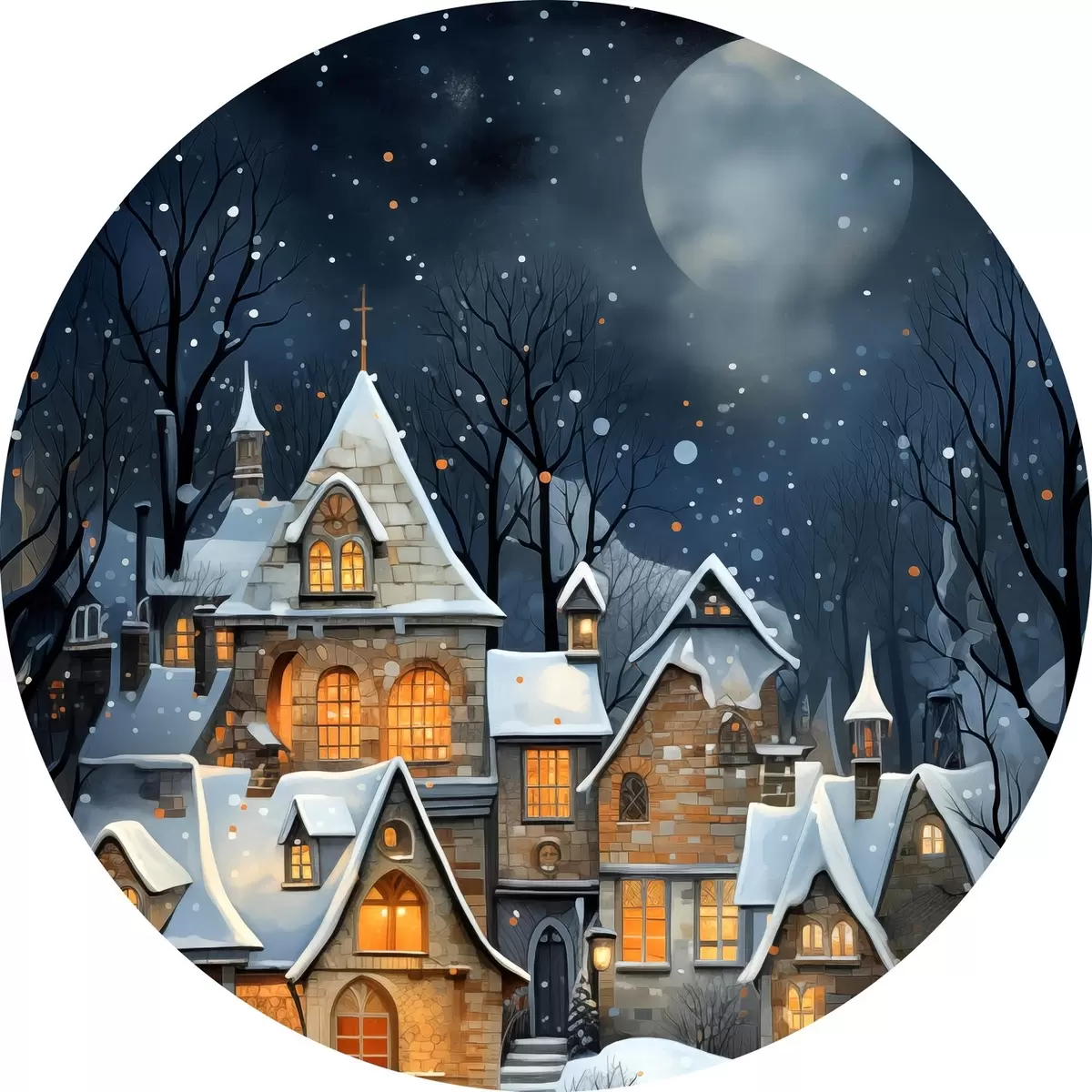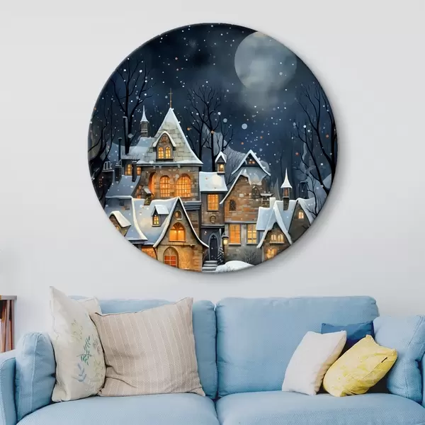 Tableaux ronds Maisons dans la neige sur fond de ciel étoilé r41276