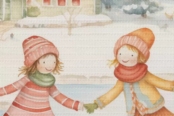 Image Scène d'hiver avec deux filles patinant, ville d'hiver, maisons, forêt Nr r41377