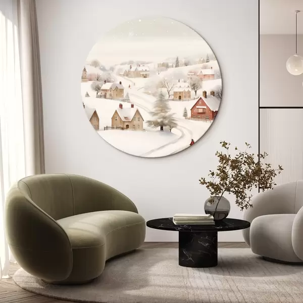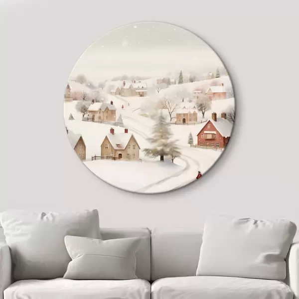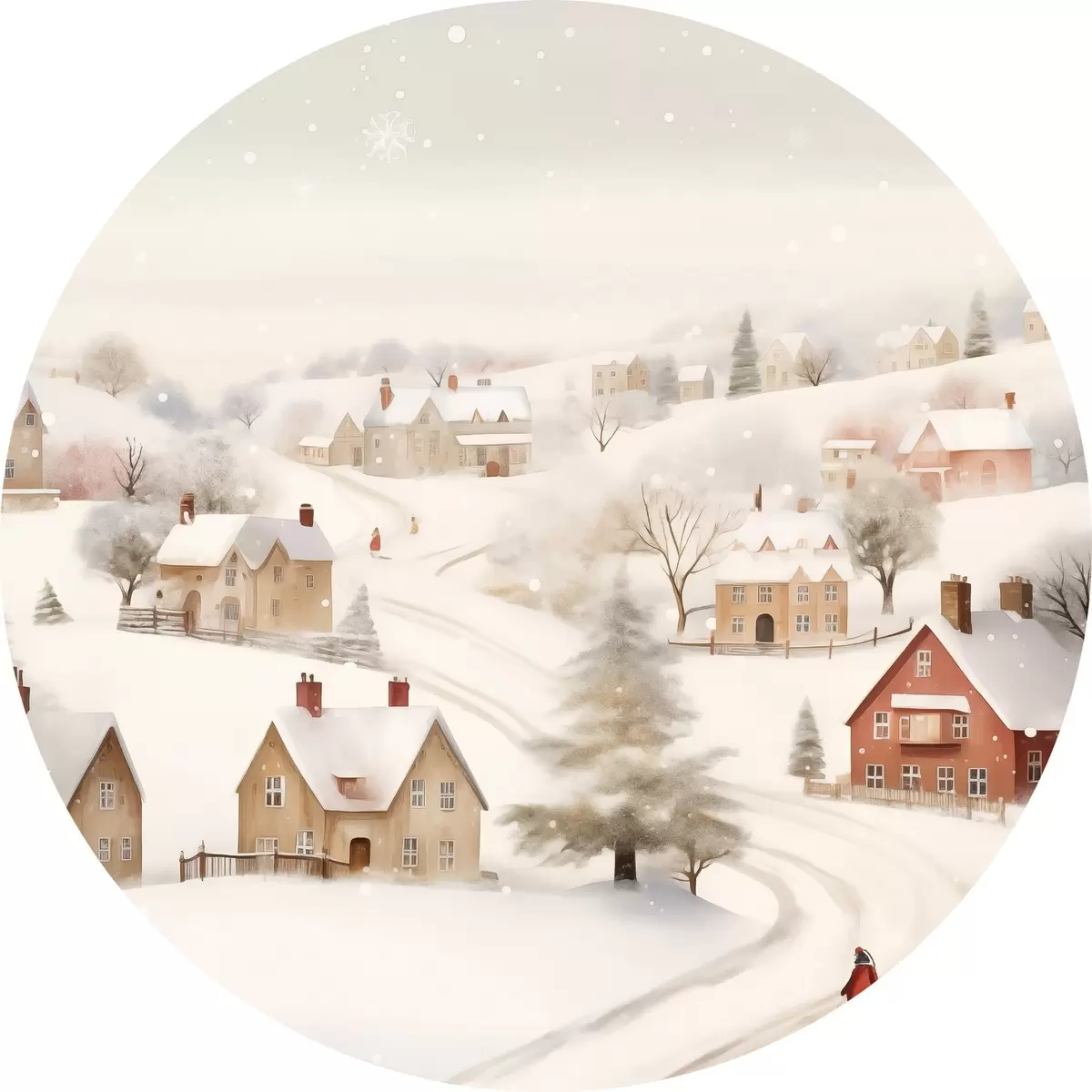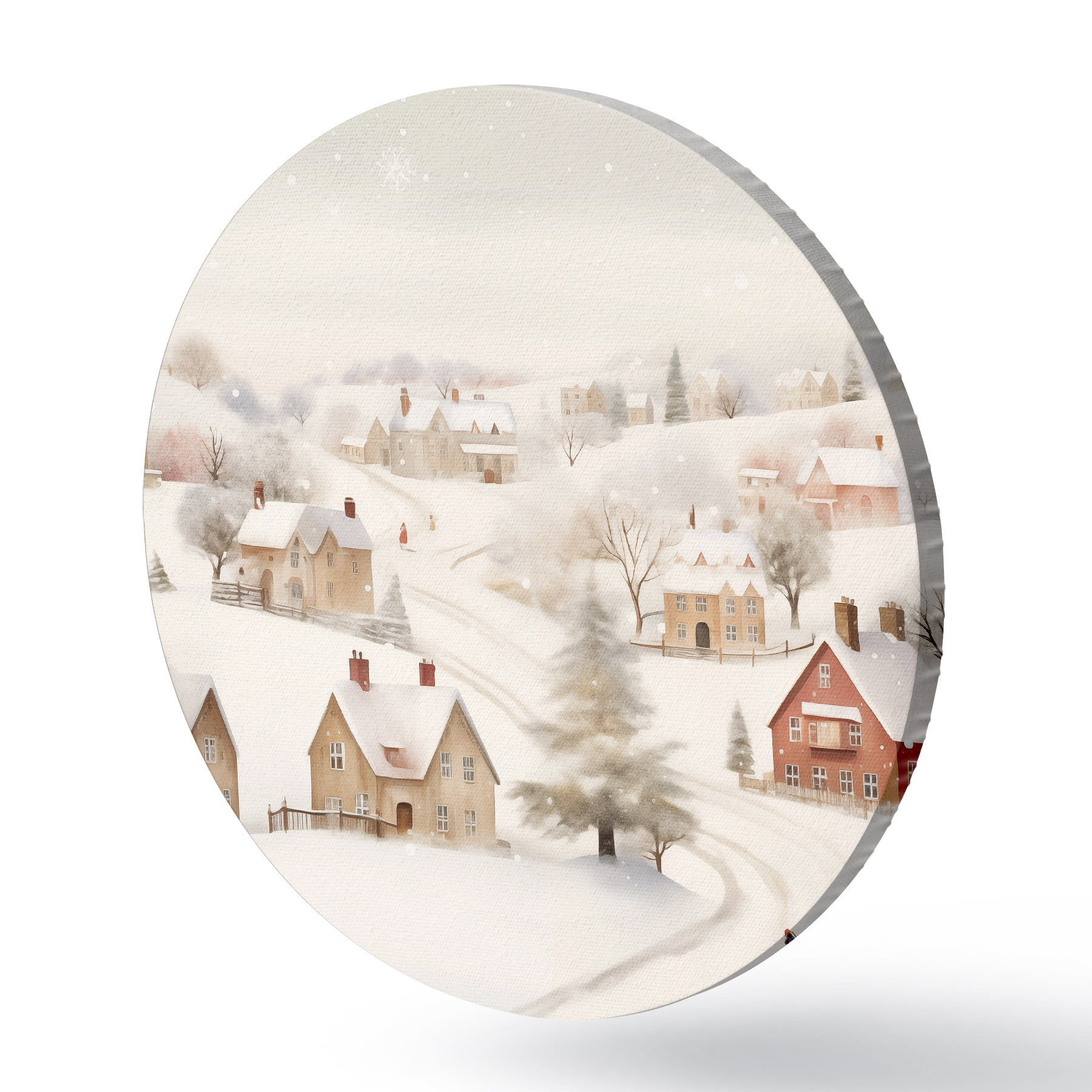 Tableaux ronds Village d'hiver, aquarelle, flocons de neige, couleurs douces, arbres, paysage r41381