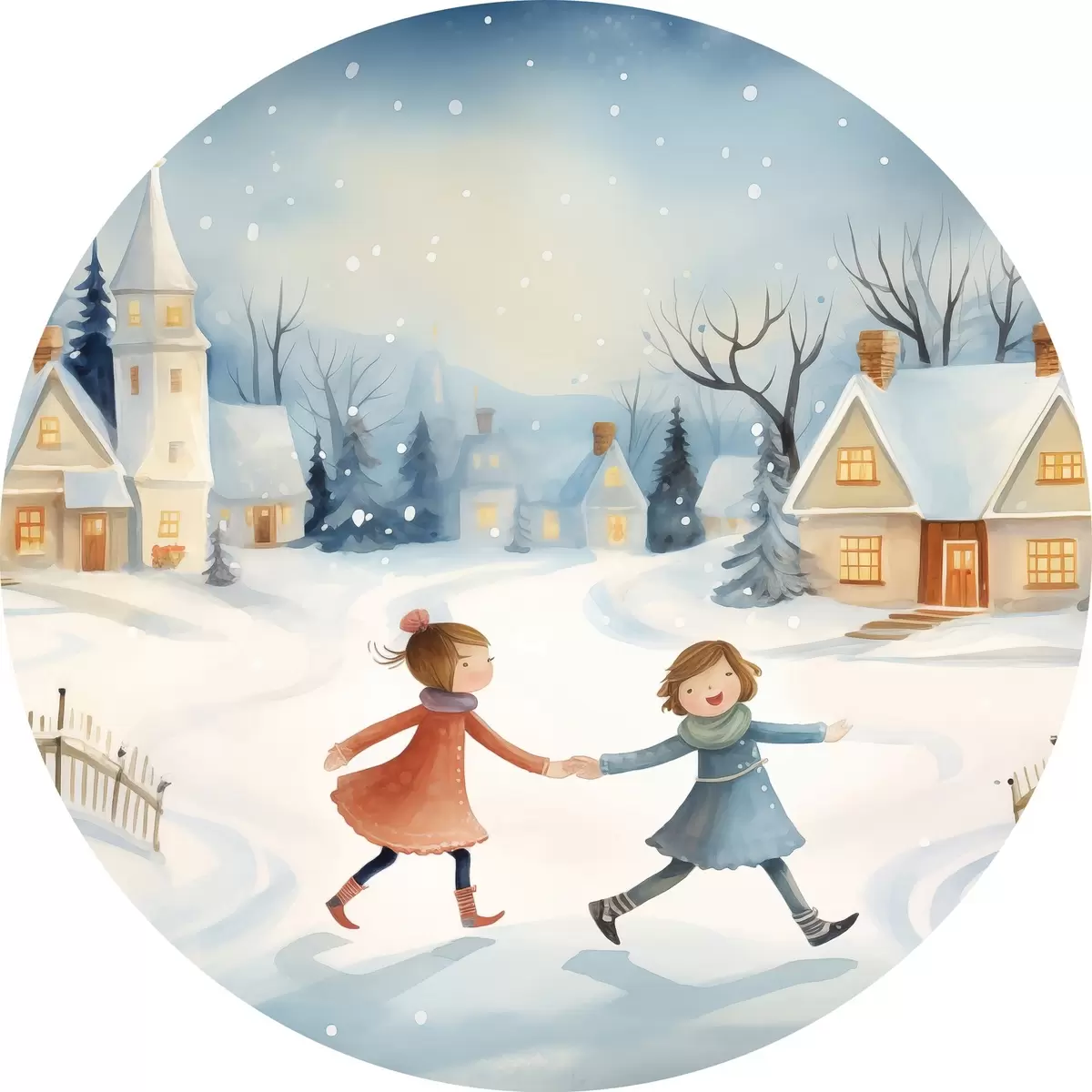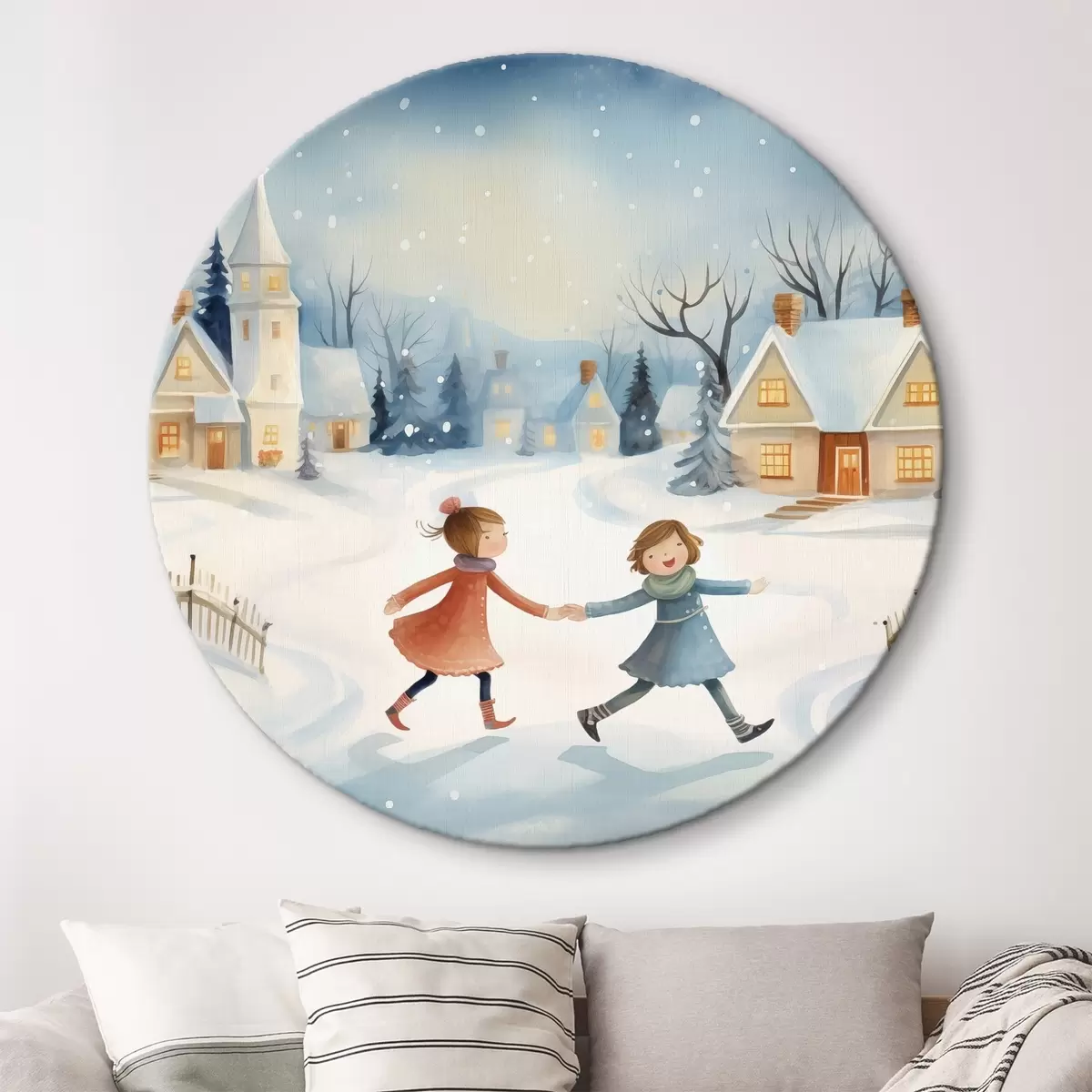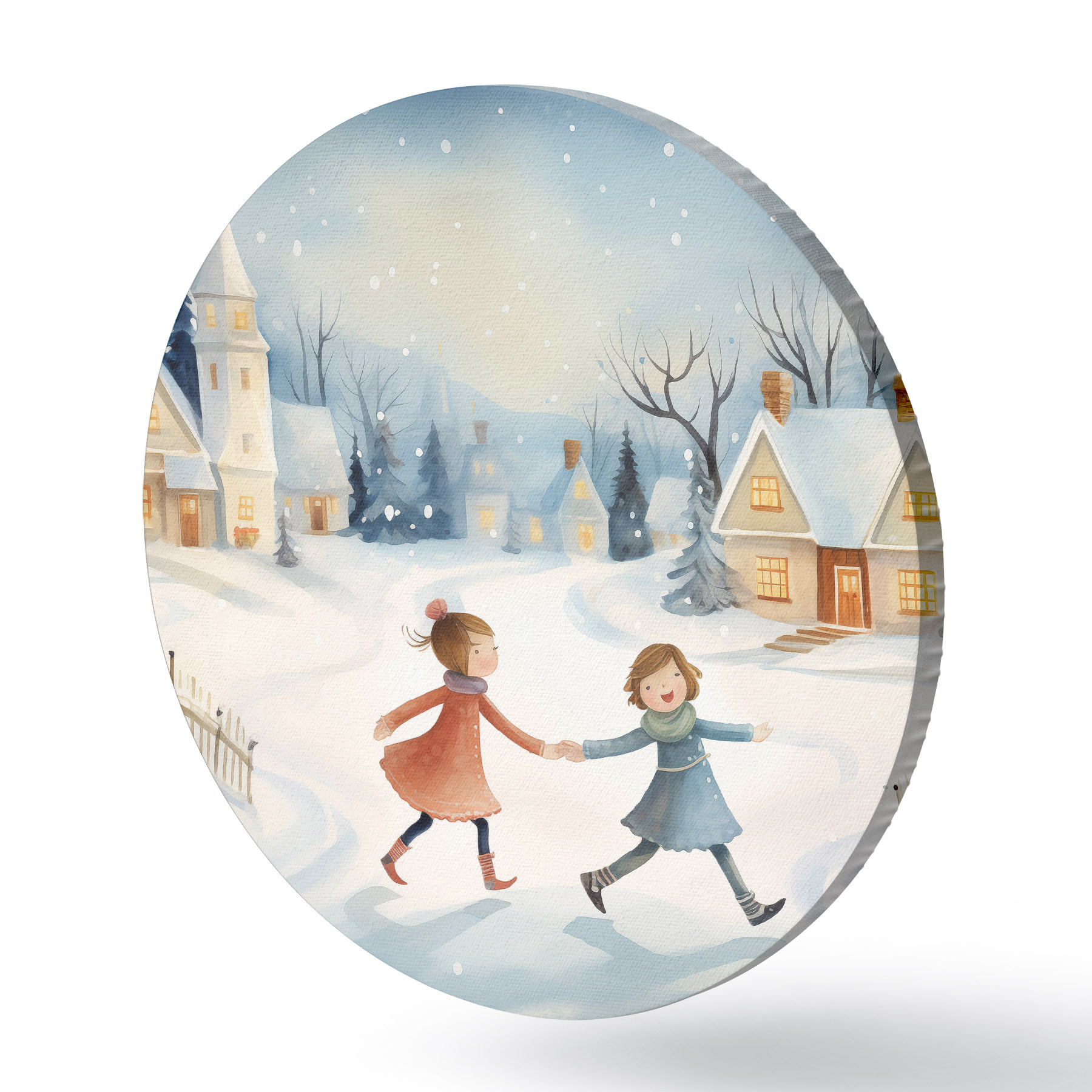Tableaux ronds Filles dans le village d'hiver, flocons de neige, aquarelle, maisons, forêt r41385