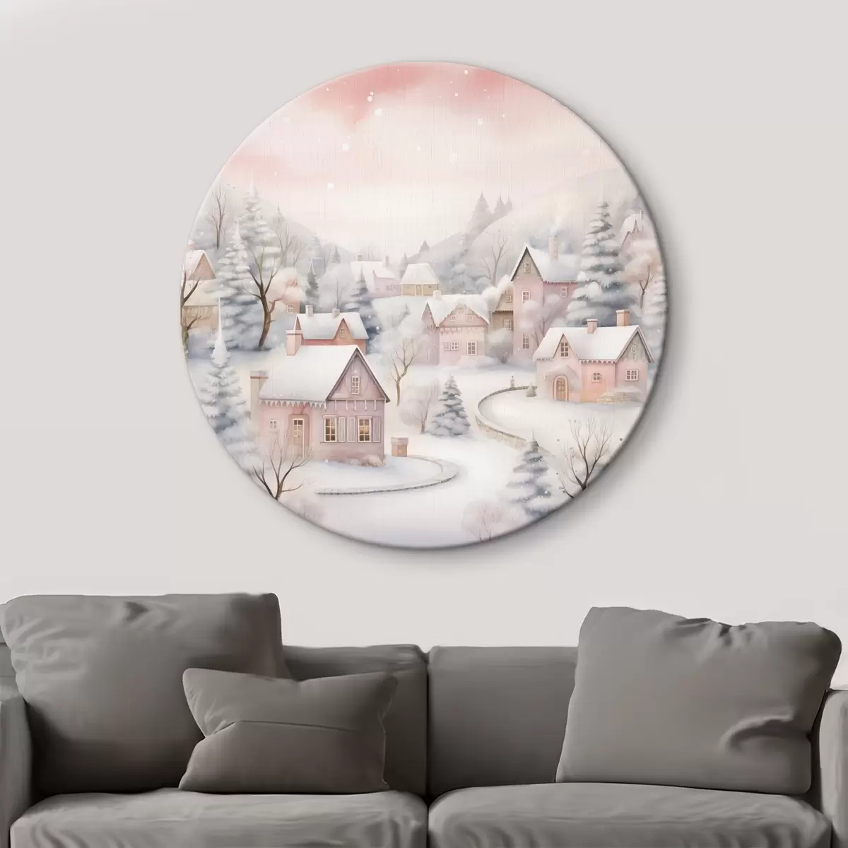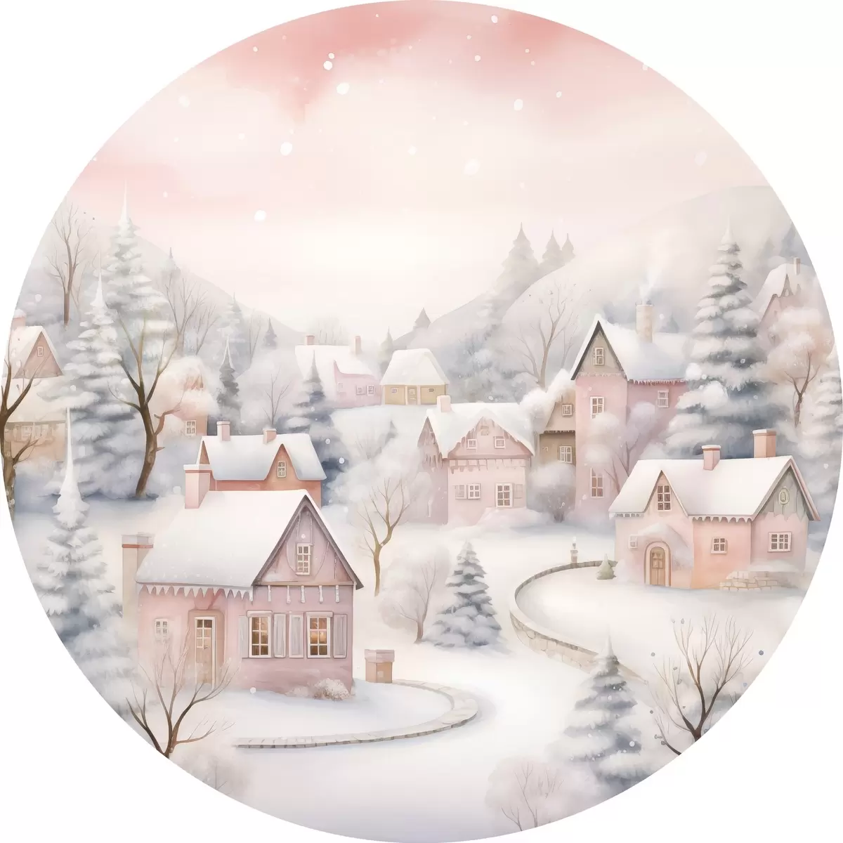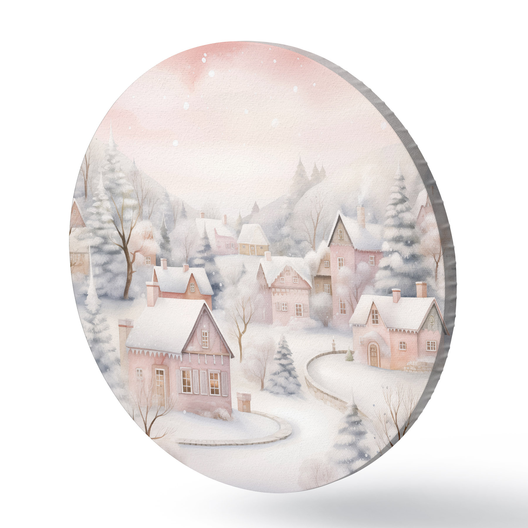 Tableaux ronds Aquarelle village d'hiver, forêt de pins, maisons, montagnes, couleurs pastel douces r41388