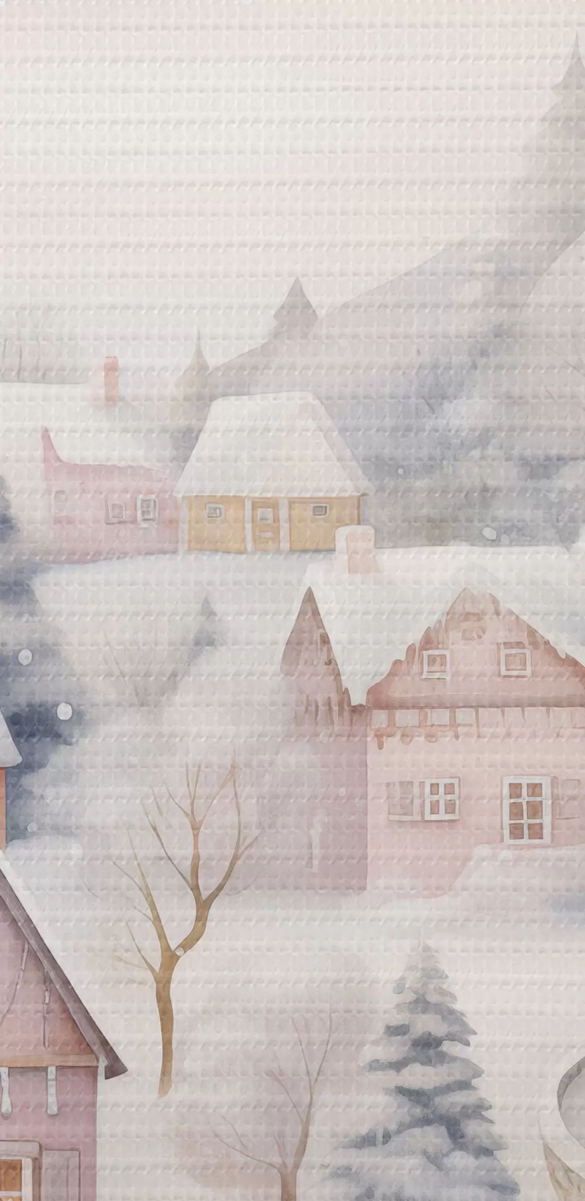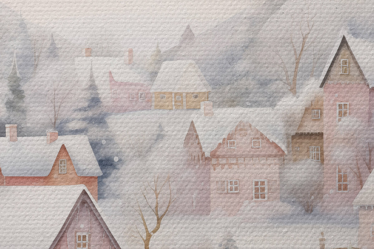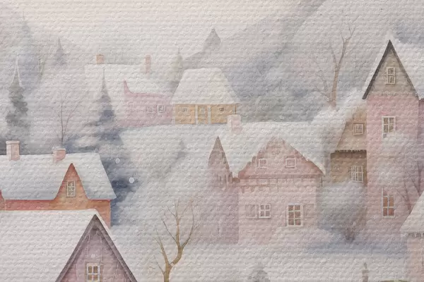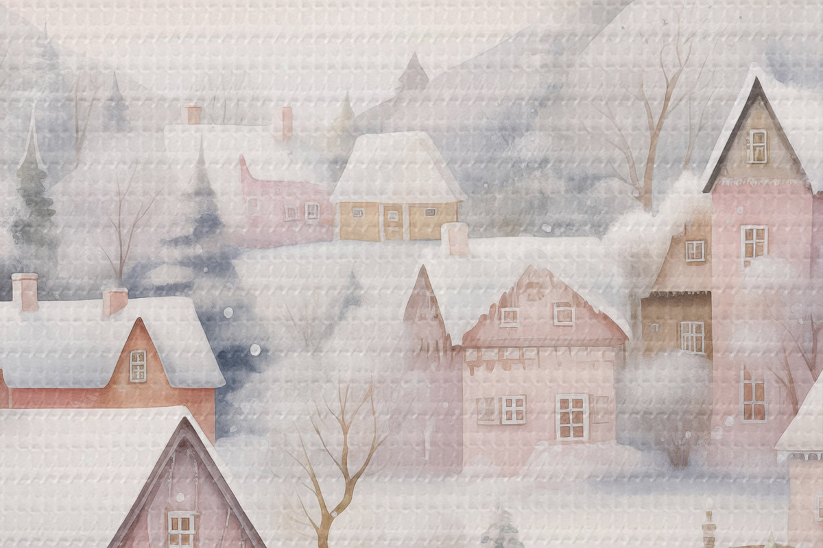 Image Aquarelle village d'hiver, forêt de pins, maisons, montagnes, couleurs pastel douces Nr r41388