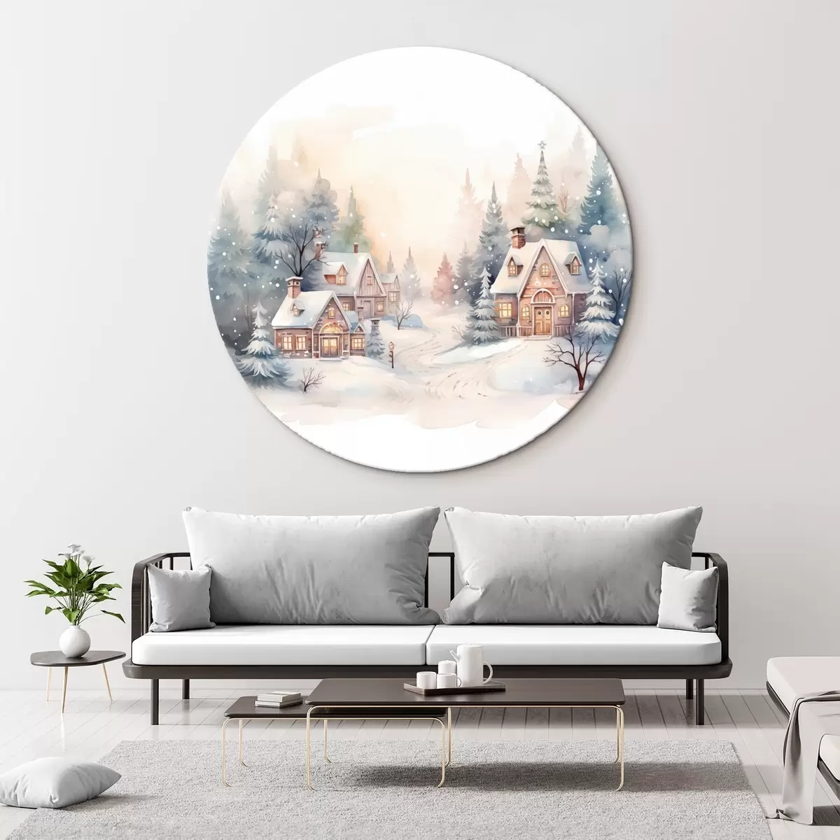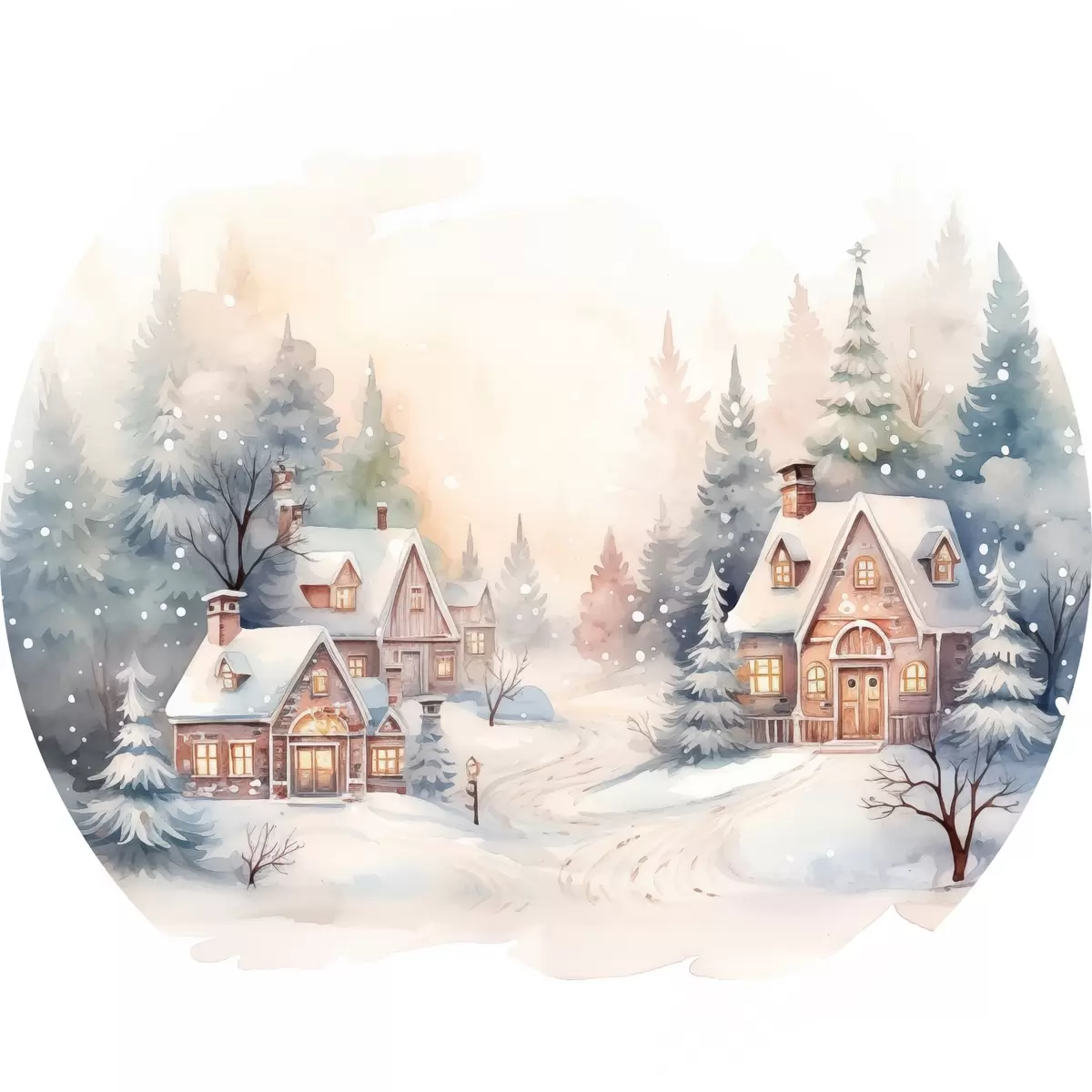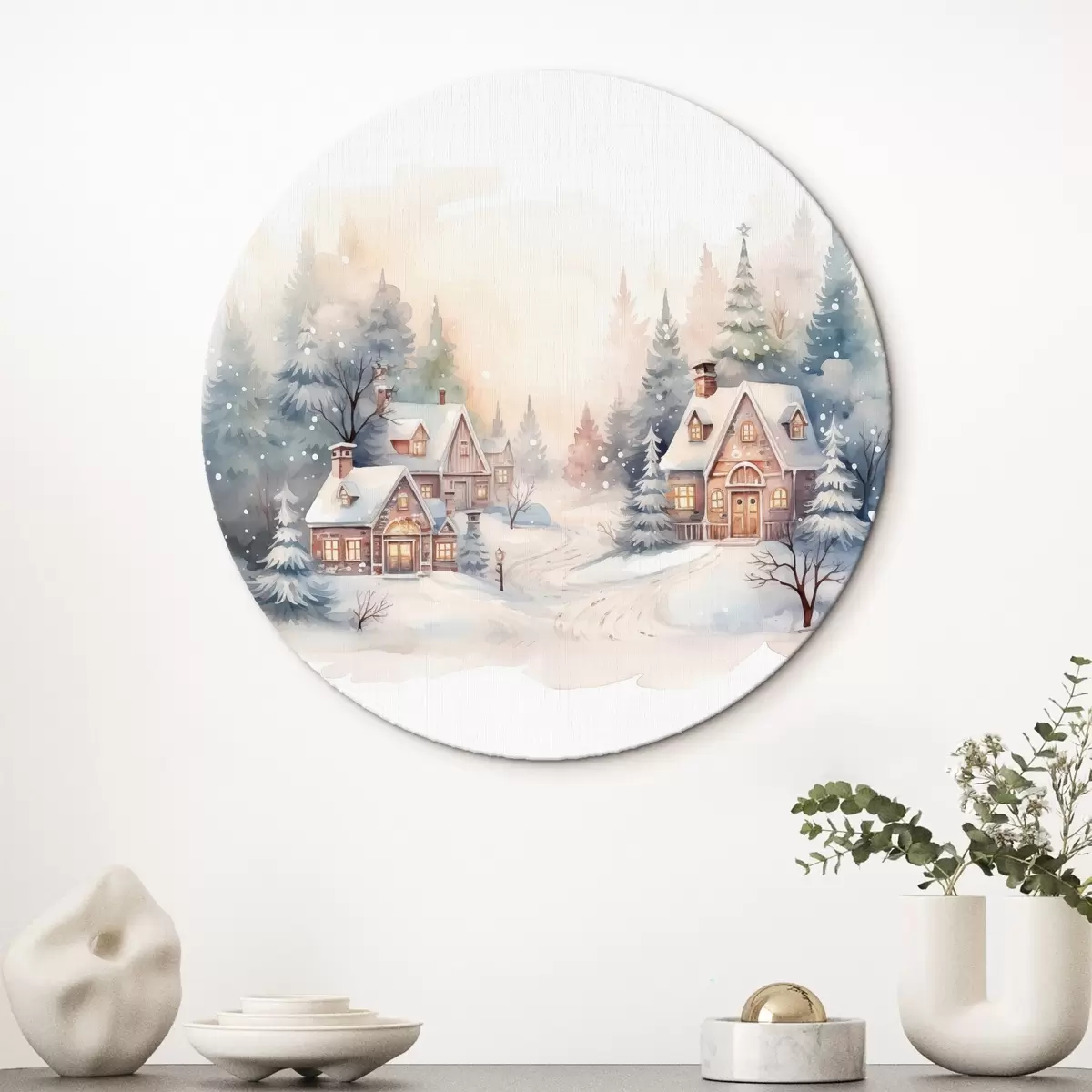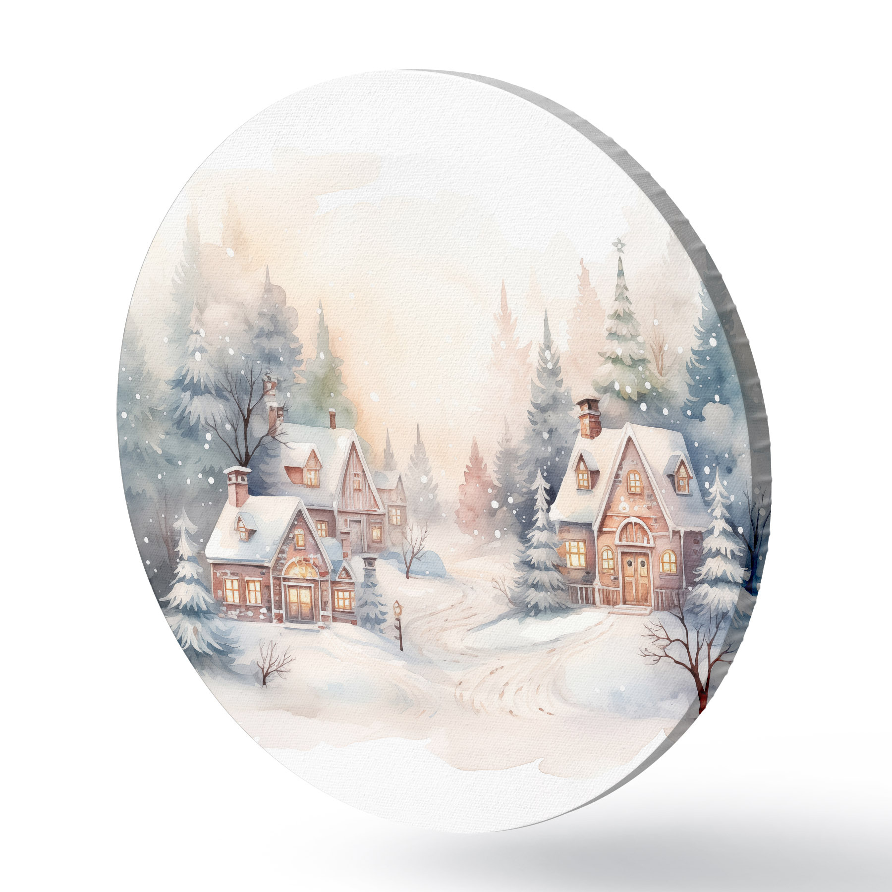 Tableaux ronds Paysage d'hiver, forêt de pins, belles maisons, aquarelle, susnet r41390