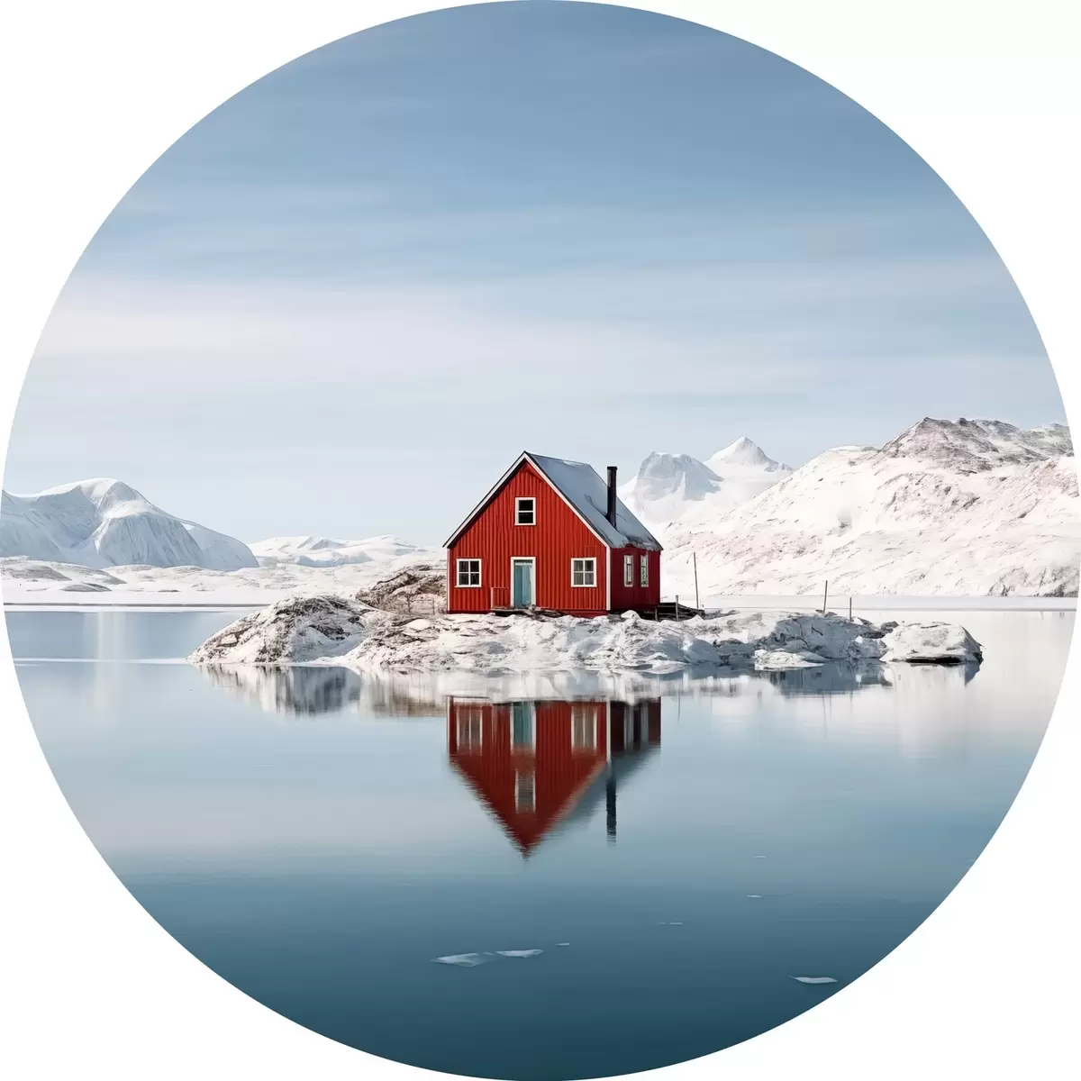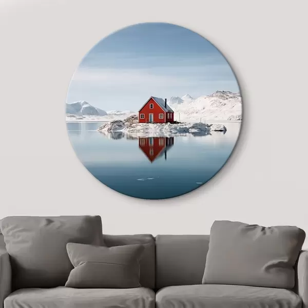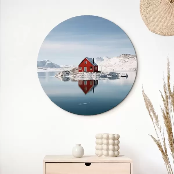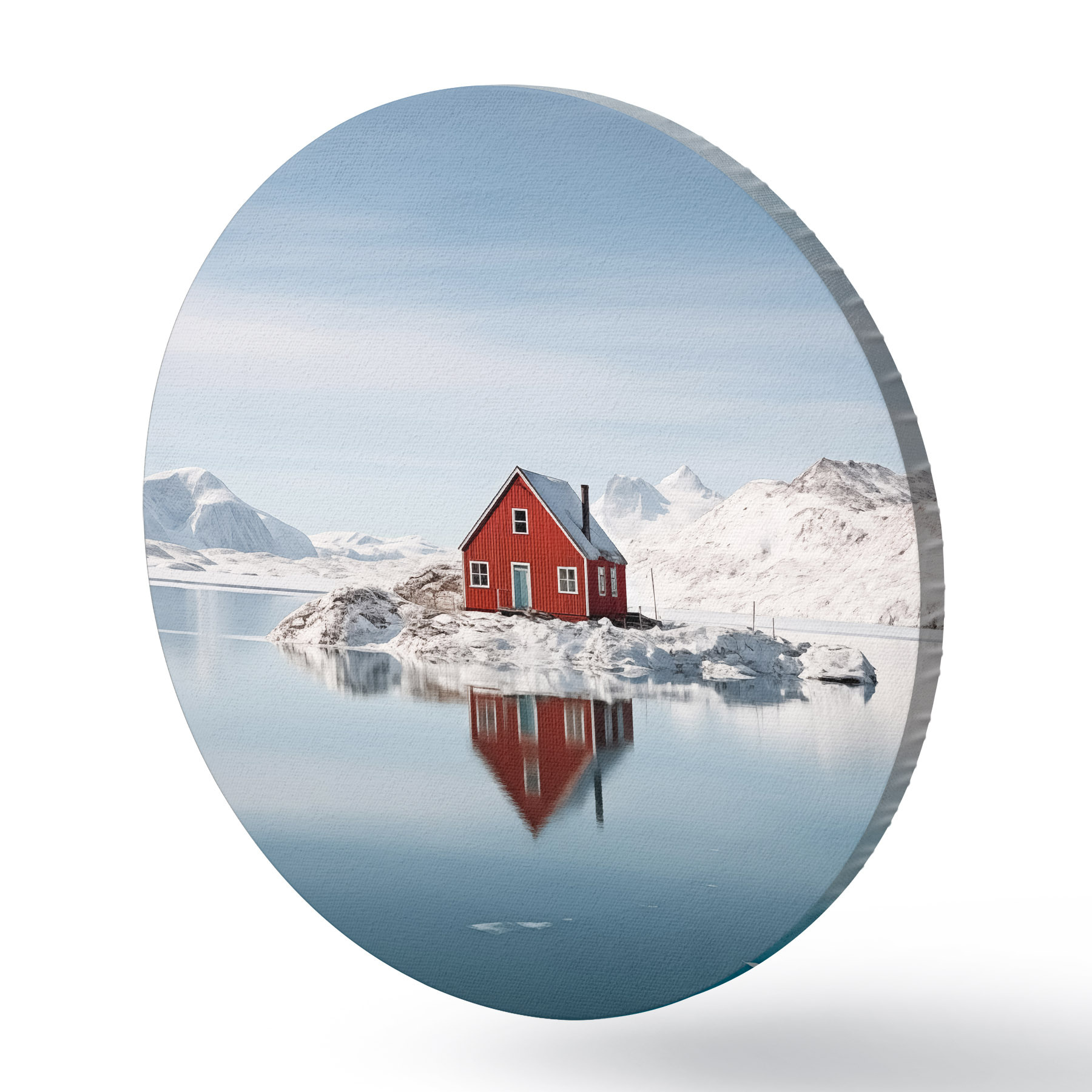 Tableaux ronds Paysage hivernal minimaliste maison rouge au bord du lac r41437
