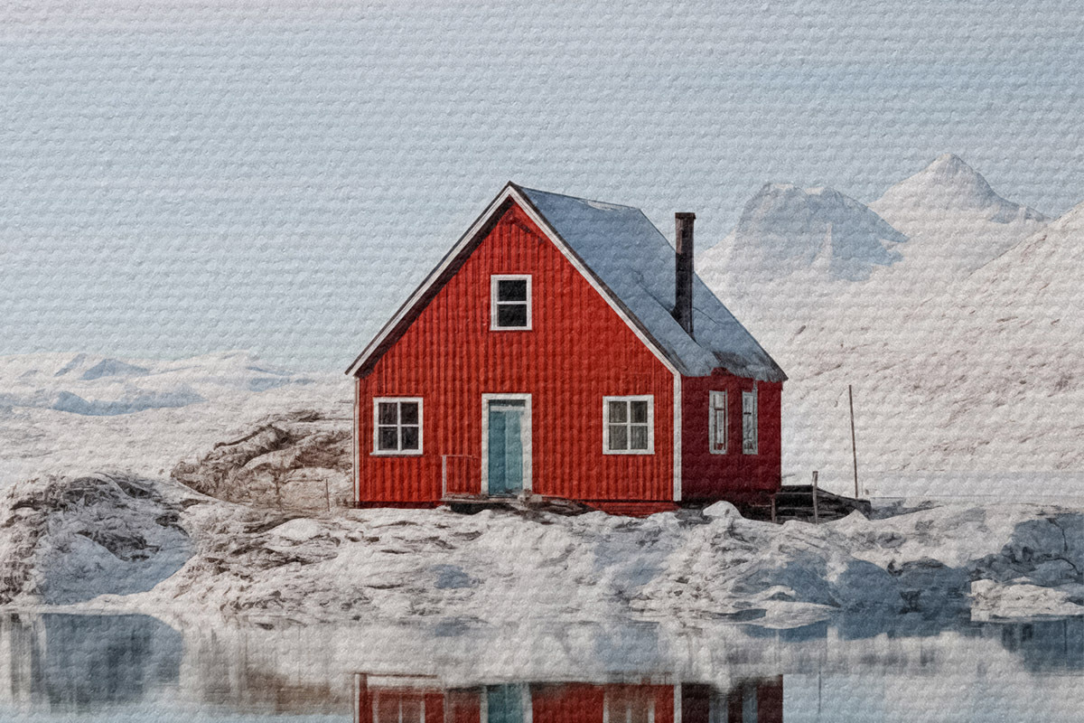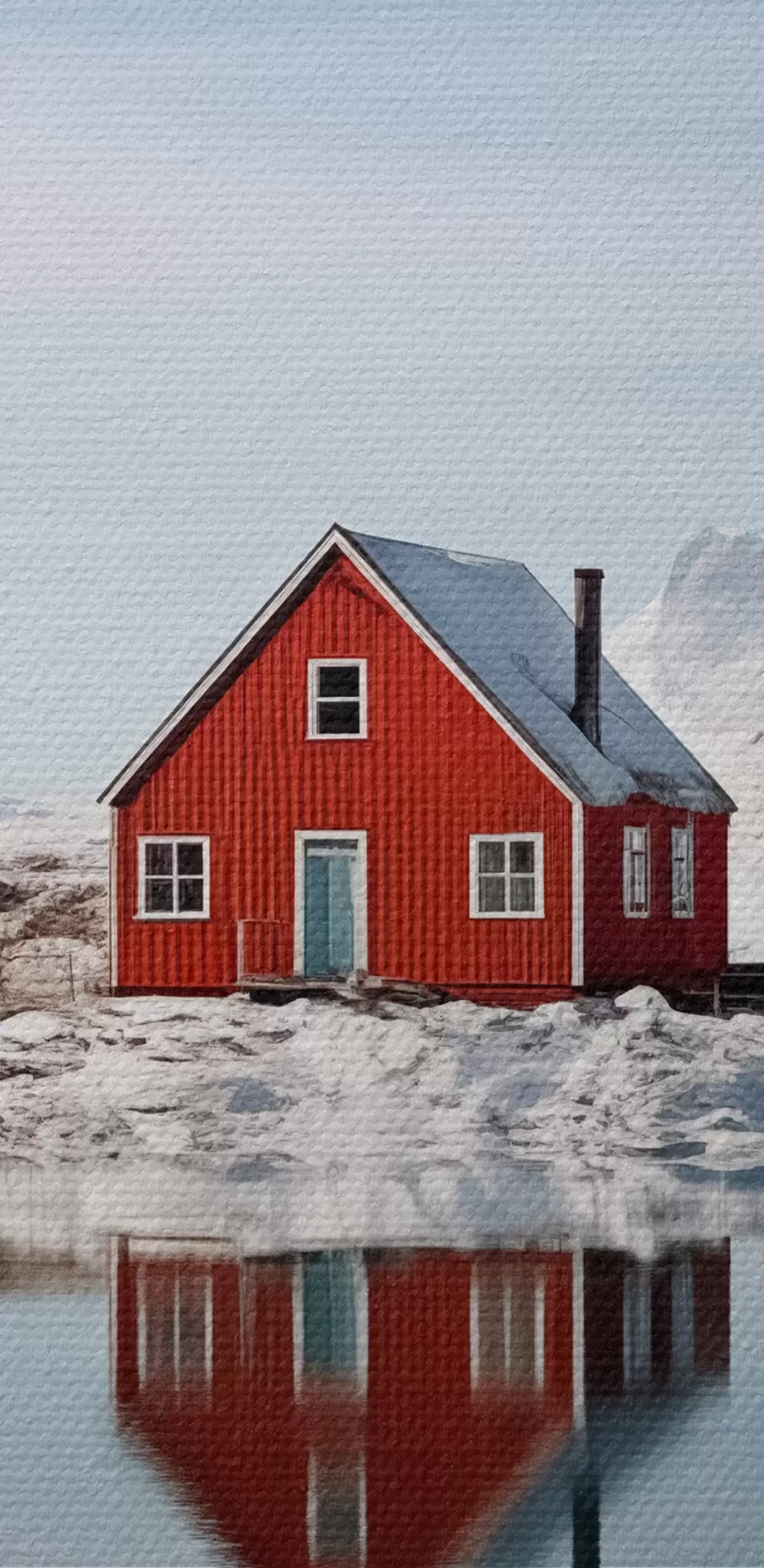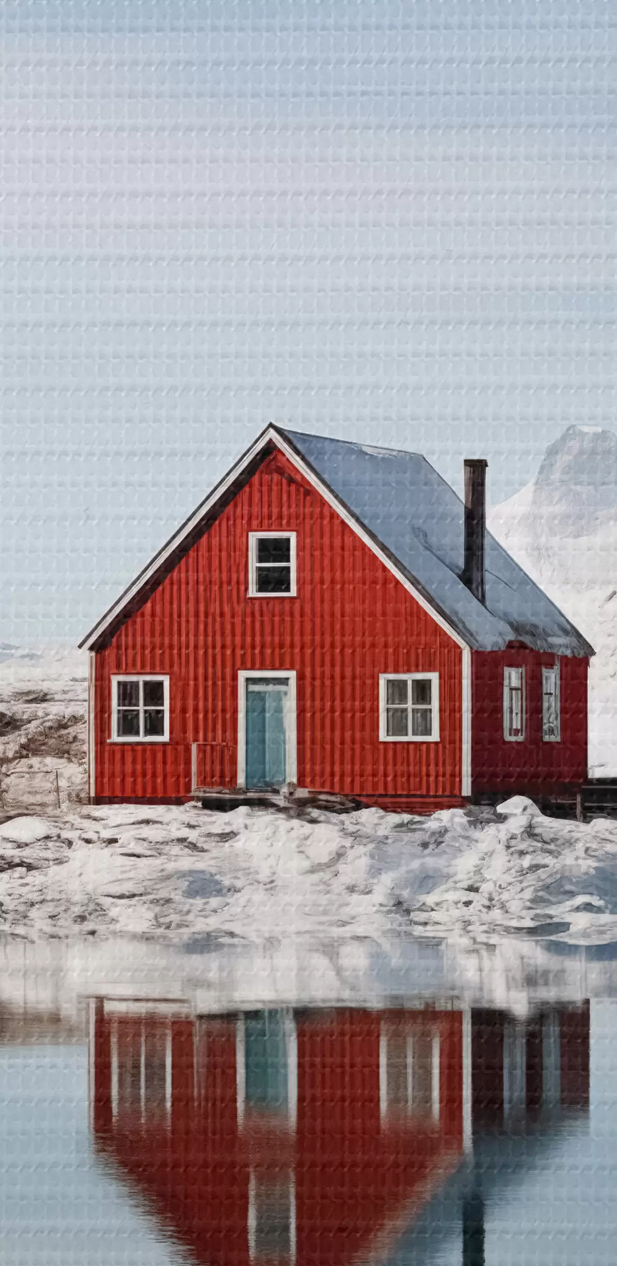 Image Paysage hivernal minimaliste maison rouge au bord du lac Nr r41437
