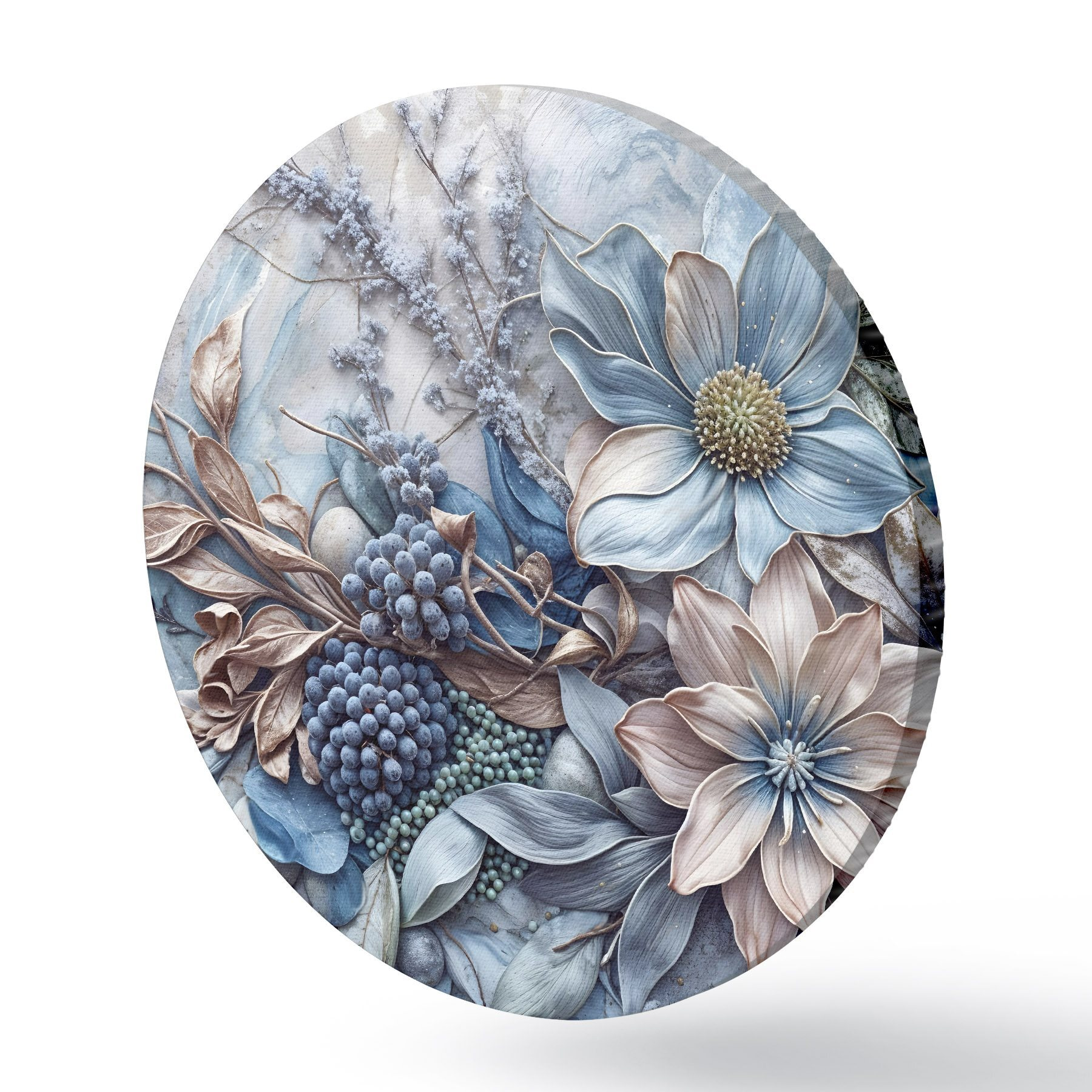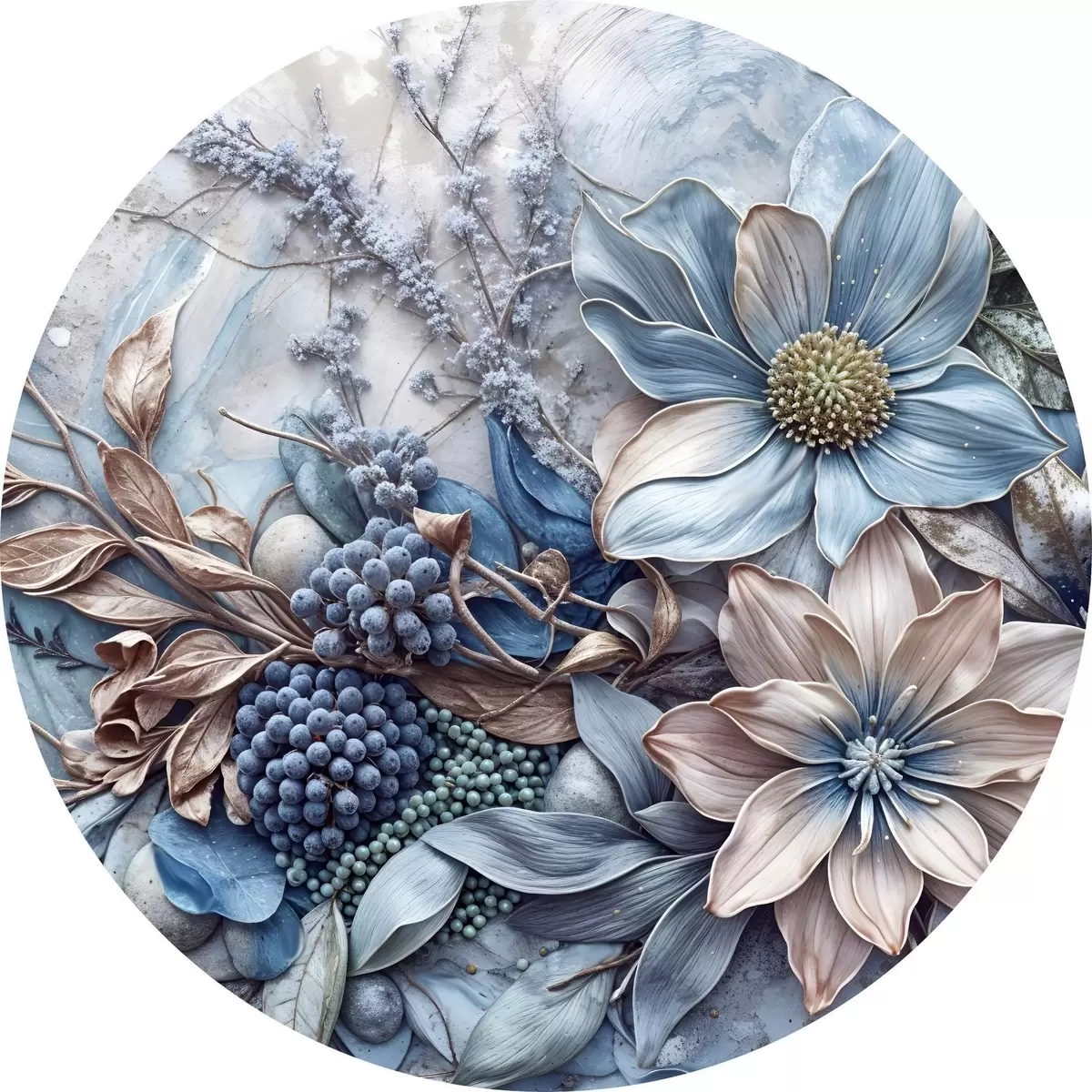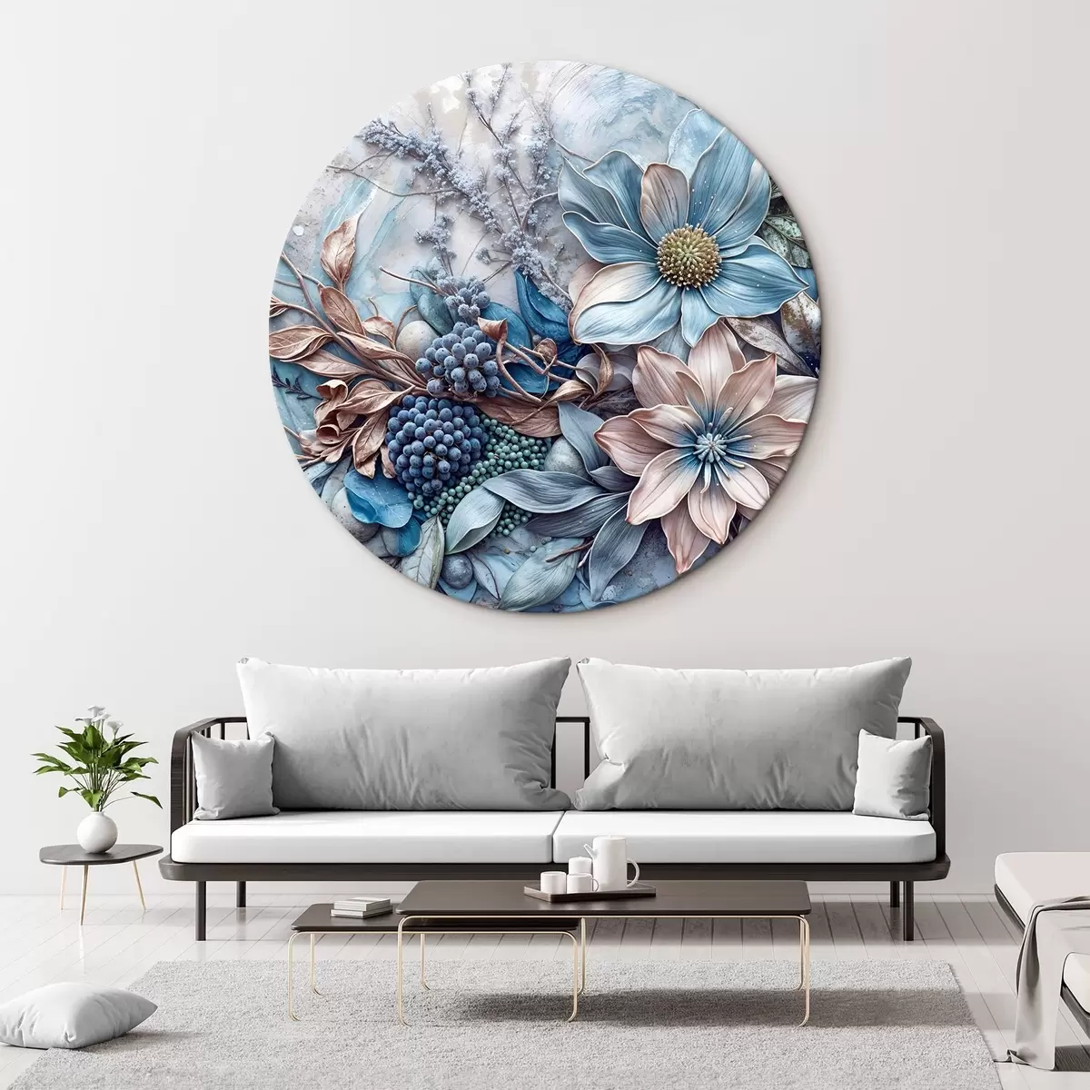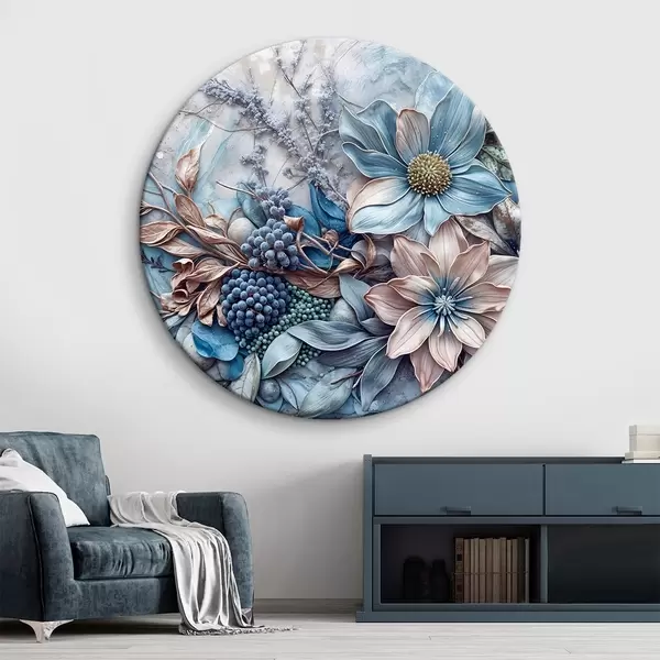 Tableaux ronds Une fleur luxuriante abstraite texturée et détaillée avec de grandes fleurs bleues et roses vibrantes, des baies et d'autres éléments botaniques r42210