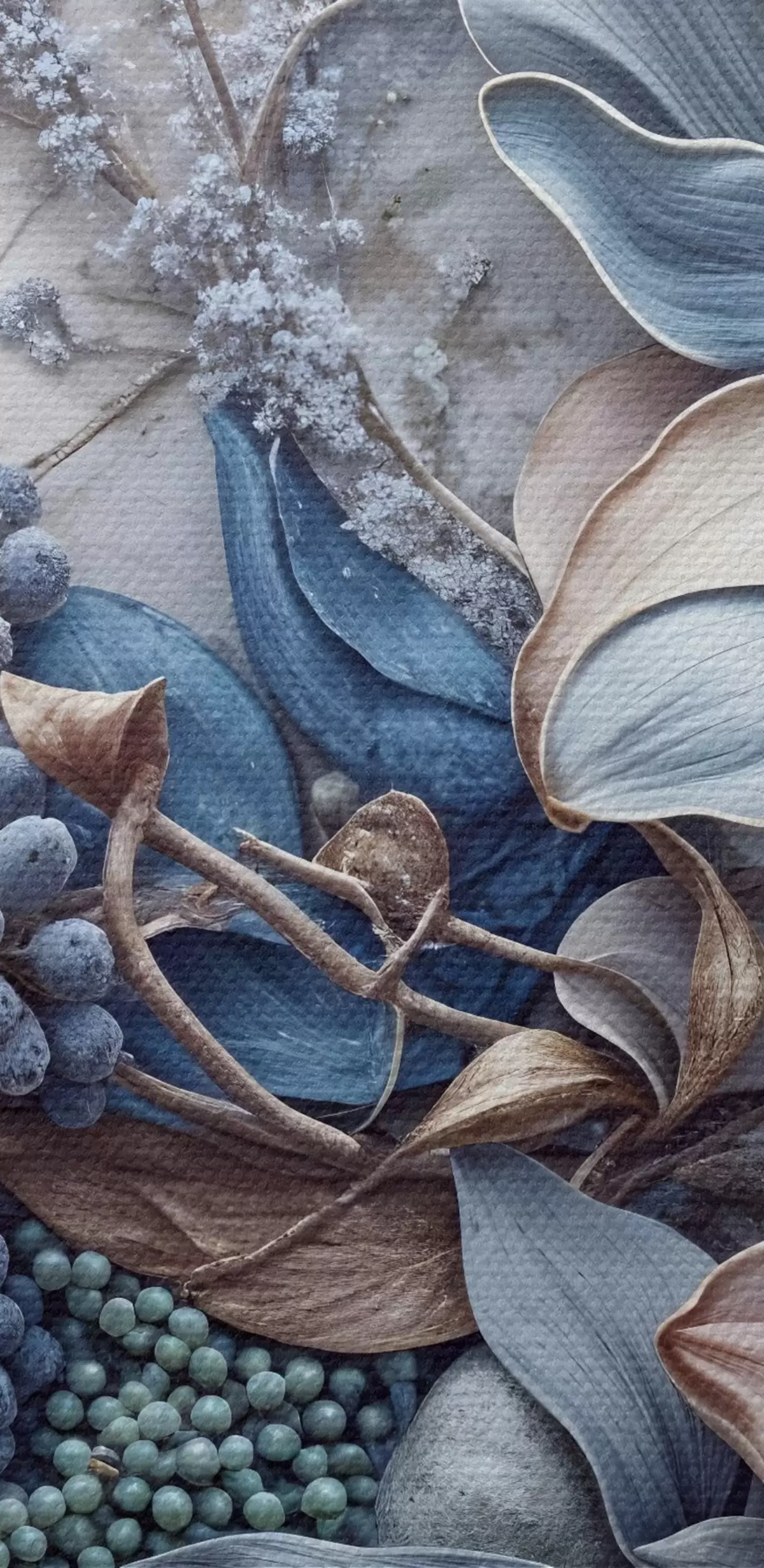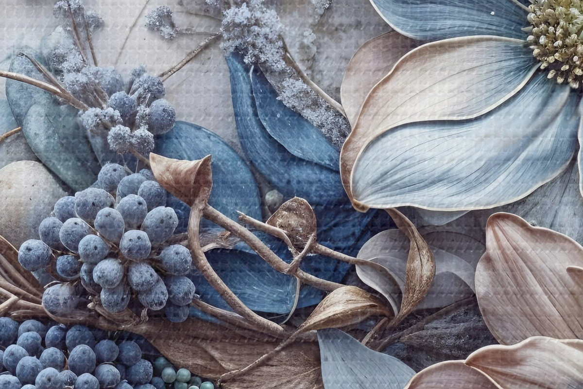 Image Une fleur luxuriante abstraite texturée et détaillée avec de grandes fleurs bleues et roses vibrantes, des baies et d'autres éléments botaniques Nr r42210