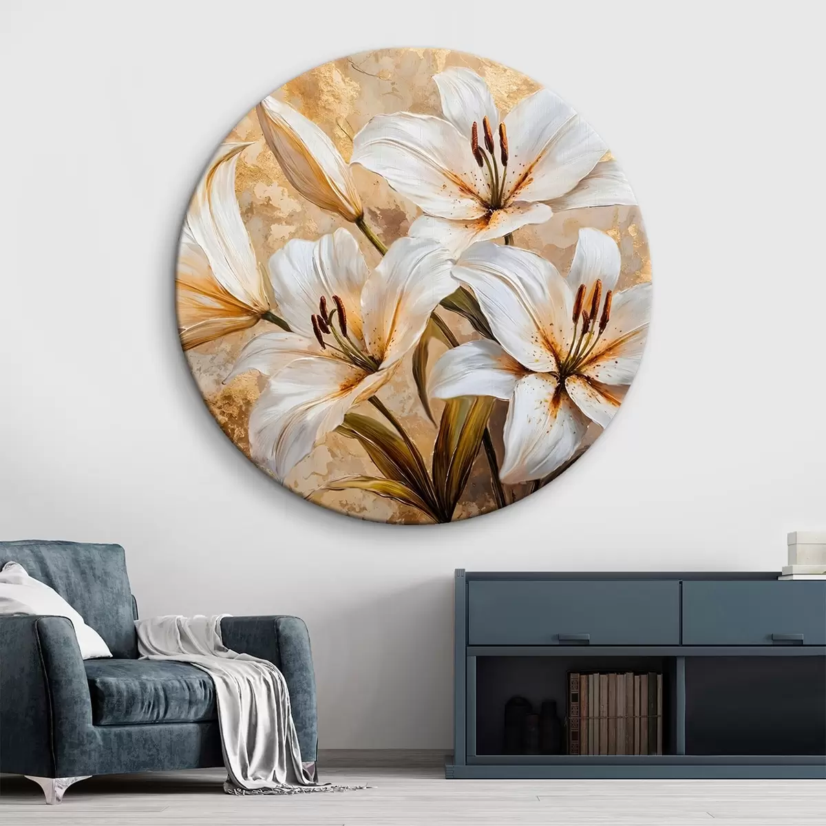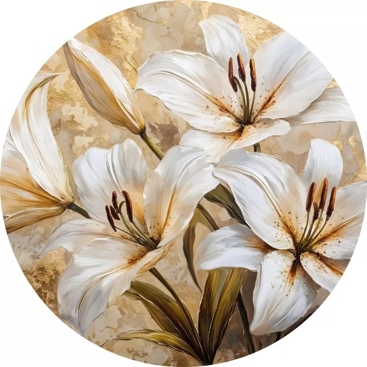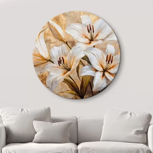 Tableaux ronds Lys blancs avec centre jaune sur fond beige texturé r42216