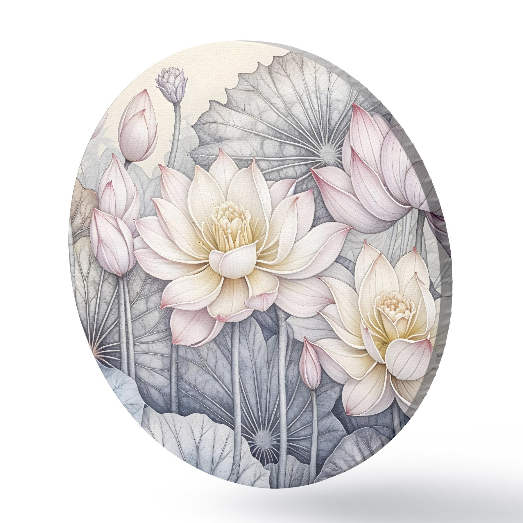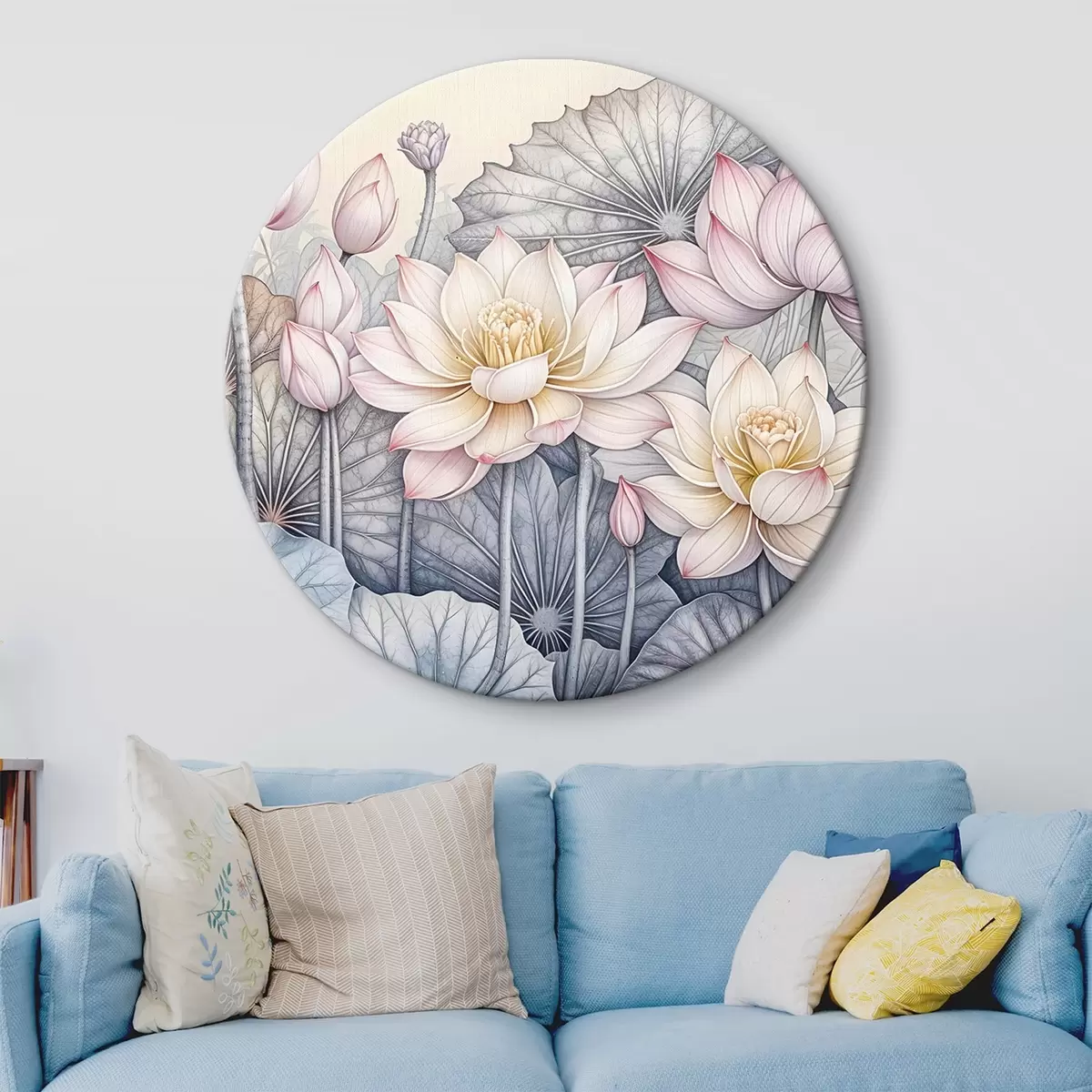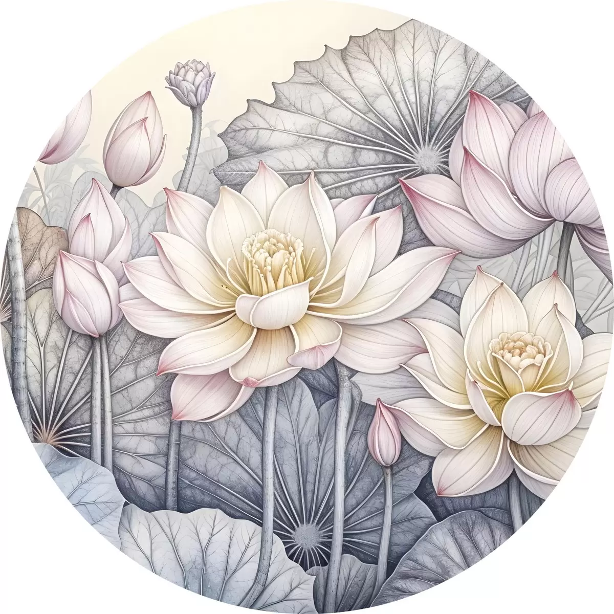 Tableaux ronds Grandes fleurs de lotus roses et blanches avec des feuilles et des tiges vertes sur un fond clair avec des pétales et des centres détaillés r42221