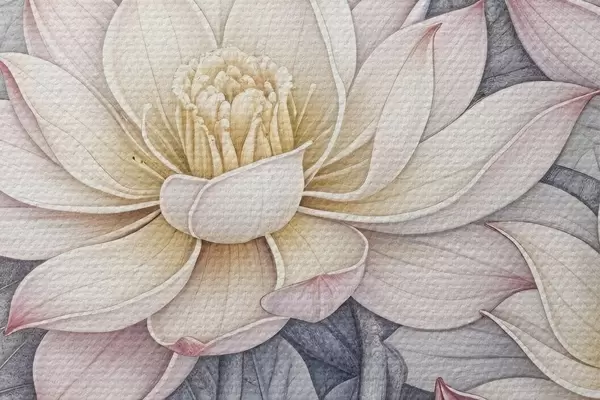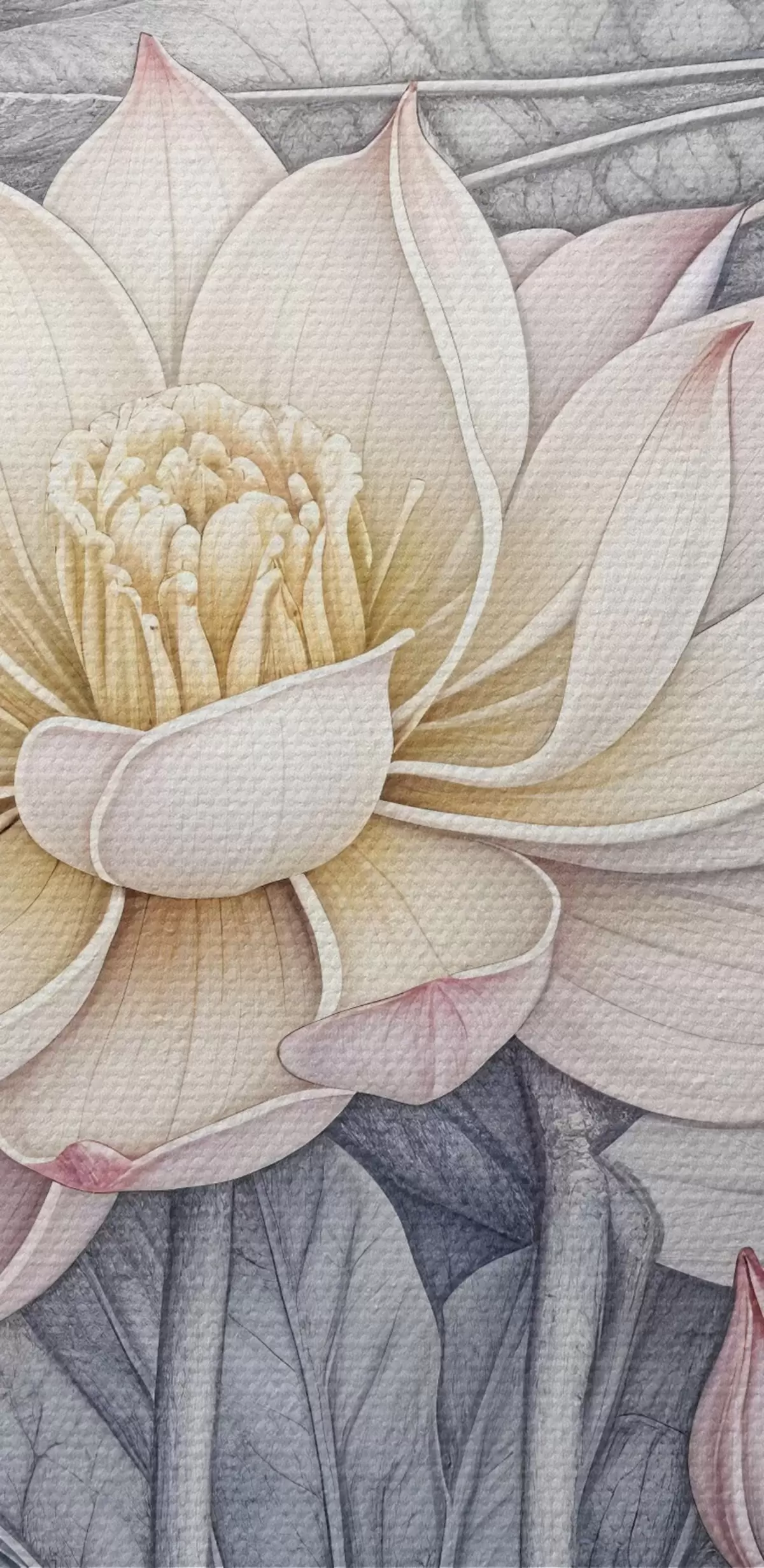 Image Grandes fleurs de lotus roses et blanches avec des feuilles et des tiges vertes sur un fond clair avec des pétales et des centres détaillés Nr r42221