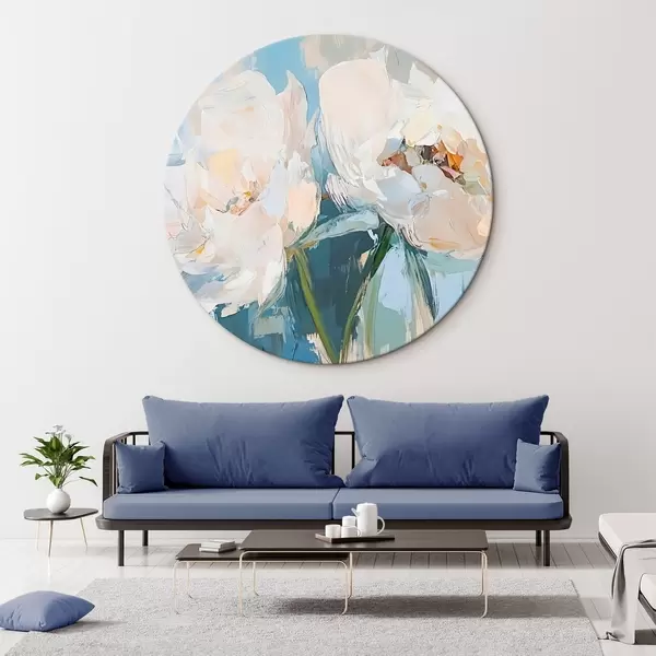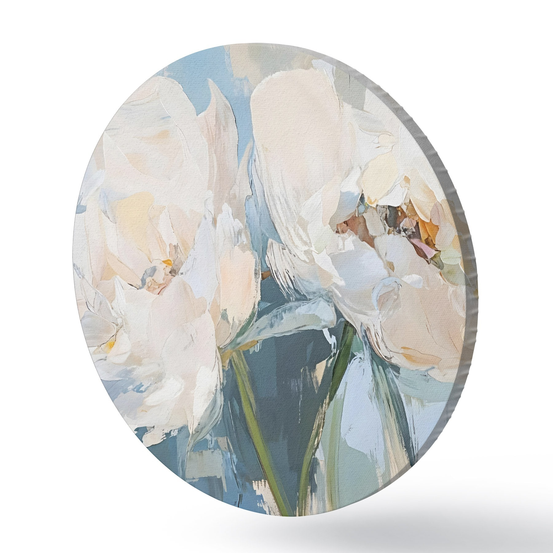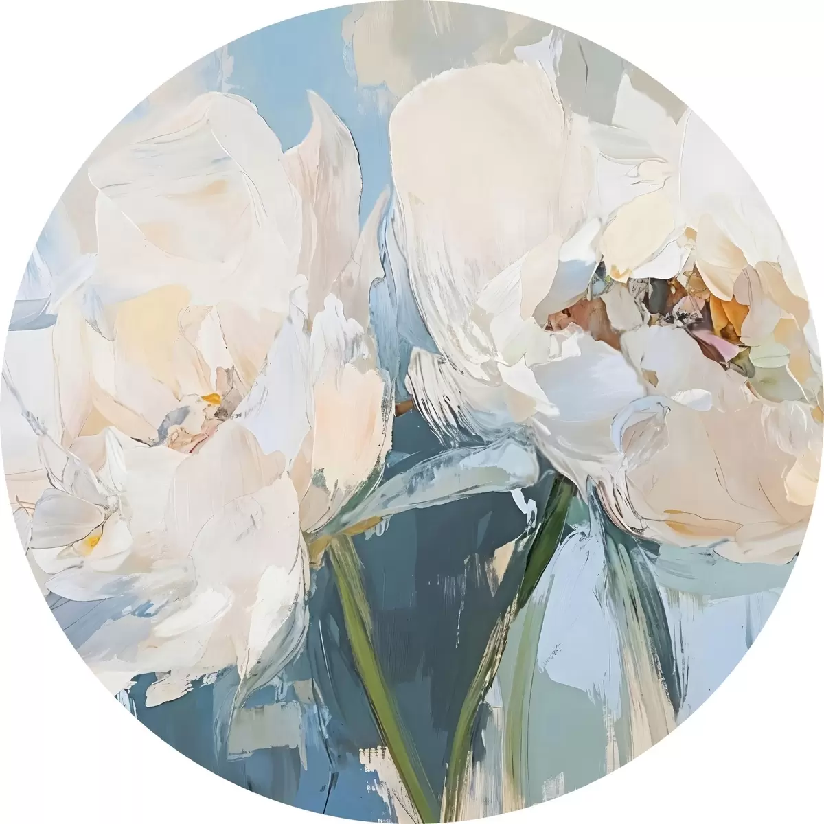 Tableaux ronds Peinture à l'huile abstraite minimaliste blanche imitant les pivoines sur un fond bleu doux r42226