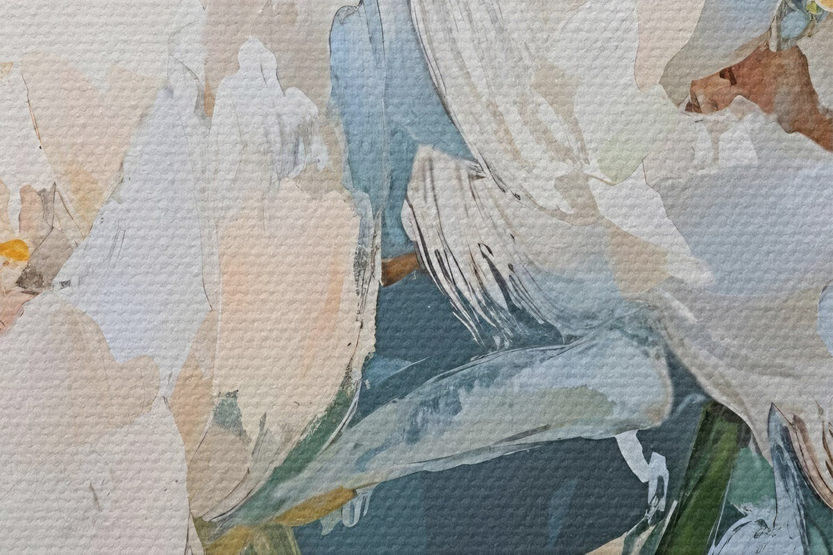 Image Peinture à l'huile abstraite minimaliste blanche imitant les pivoines sur un fond bleu doux Nr r42226