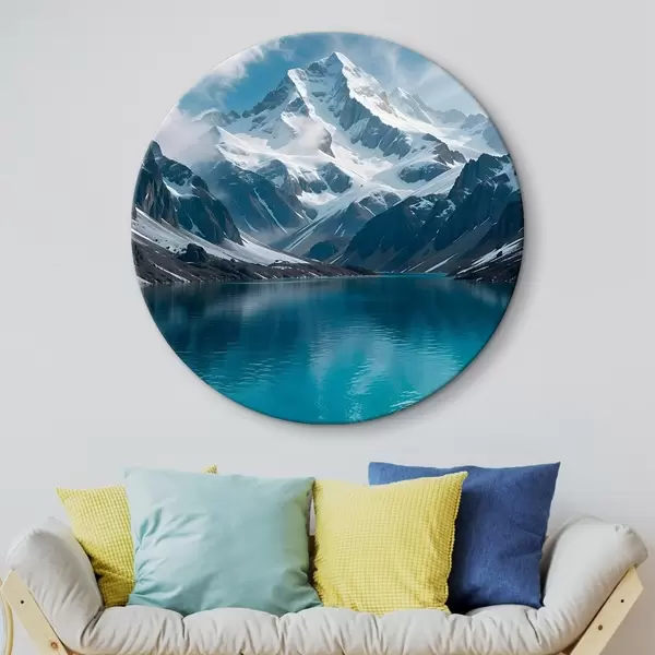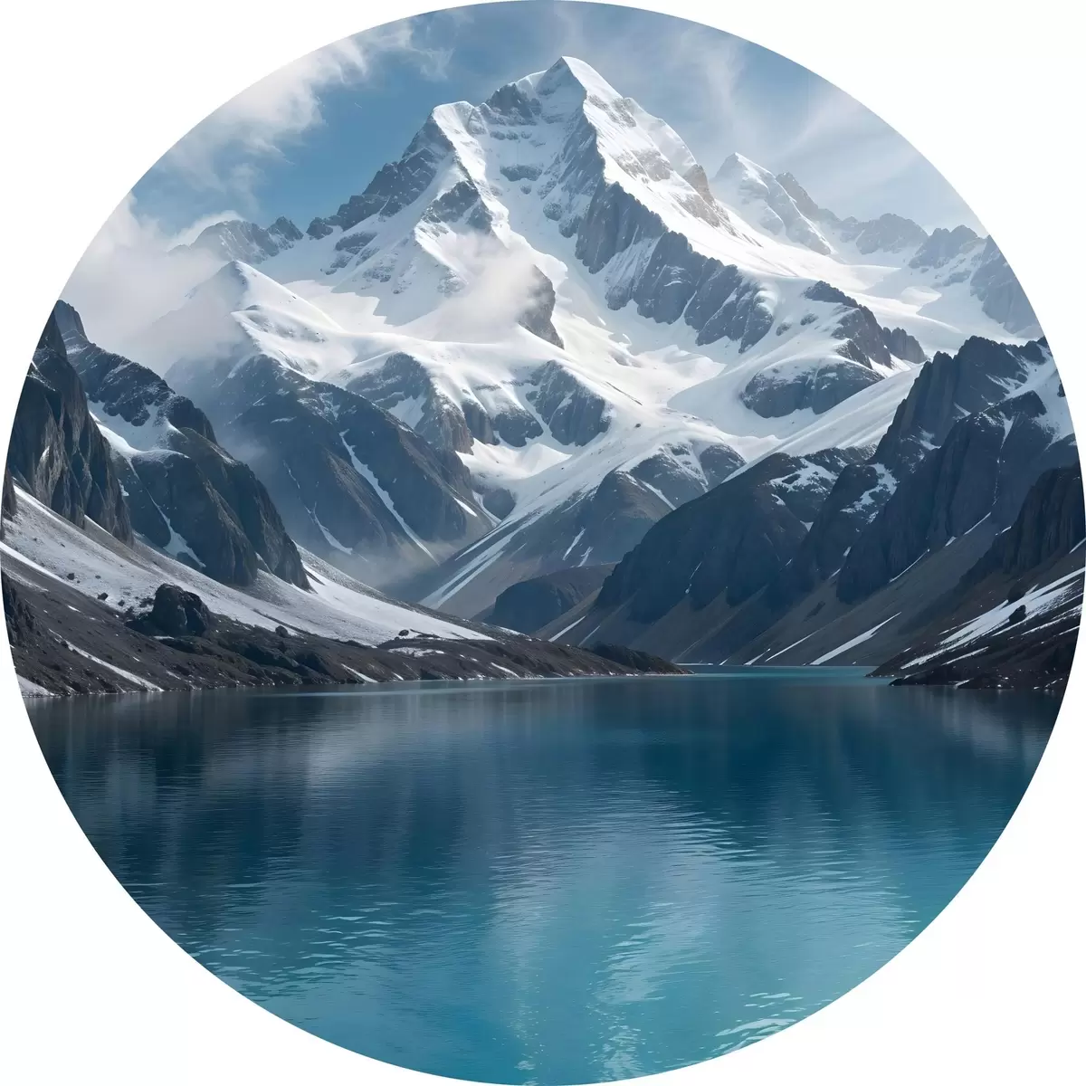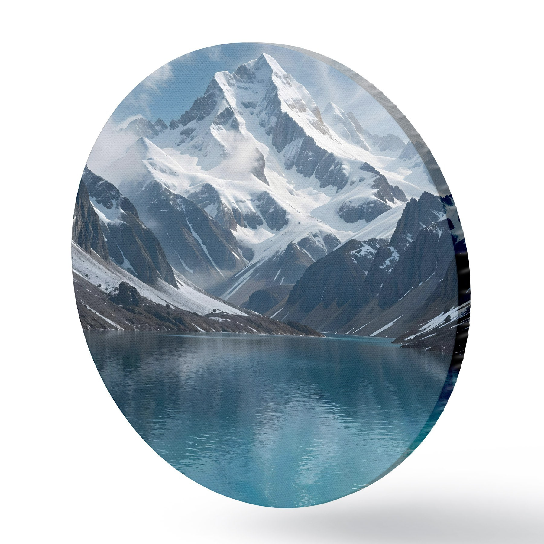Tableaux ronds Un pic montagneux enneigé se reflétant dans un lac turquoise serein, entouré d'un terrain rocheux et de nuages spectaculaires r42232