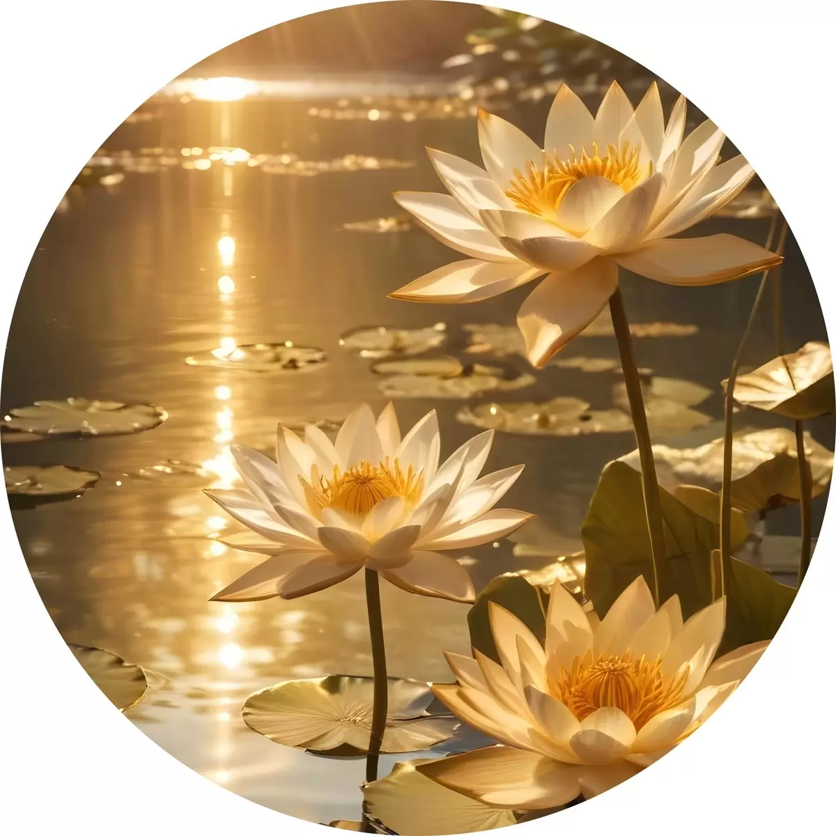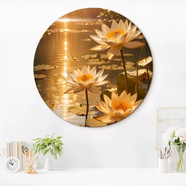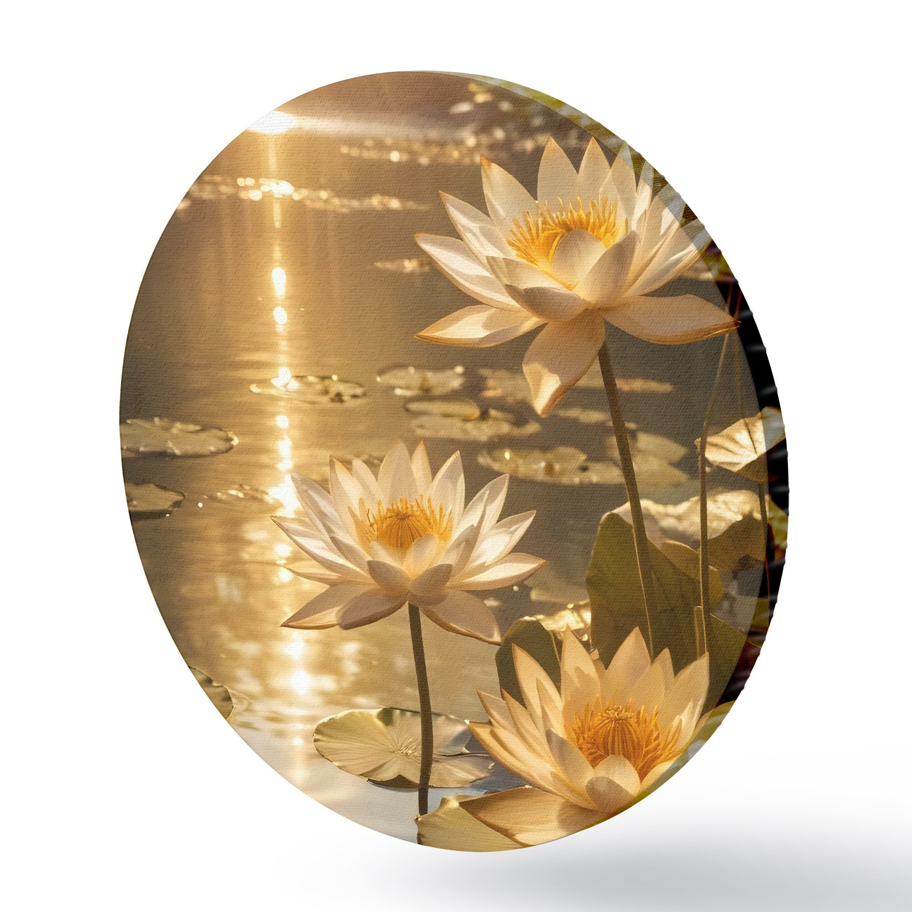 Tableaux ronds Fleurs de lotus blanches flottant sur un étang calme avec le soleil, créant une atmosphère sereine et tranquille r42239