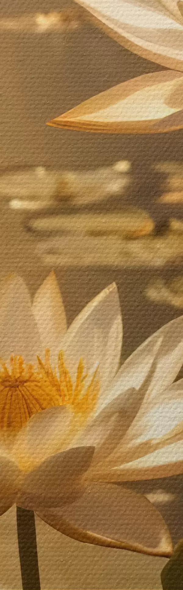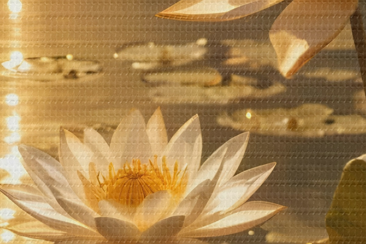 Image Fleurs de lotus blanches flottant sur un étang calme avec le soleil, créant une atmosphère sereine et tranquille Nr r42239