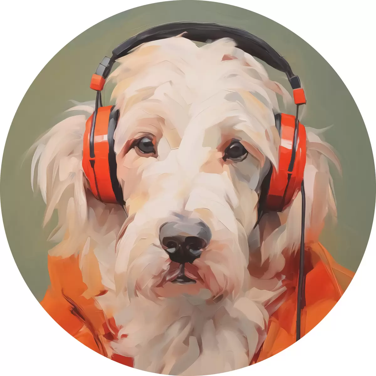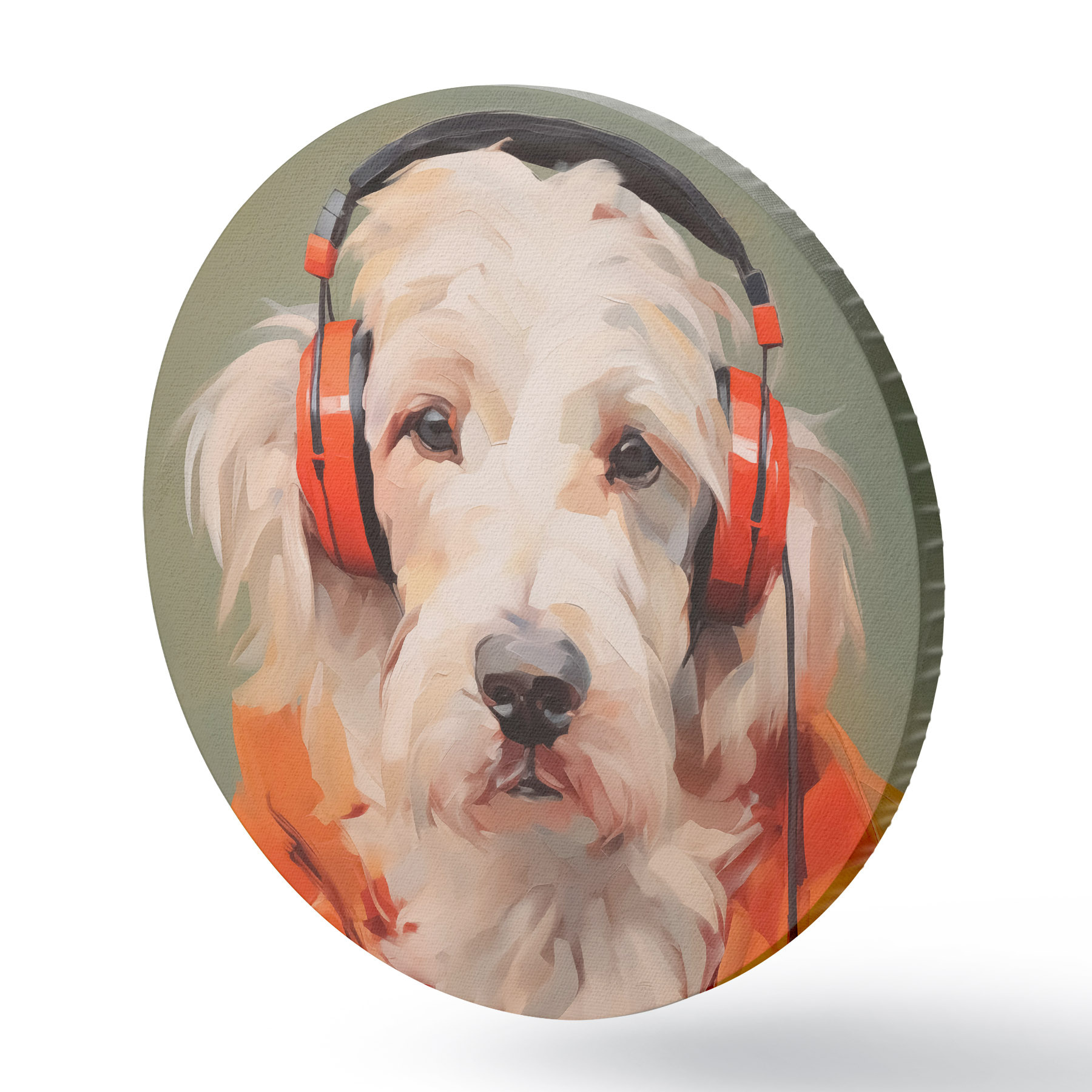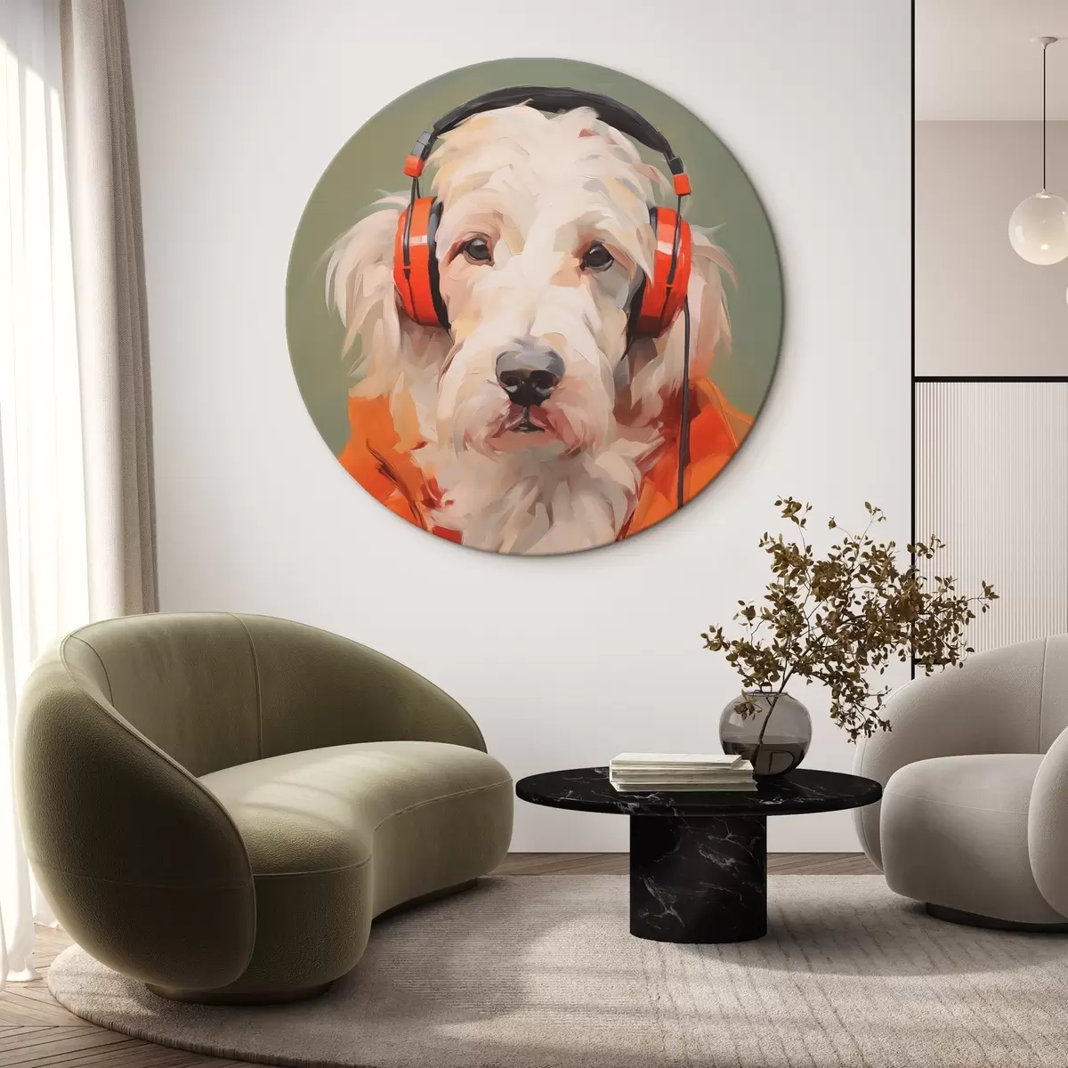 Tableaux ronds Chien blanc avec veste orange et casque imitation peinture r42364