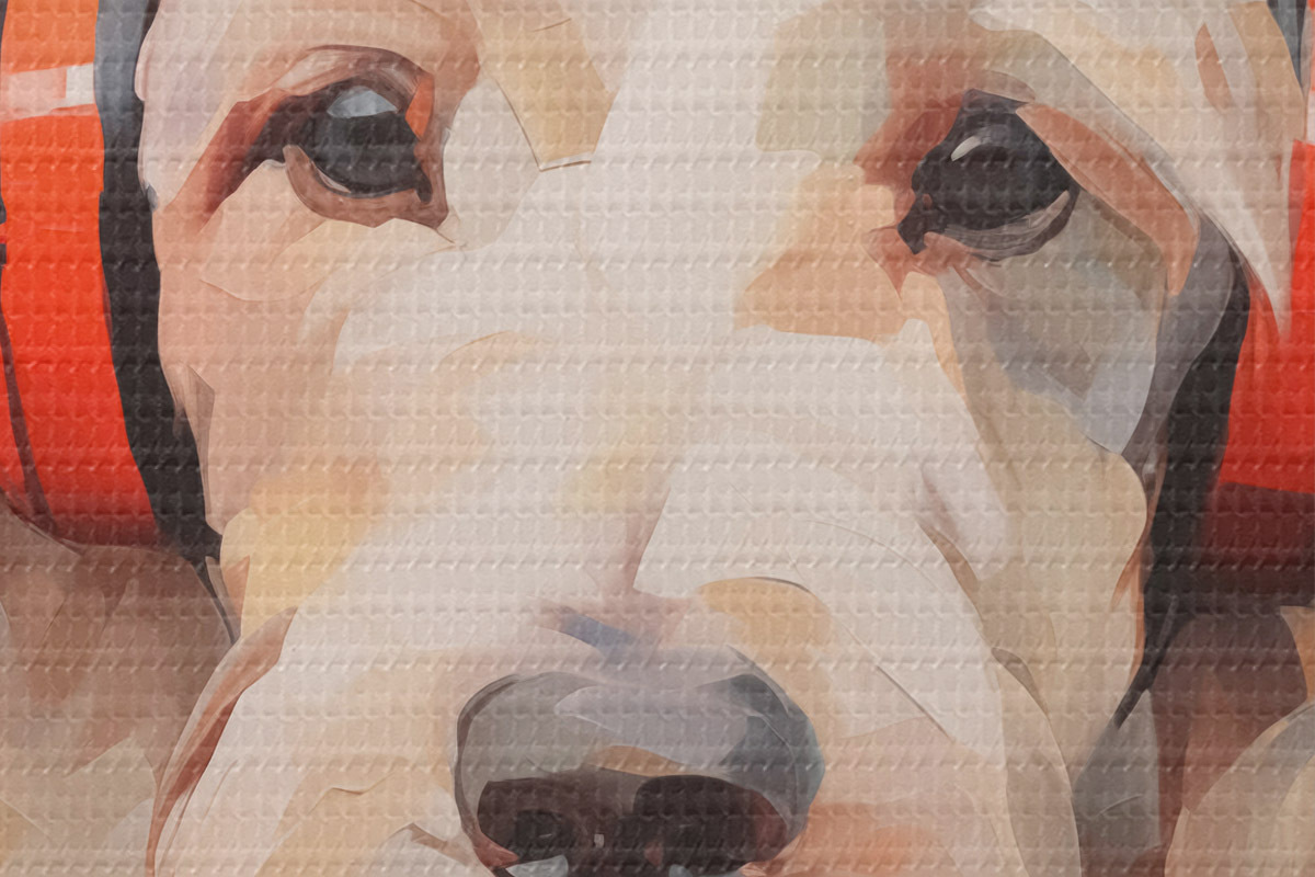 Image Chien blanc avec veste orange et casque imitation peinture Nr r42364